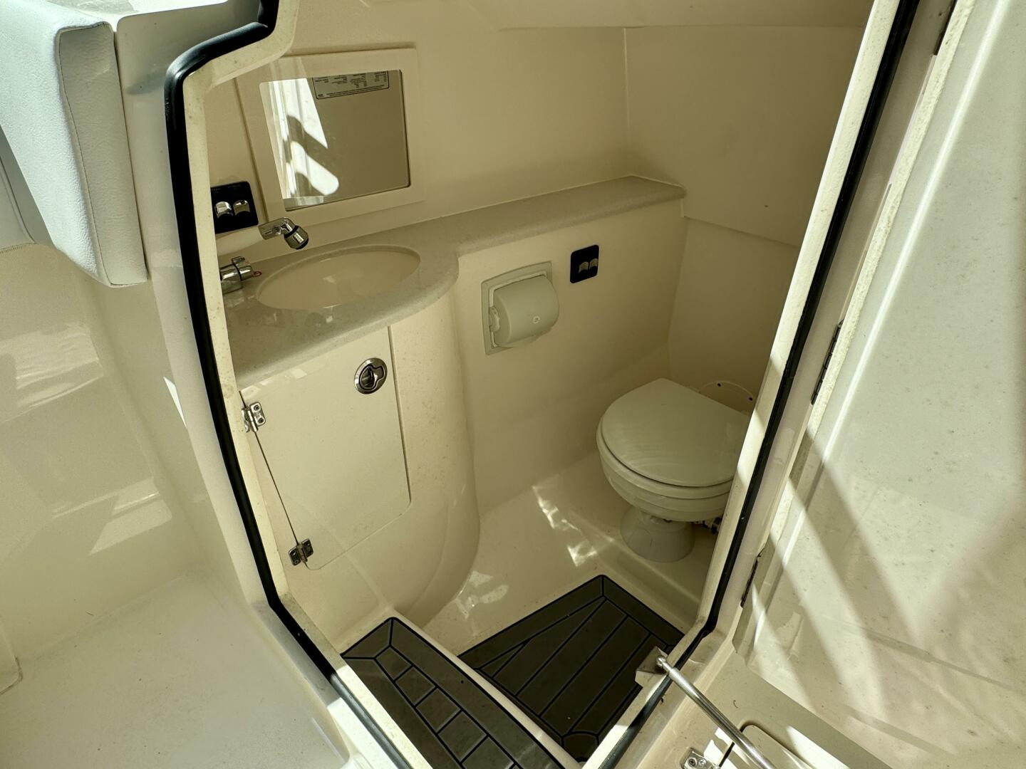 Just forward of the port side lounge seat you'll find the walk-down head compartment that's finished with corian countertops, a sink, mirror, lighted storage, an electric head with waste holding tank and dockside pumpout.