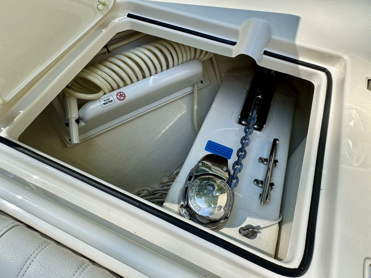 Moving to the bow area, you'll pass access for two large storage compartments - one large in-floor storage that houses one of the two removable lounge tables, the other is under/forward of the driver's helm on the starboard side - this compartment houses the other removable lounge table and the hardware for each (when they're not in use) - while the bow table also lowers to accommodate filler cushions to create a large sun lounge with integrated arm rests in the roomy bow seating. A removable bow seat is all the way forward and with the cushion removed makes for easy entry or exit from the bow when using the hideaway bow boarding ladder that's found adjacent to the windlass hatch where you'll also find a handheld shower. Both bow lounge seats also feature lockable storage underneath.