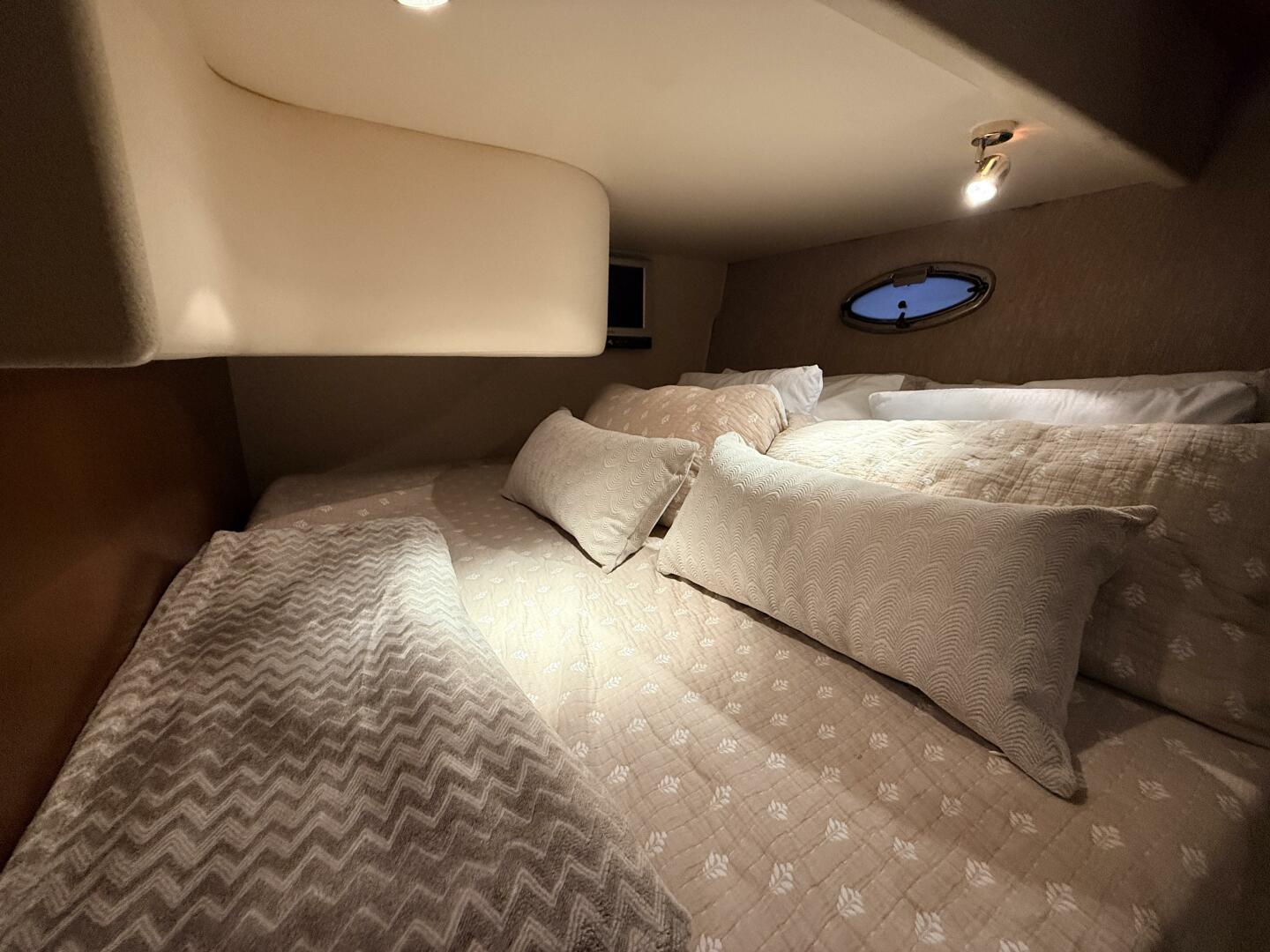 Guests will be surprised by the 38 Sport Bridge’s spaciousness as they enter through the stylishly curved door into a luxurious cherry-accented salon. This bright and airy space with 6'6" ceilings and large opening and screened windows is much larger than expected due to the 14’4” beam and unique design. To starboard is an electric convertible Ultraleather sofa, with 2 matching foot rests, that provides comfortable seating to enjoy the large salon TV (new) with Bose sound system and converts to a double bed when extra guests overnight. To port is the raised settee and high-gloss table. The open concept galley has everything needed for preparing great meals and is considerate of the chef that wants to still be part of the action.