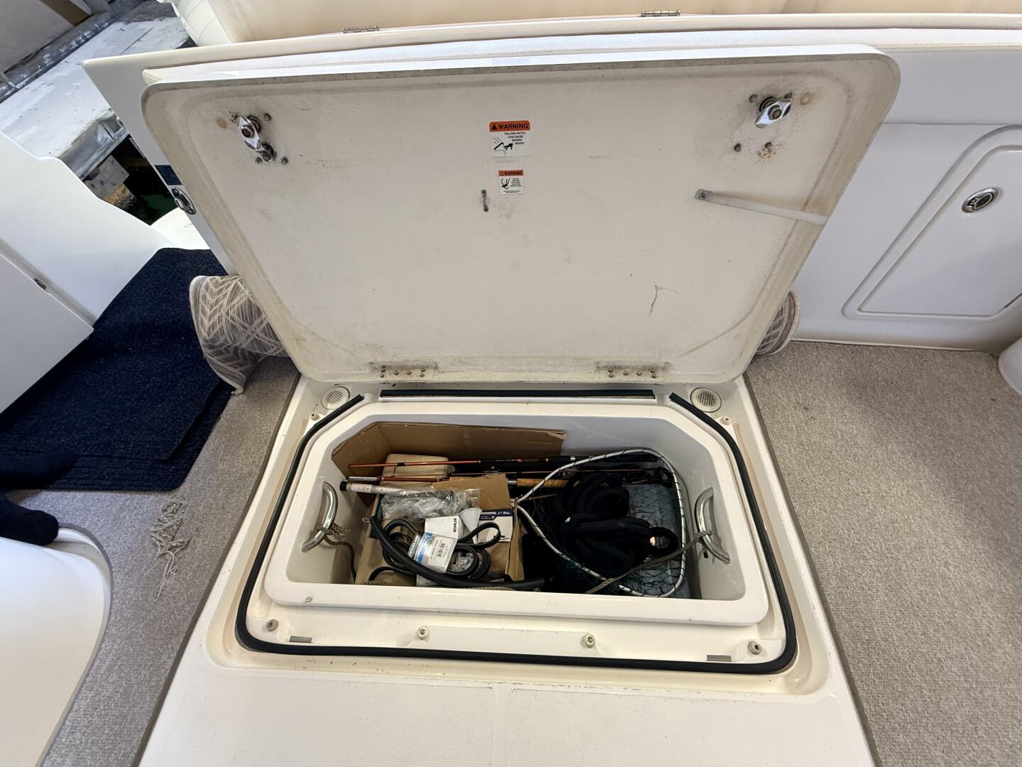 Stepping aboard from the swimgrid you enter a large fully enclosed cockpit. Here is the first of 3 new fridges to keep your beverages cold. Opening the cockpit hatch there is a large storage insert in the floor to keep your gear tidy and when it is lifted out there is great access to the lazarette which has the generator and ample storage space.