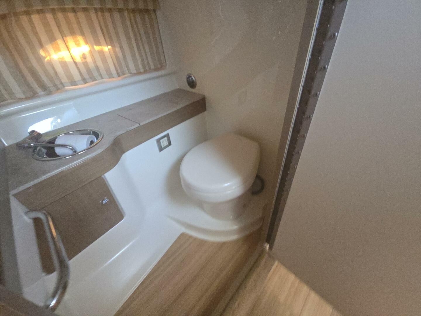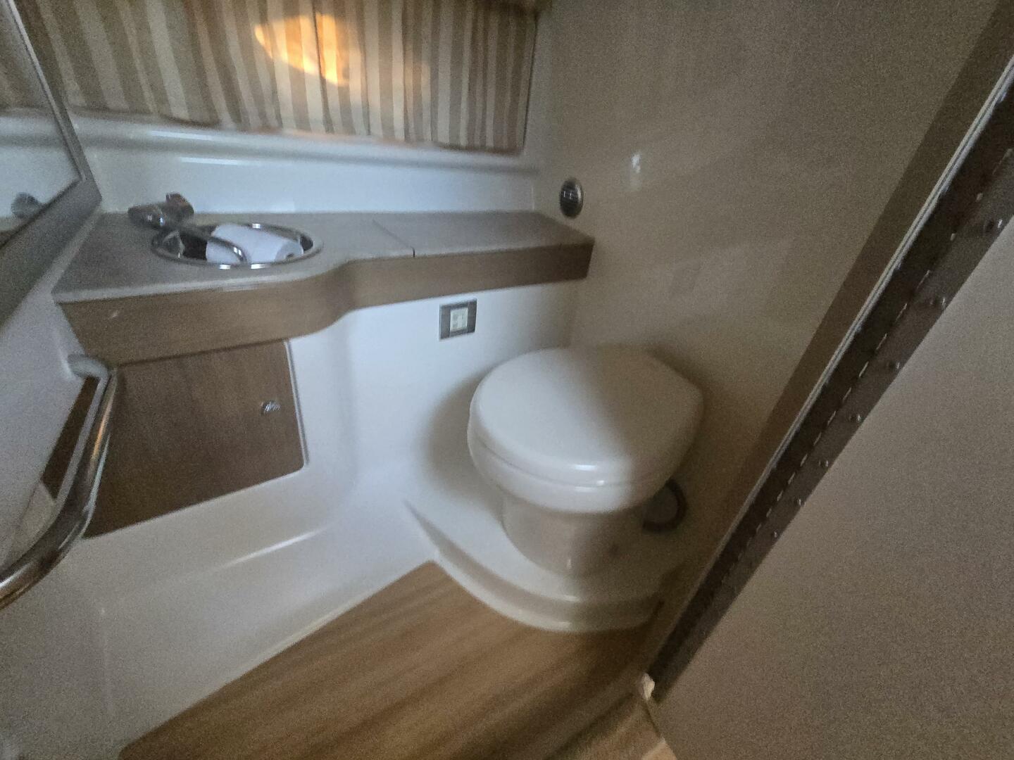 - Molded head compartment w/Vacuflush head unit, 36-gallon holding tank & dockside pumpout, molded vanity, stainless steel sink w/faucet, brushed frame mirror, Corian countertop & Light Cherry or Ash woodgrain-finish flooring