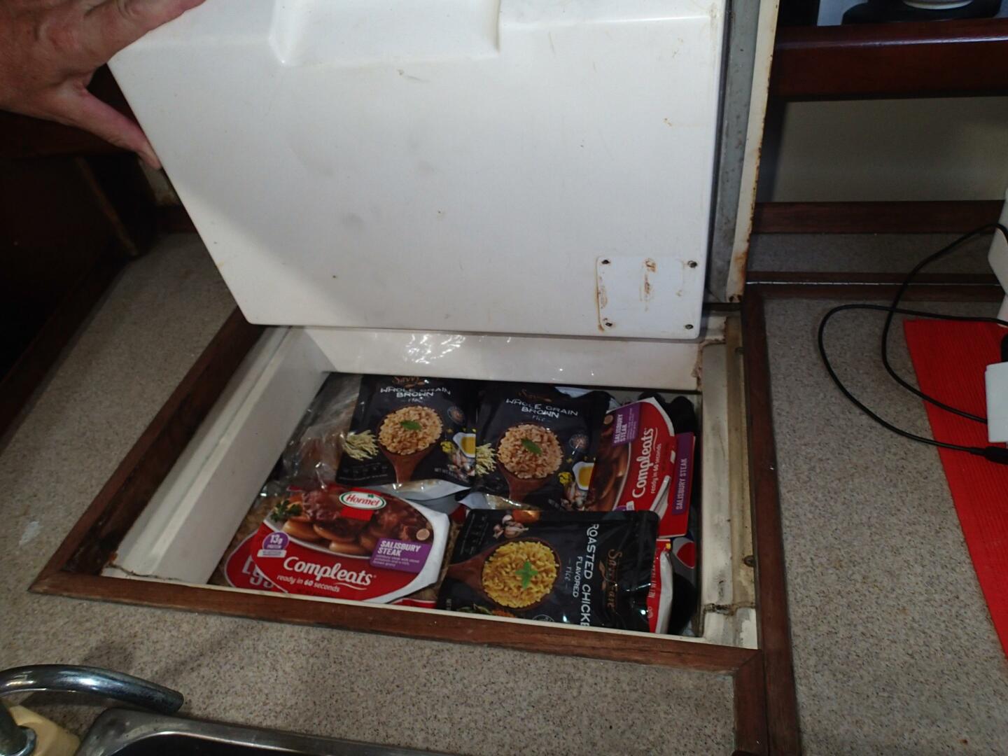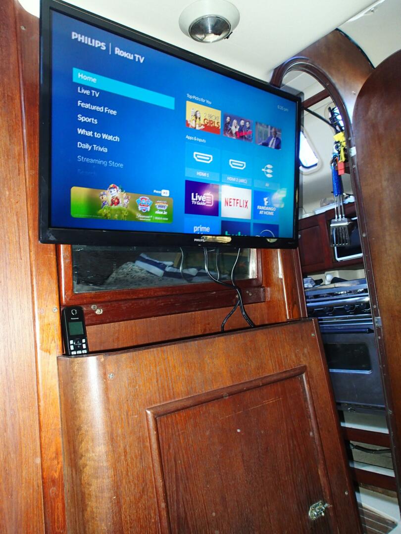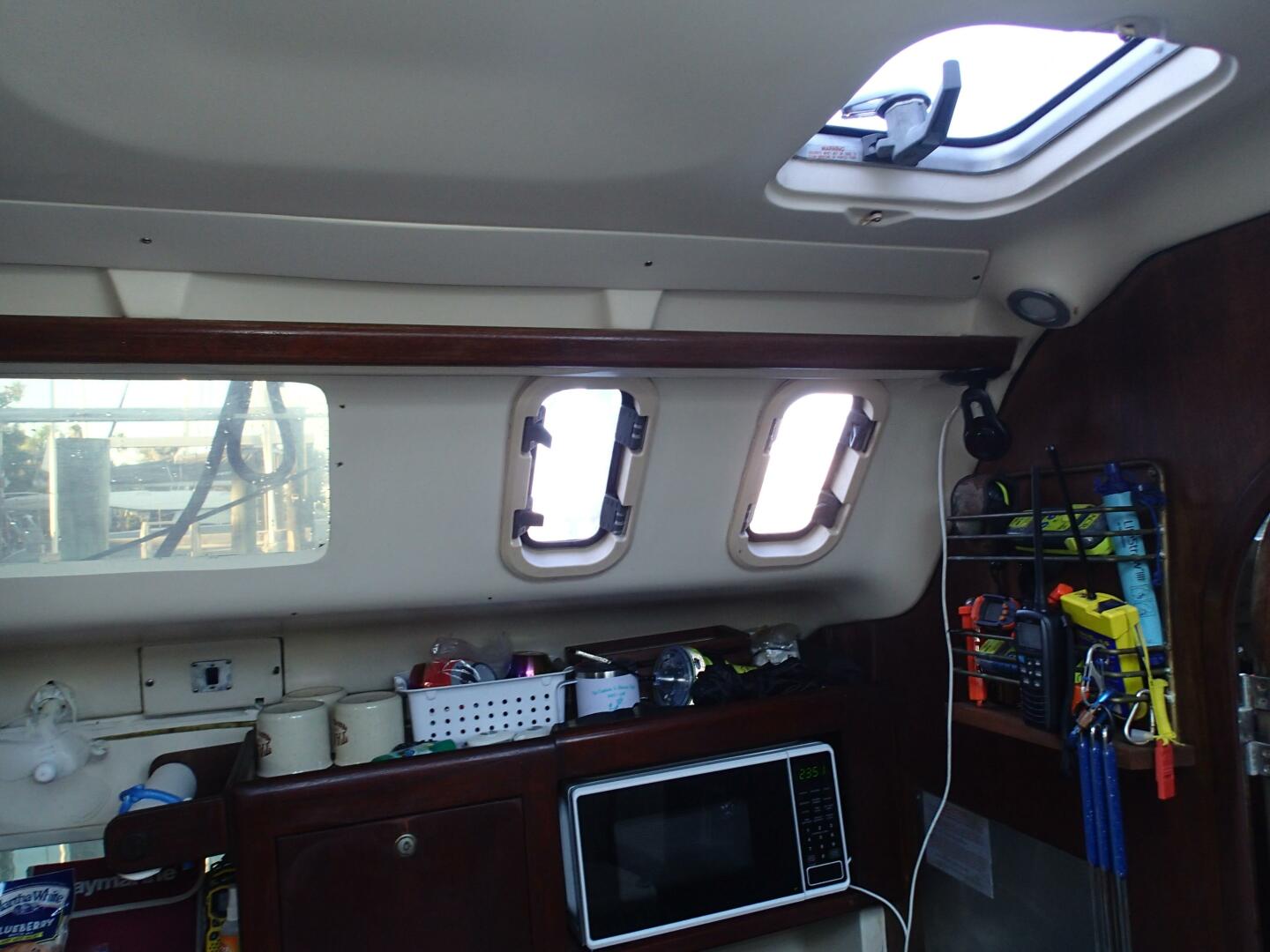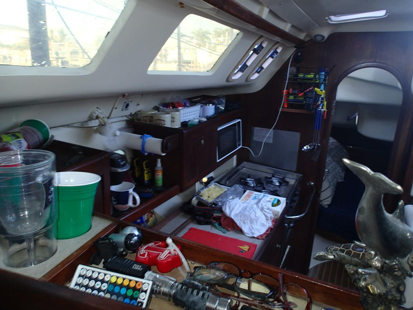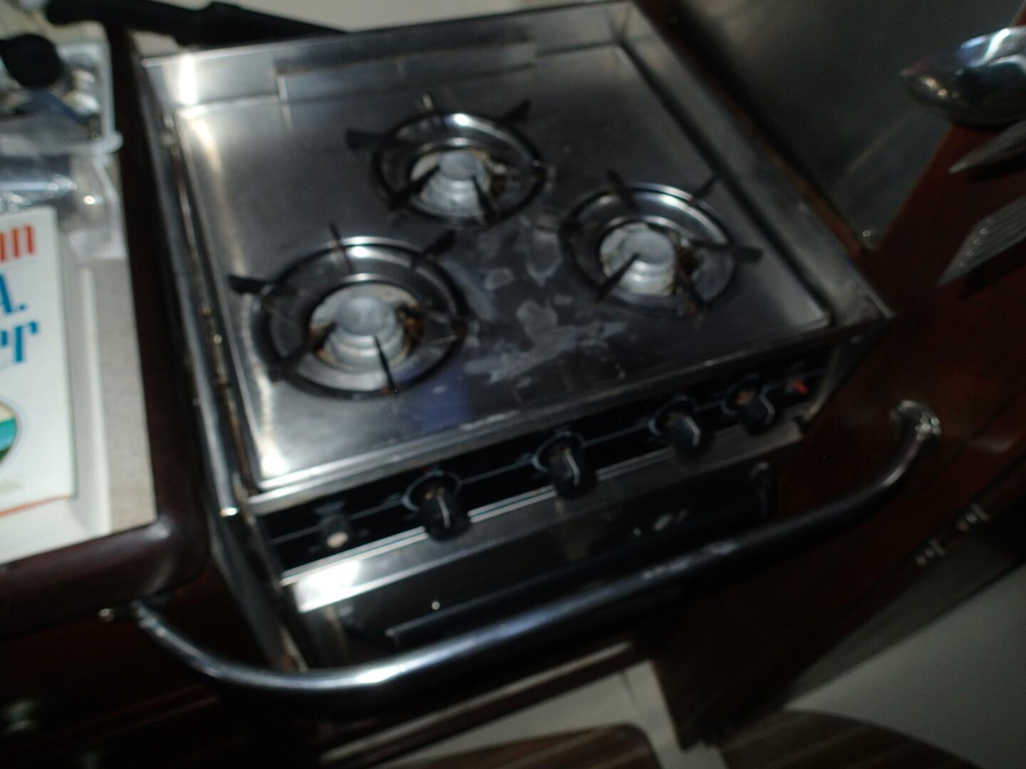 - Galley designed for real cooking: A L-shaped galley with Corian counter, a three-burner propane stove and oven, stainless sinks, a well-insulated refrigerator, and even a microwave — all designed so you can prepare meals even while at sea.