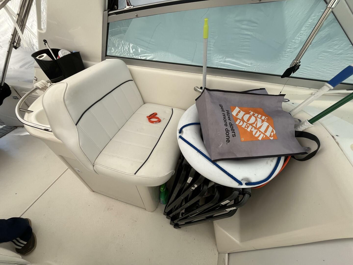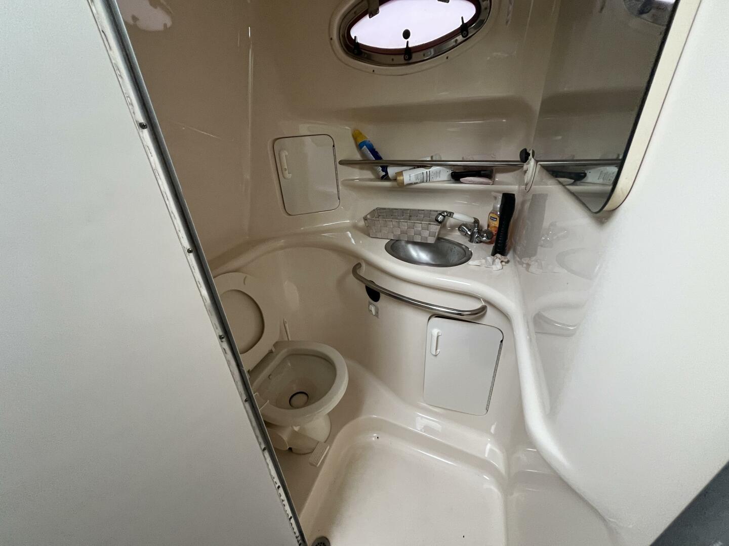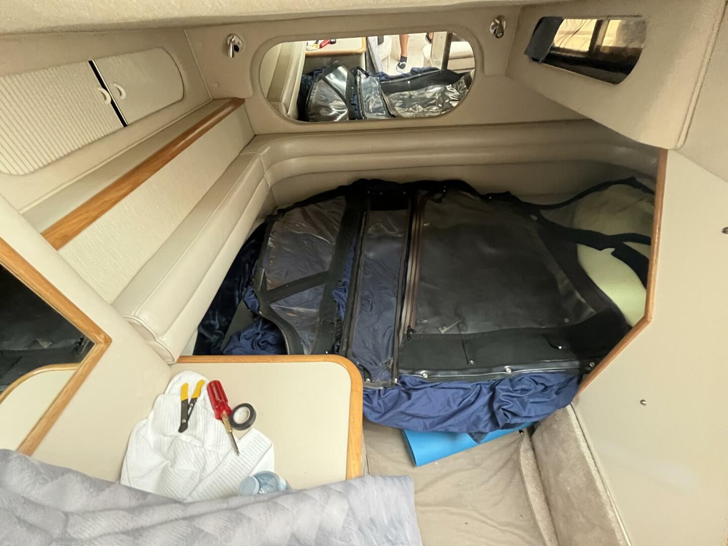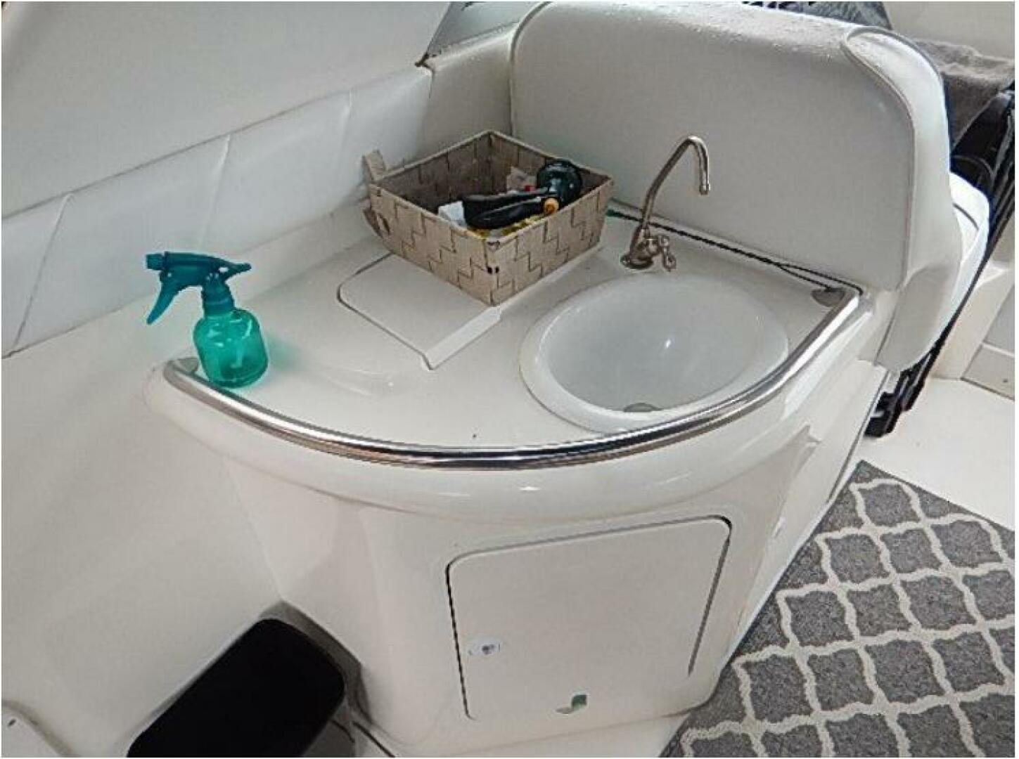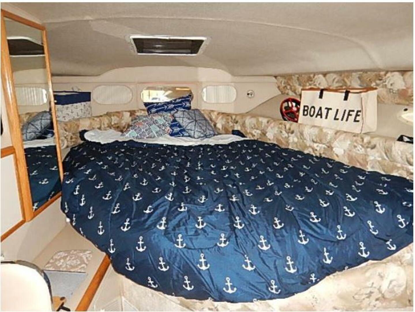 Below decks, the classic Sundancer layout provides comfort and functionality. The mid-cabin berth aft, full galley, convertible dinette, stand-up head with shower, and forward double berth. Privacy curtains separate the sleeping areas from the main cabin, and three hanging lockers offer ample storage.