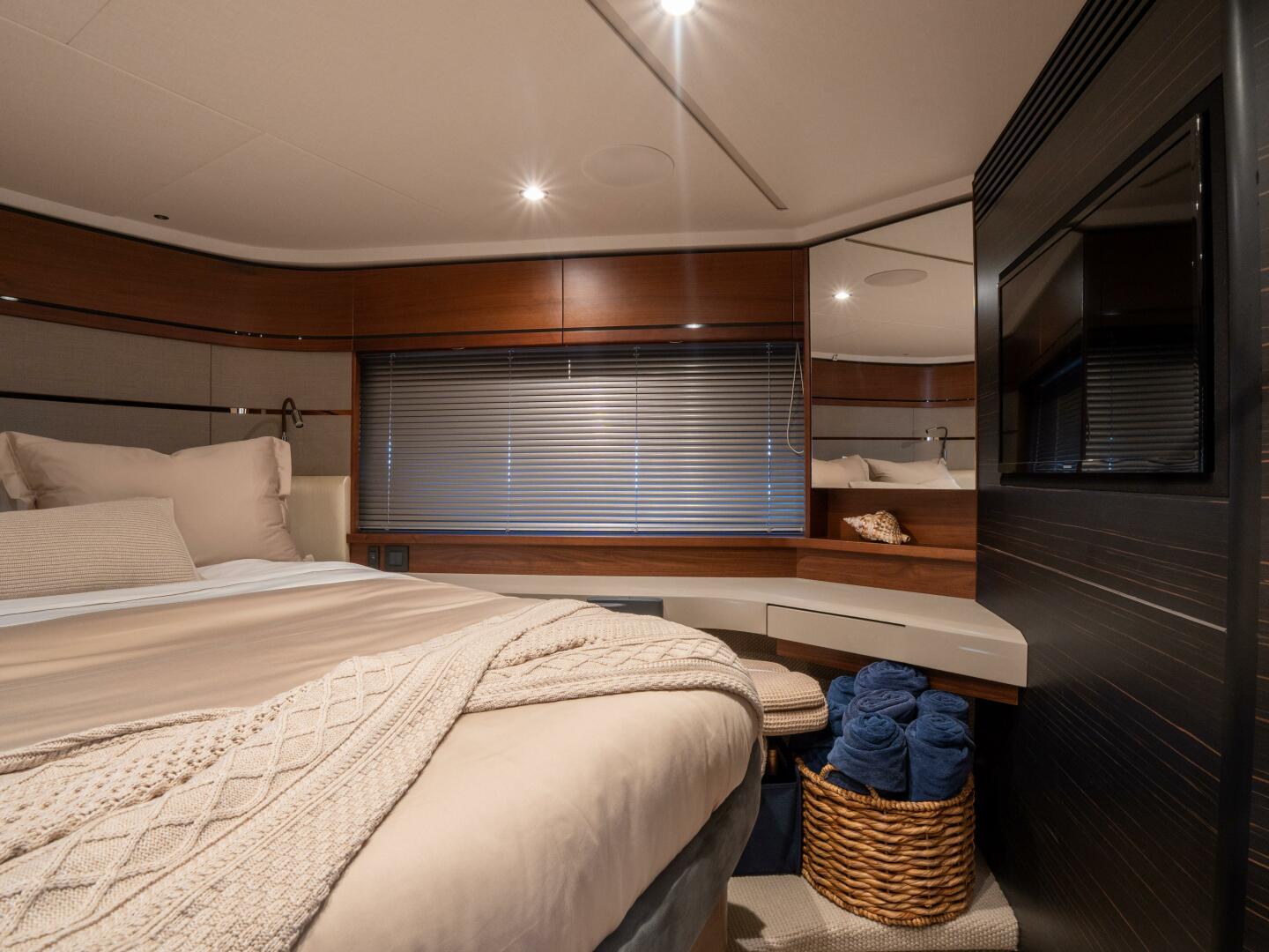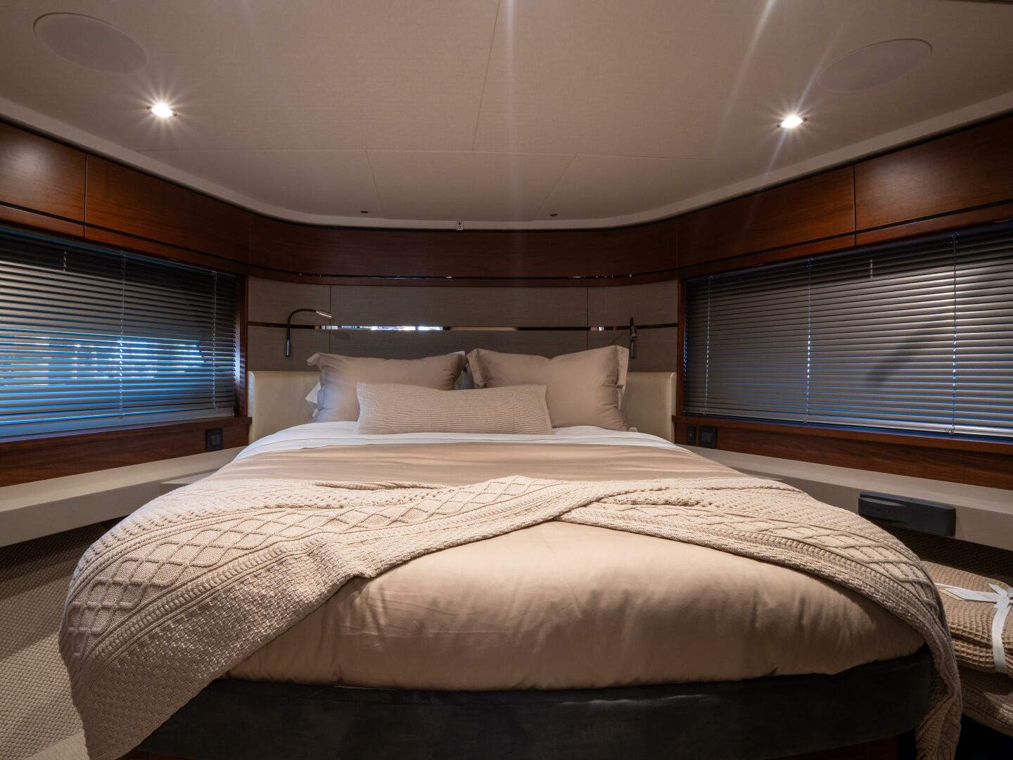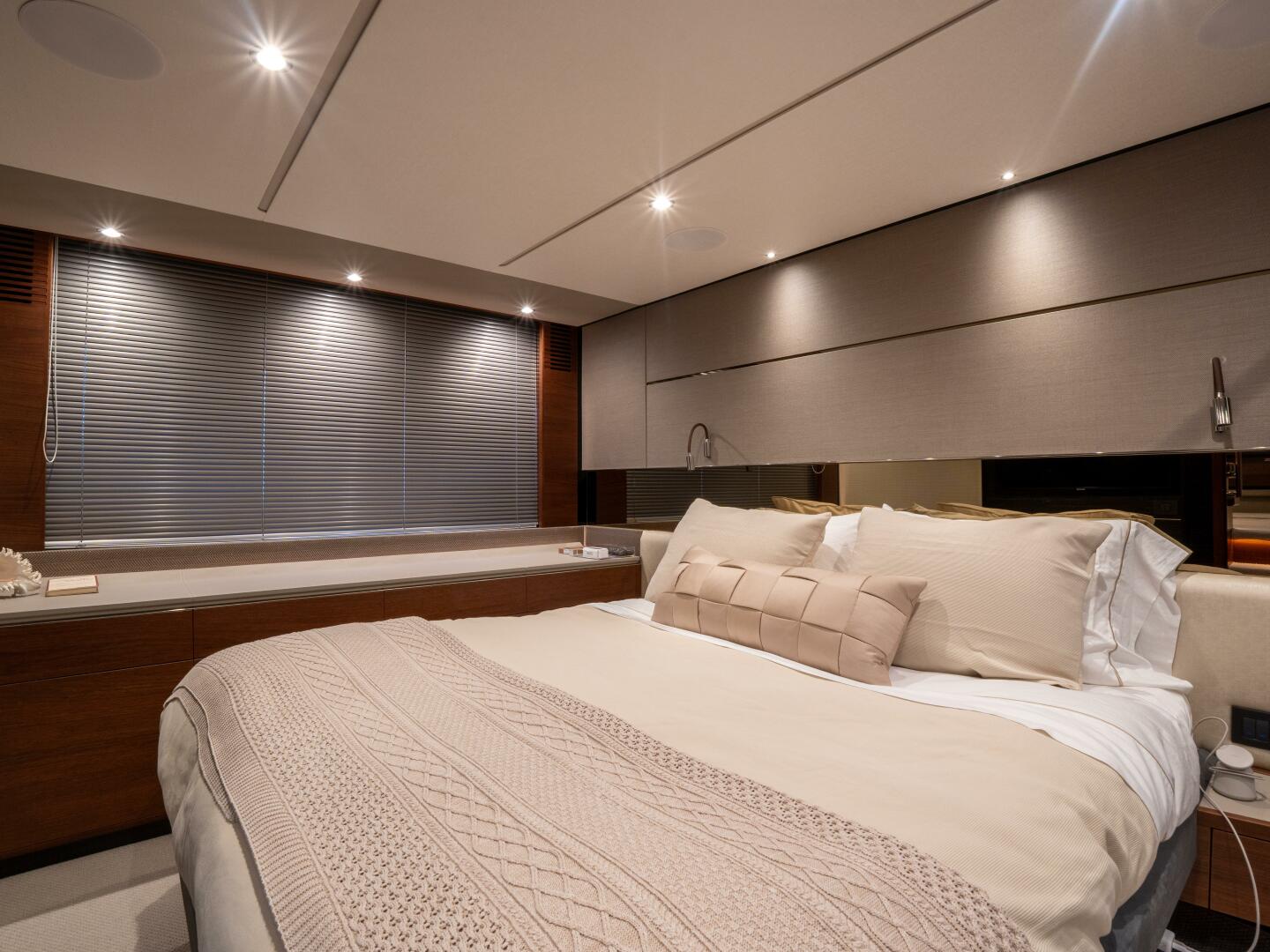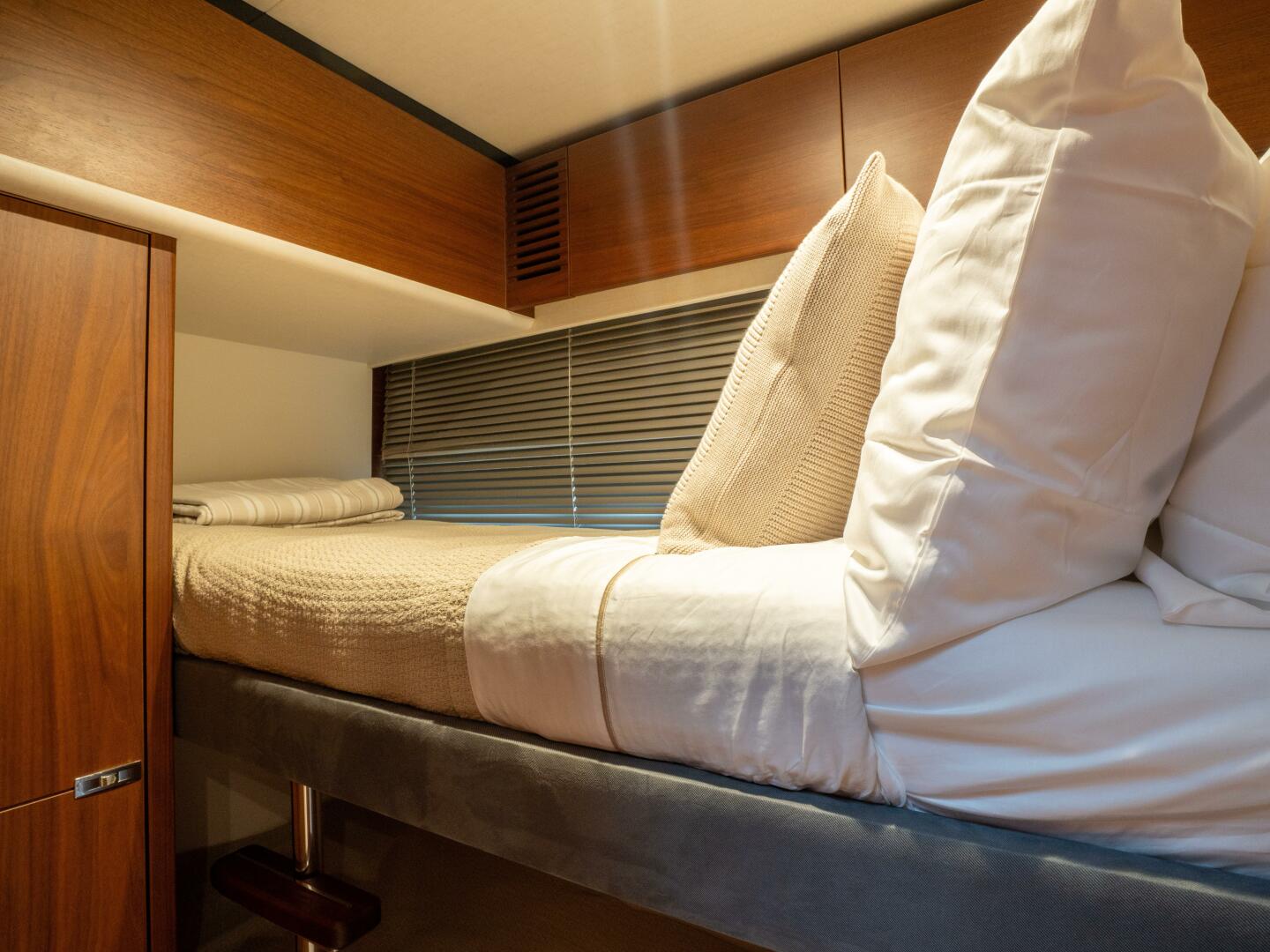 - Twin single berths with powered conversion ability to form a double bed and storage drawers below