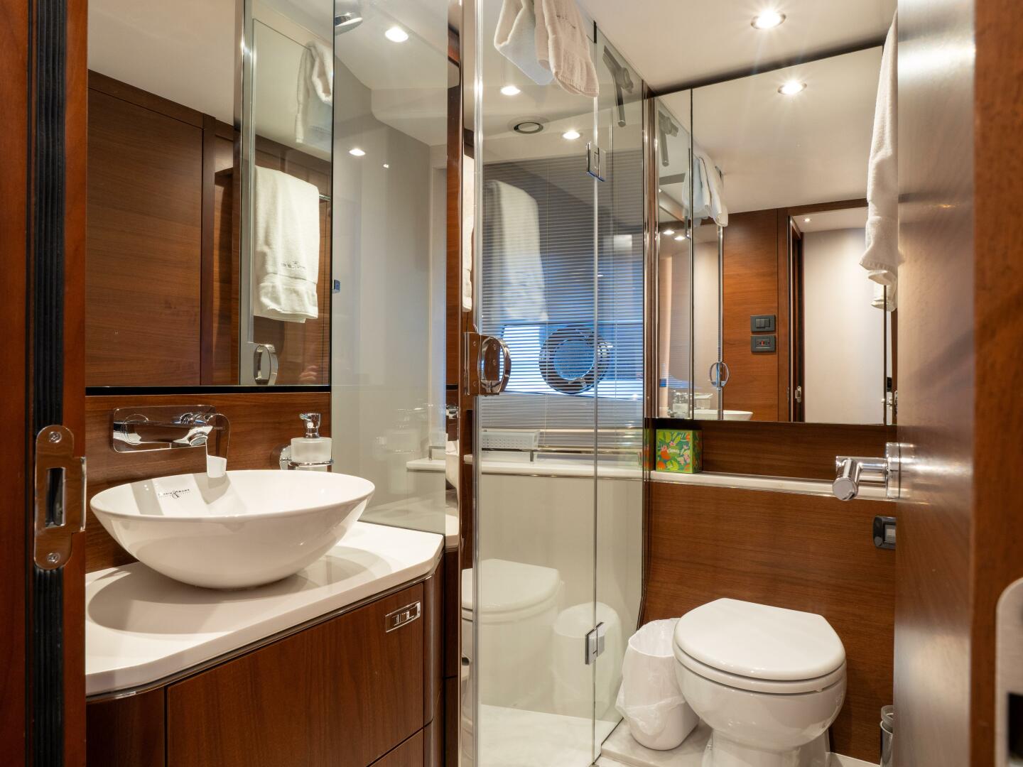 - Ensuite bathroom featuring a full shower stall, electric freshwater toilet, extractor fan, mirrored vanity, and Day head access