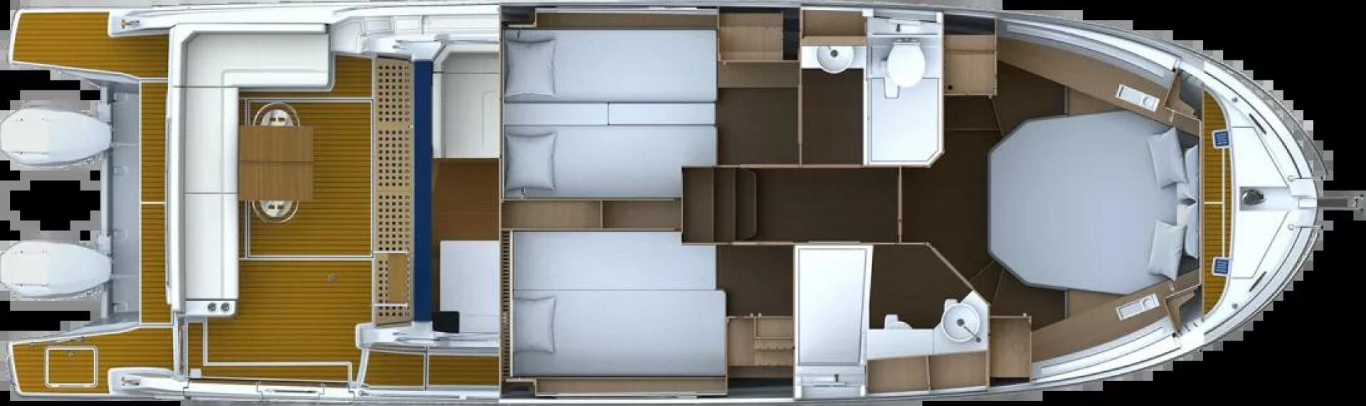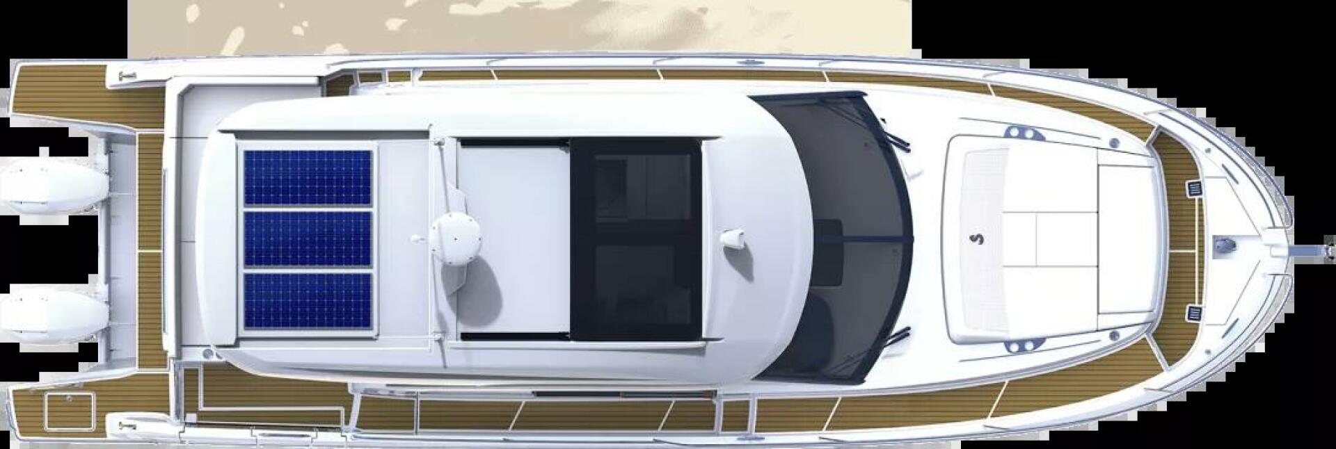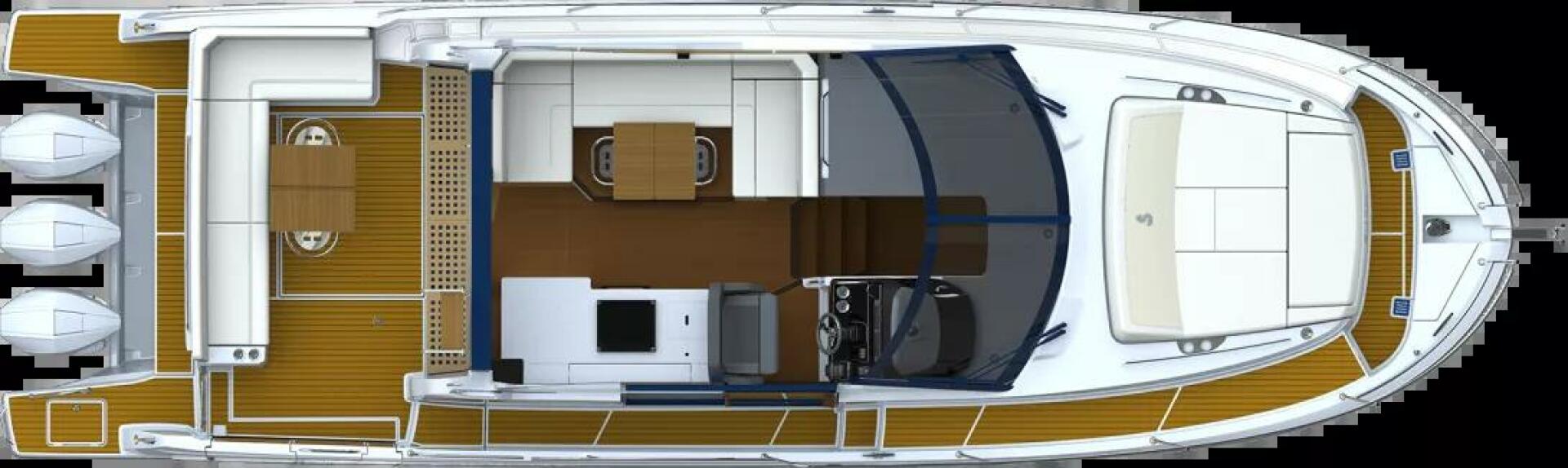 The high-performance hull structure, combined with 2x400 or 3x300 hp engines and equipped with a joystick, offers optimum power and manoeuvrability. The optional Seakeeper gyroscopic stabiliser improves sailing comfort in all conditions.