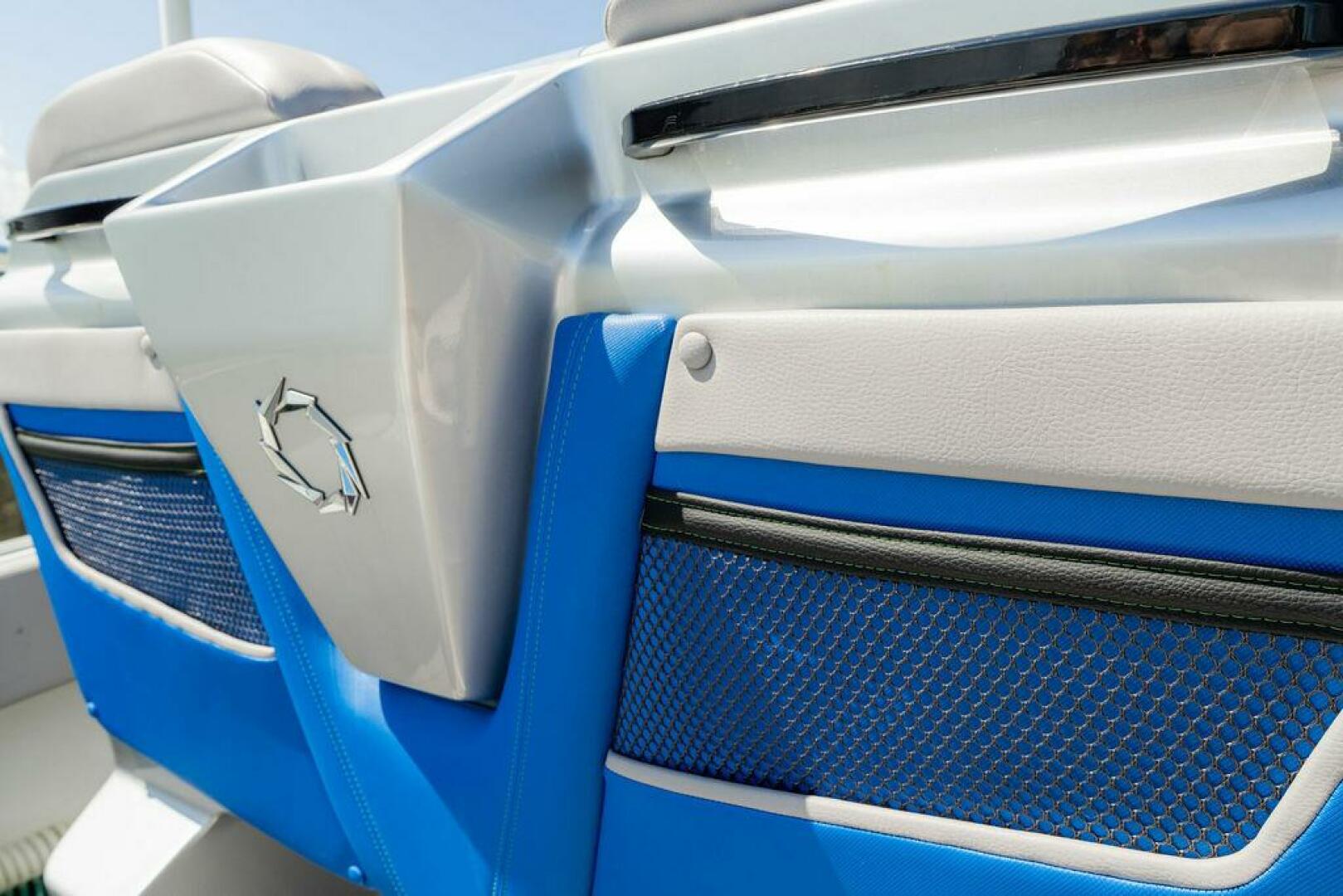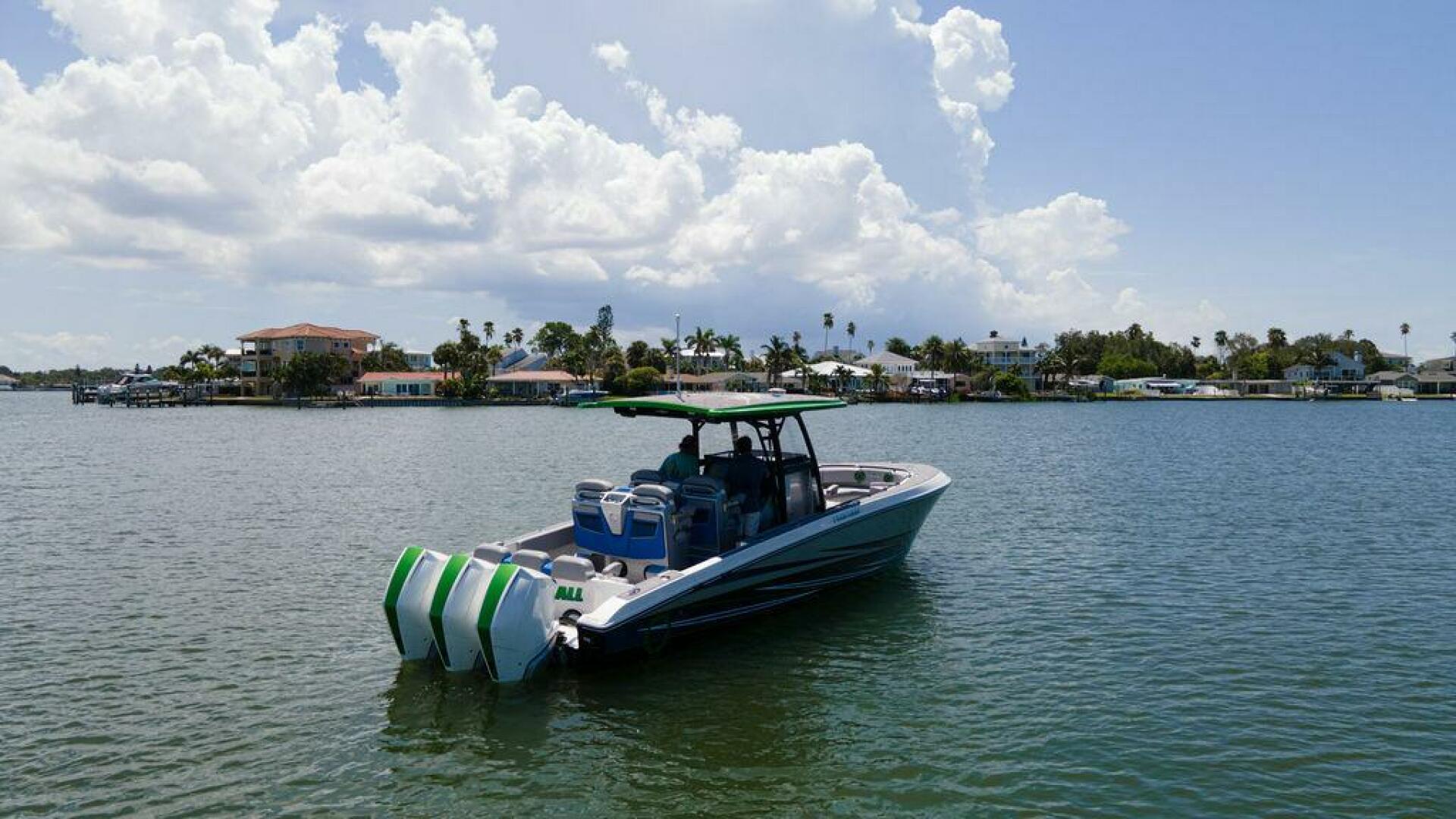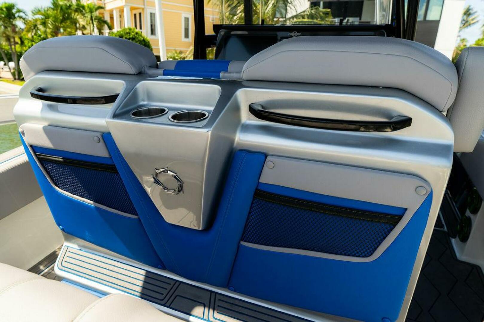 From the stand-up bolsters and full-width aft seating to the forward chaise lounges and recessed bow seating, the Fountain 34SC blends offshore capability with luxurious comfort. With its sleek styling, triple-engine power, and class-leading ride, this 34SC is equally at home running 70+ mph offshore as it is entertaining friends in the harbor.
