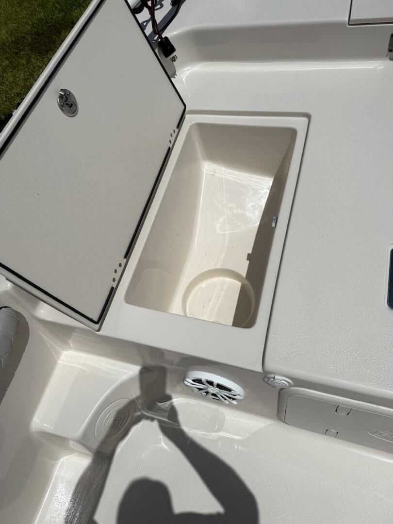 Serious shallow-water performance comes from the dual 10’ Power-Pole shallow-water anchors (white)—perfect for staking out on the flats or holding on windy days. Entertainment is handled by a Bluetooth stereo system with four speakers for clear sound throughout the boat.