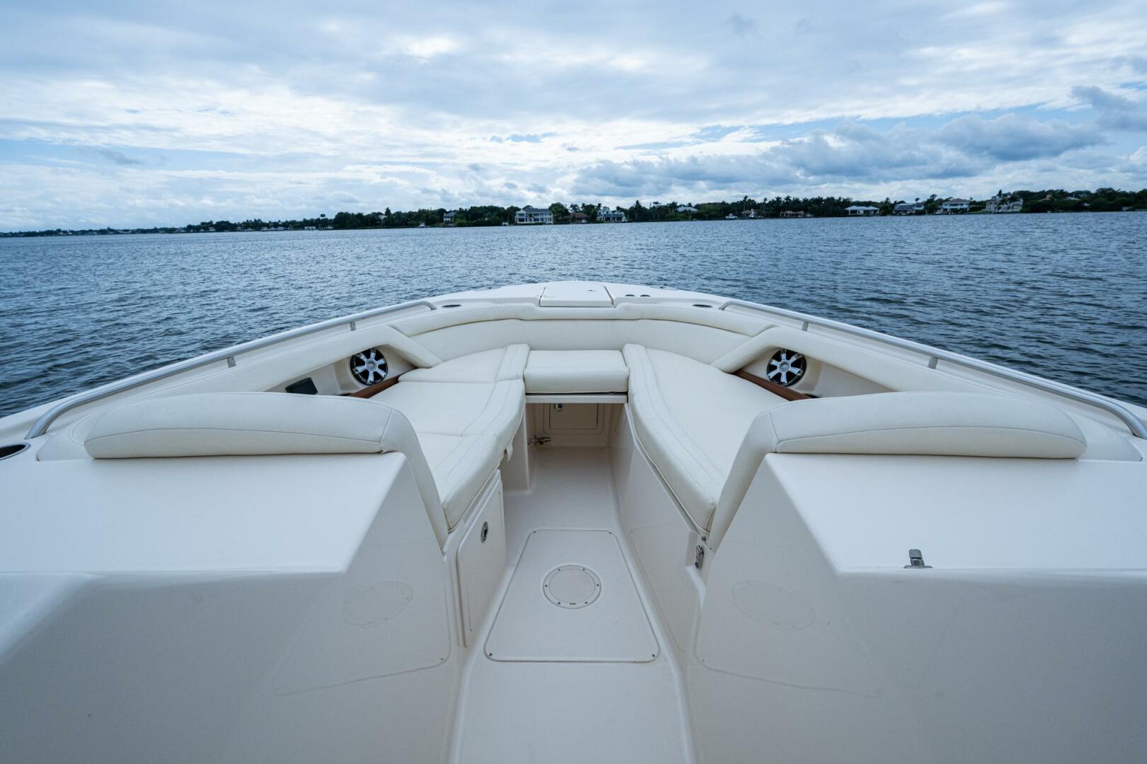Her preferred triple Yamaha F300's give you the reliability and performance over the Twin 350 engine package. Dual Garmin 12" plotters, autopilot, radar and a fusion stereo with all JL Audio speakers. The vessel is loaded with Helm master controls with joystick steering, retractable sunshade, electric grill in cockpit, generator, air conditioned helm and inside console berth.