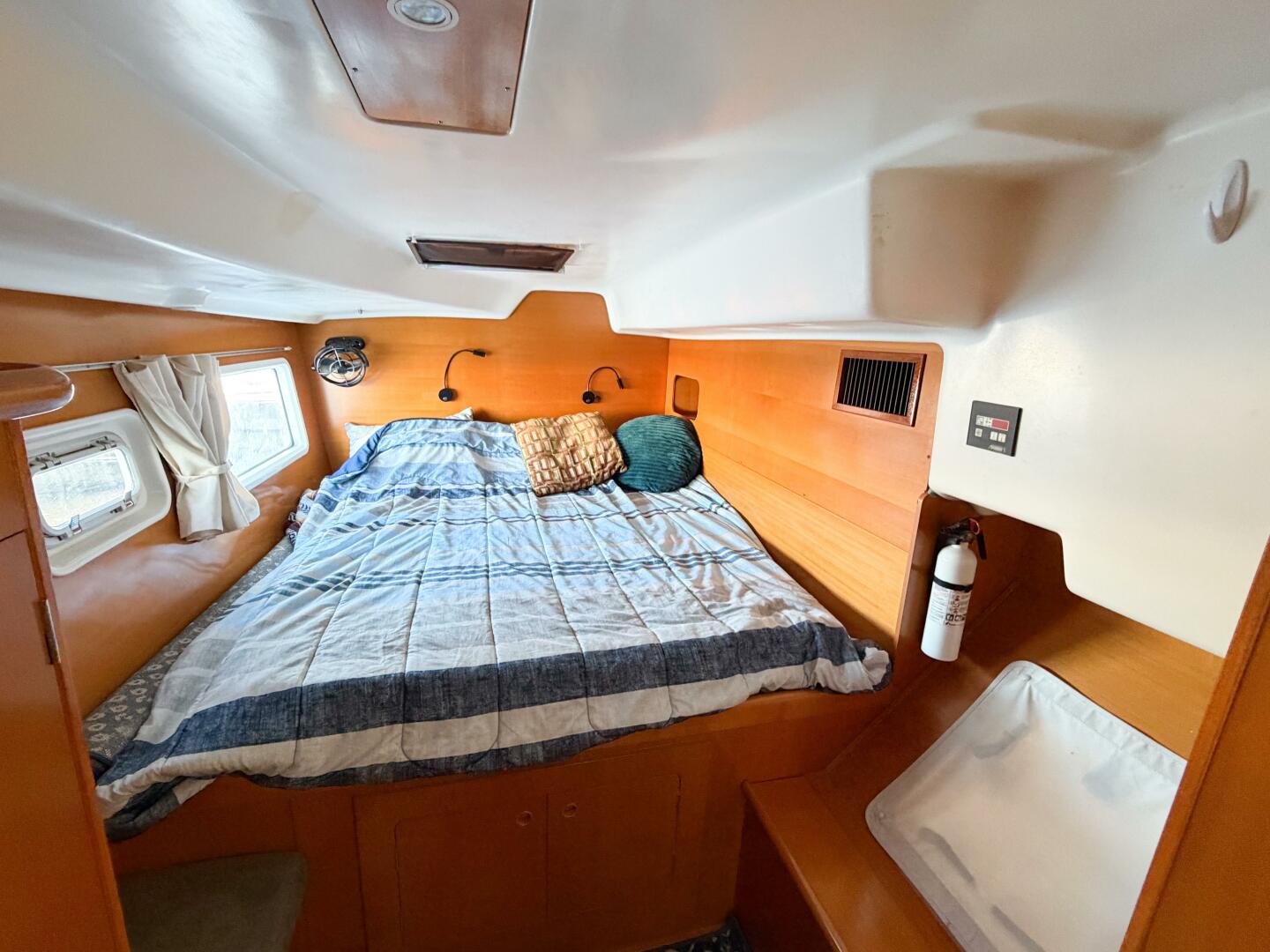 The Owner’s Version layout places the entire starboard hull at the disposal of the owner, featuring a spacious aft cabin, private head, and excellent storage — while two comfortable guest cabins and a second head occupy the port hull.