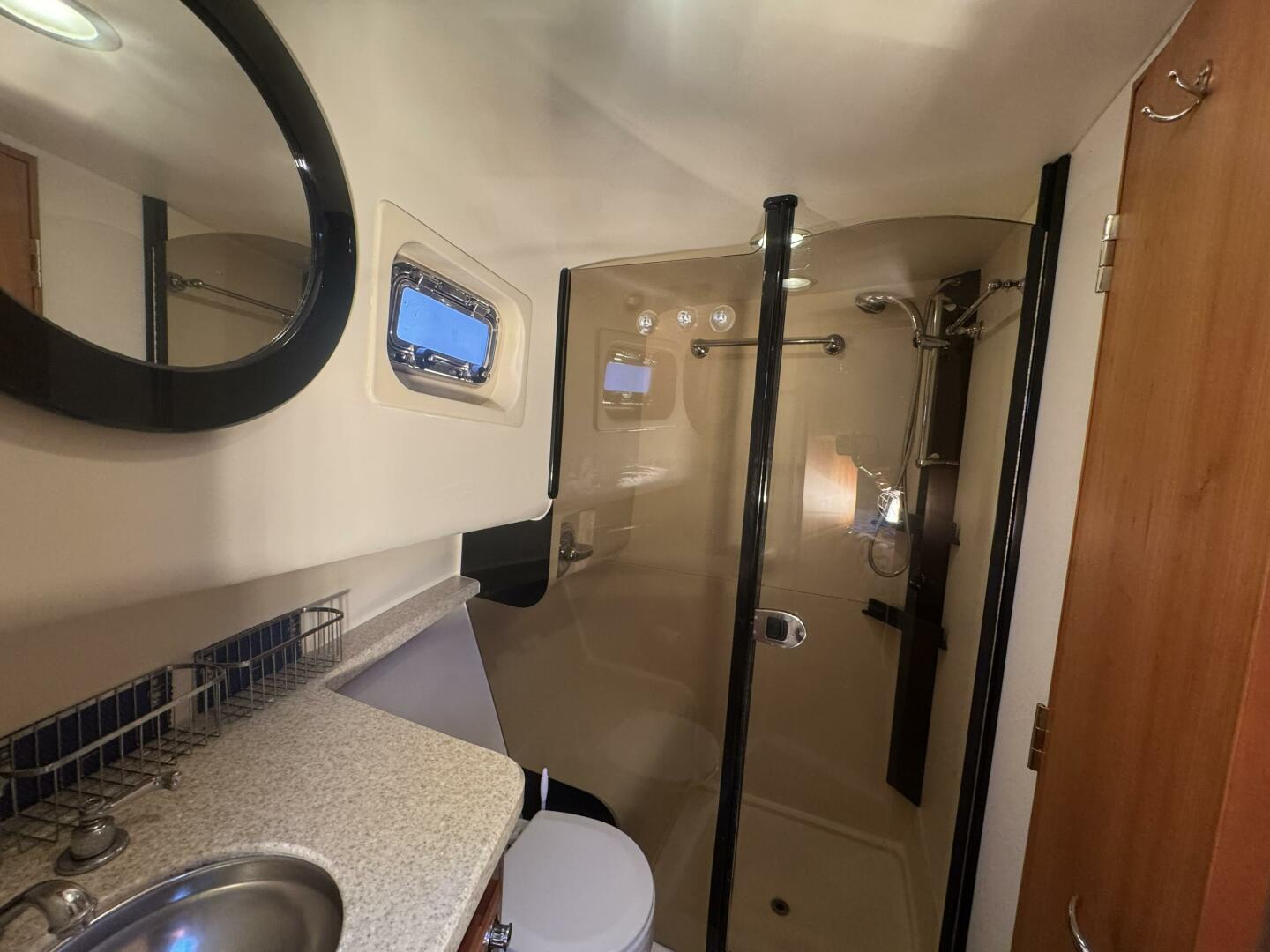 A generously sized head with Corian counters, stainless sink, and a full-height separate shower with seat — uncommon in this size category.