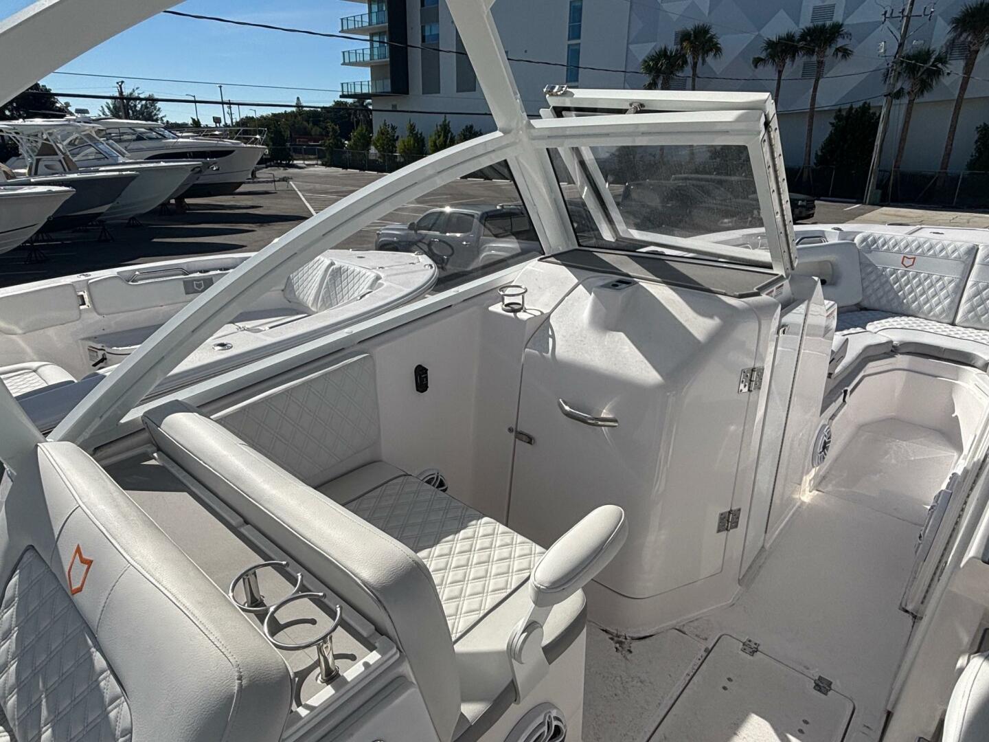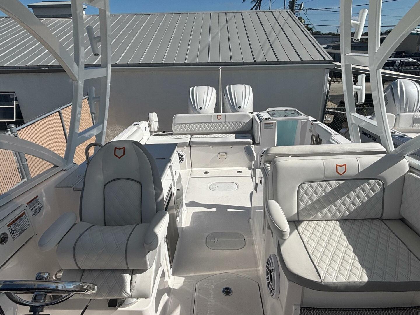 - Marine grade upholstery: antimicrobial vinyl, foam, and white diamond stitching