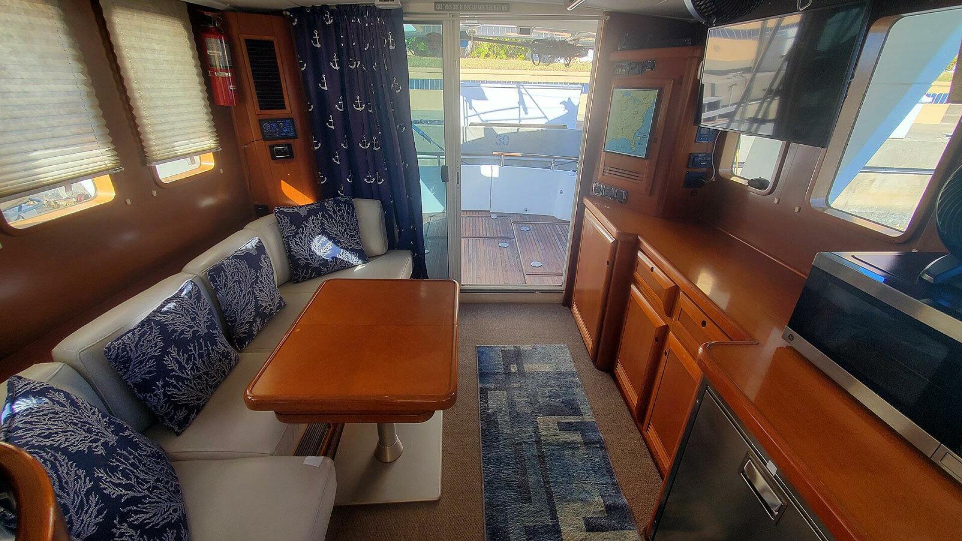 Further forward to port is the fully equipped galley, arranged with opposing hardwood cabinetry and Corian-style countertops. To starboard forward, the well-appointed lower helm provides excellent visibility and convenient access to controls. The companionway to the accommodations is centered at the forward end of the main cabin.