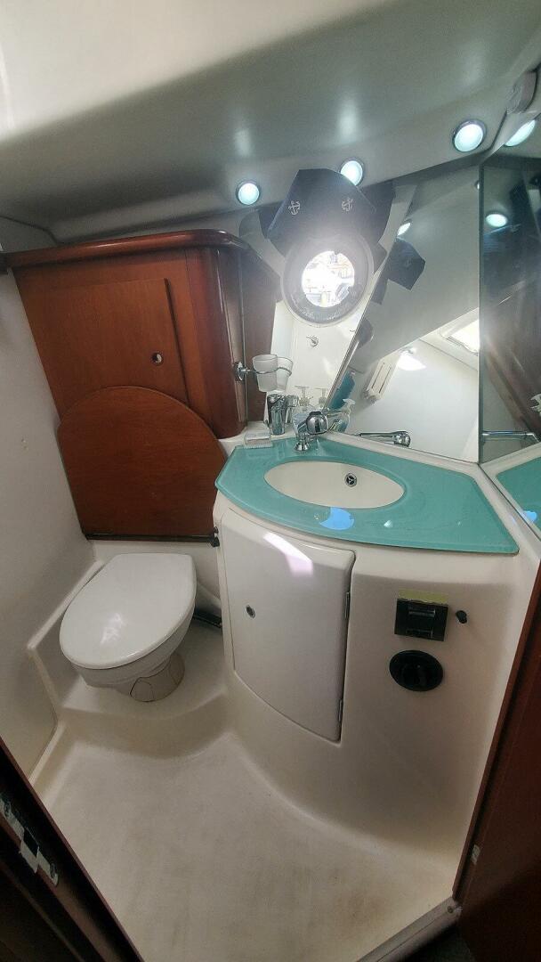 Descending a few steps, the guest stateroom lies to starboard, with the guest wet head directly opposite to port. Continuing forward, the spacious master stateroom occupies the bow and includes its own ensuite wet head to port. Engine room access is provided through a hatch in the salon sole (floor).