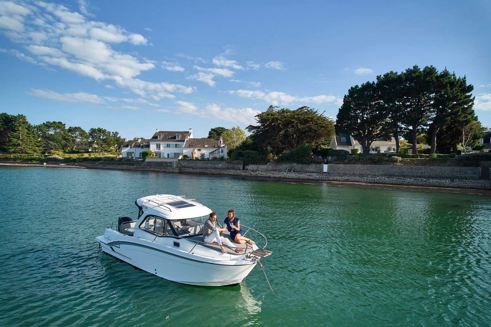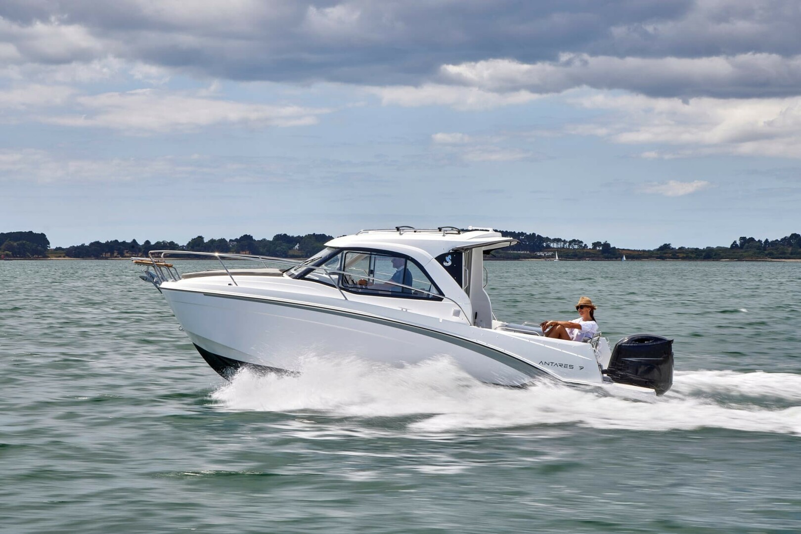 The modular bench seat creates an additional berth, so you can welcome 4 people on board the Antares 7 for an overnight trip. The small galley is equipped with sink, fridge, cooktop and storage. The forward cabin offers a double berth and a separate head compartment with toilet, storage and sink.