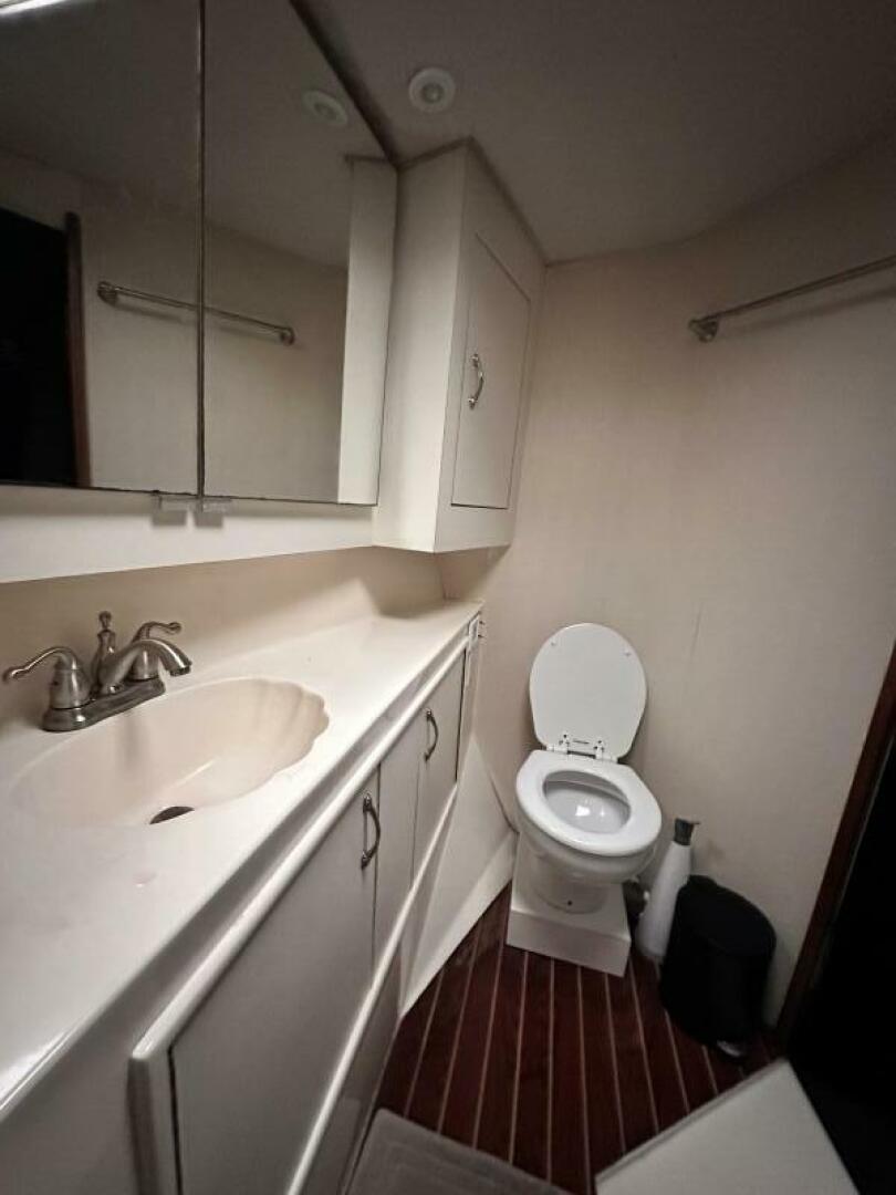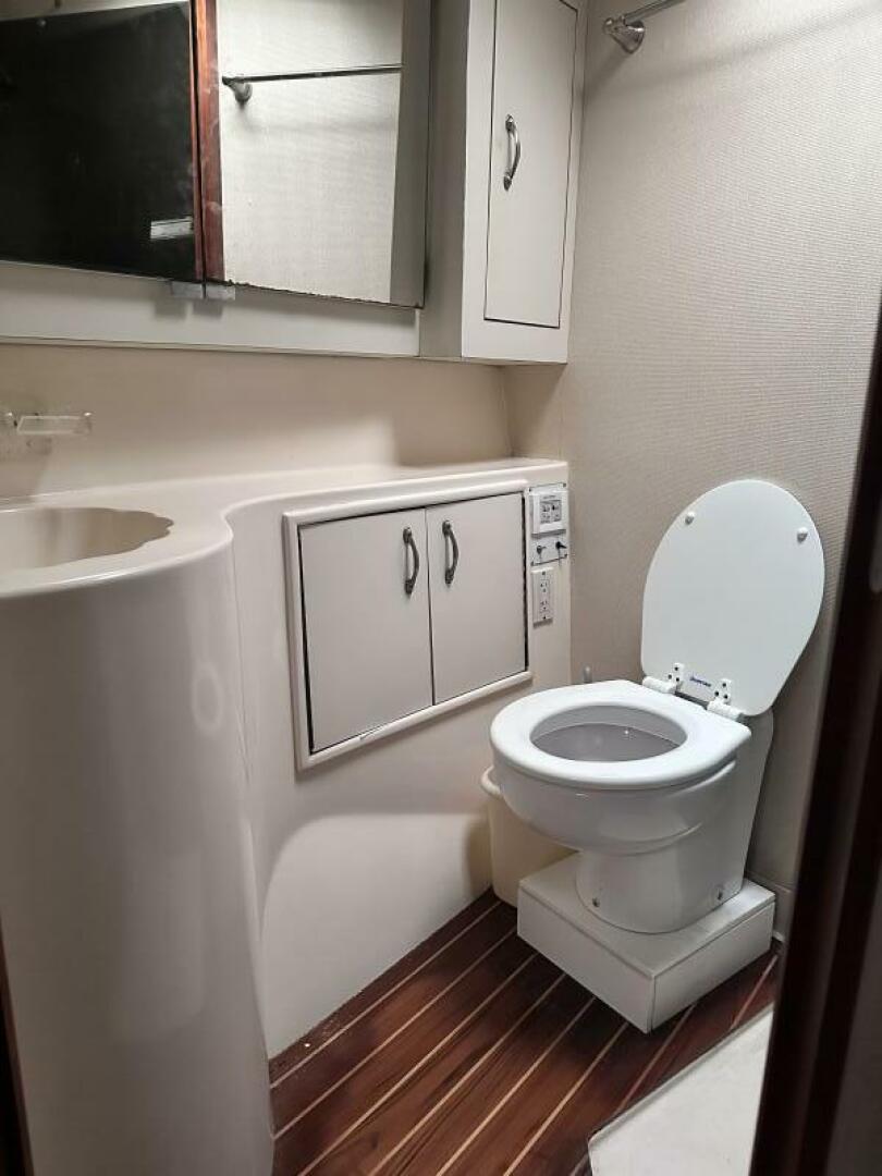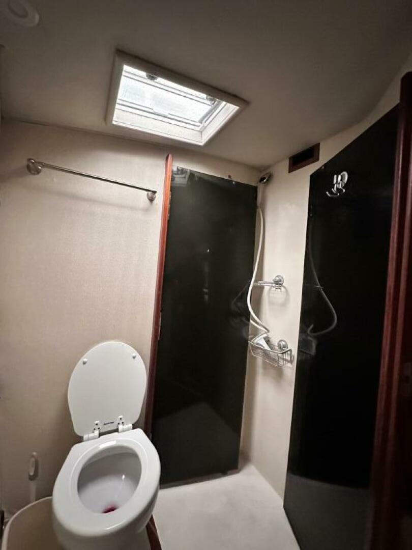 Master Stateroom located aft of the rope locker, here you will find a Queen centerline berth, twin overhead side lockers, twin nightstands, two cedar lined hanging lockers, four storage drawers beneath the berth, and a 13" flat screen TV. Moving aft you will find the in-suite master head which features a private head with shower, updated Raritan head, sink & vanity, and a teak and holly sole. Going aft into the companionway, find an entrance into the guest head to port which includes shower, updated Raritan head, sink & vanity and teak and holly sole. Aft again to port is the primary guest stateroom including twin berths, overhead side locker, cedar lined hanging locker, four drawers beneath berths, nightstand and entrance to guest head. Across to starboard is the third stateroom including over-under berths, cedar lined hanging locker and four storage drawers. Aft and up four steps is the large well-appointed galley to starboard including high gloss parquet flooring, below counter freezer, below counter refrigerator, built in microwave oven, updated Force Ten three burner stove with oven, storage drawers and cabinets, sink with garbage disposal. Aft and up a step, is the main salon including a large L-shaped sofa at port, teak high gloss high-low table, wet bar with ice maker and perma pub liquor dispenser forward to port, a custom built entertainment center atop port dash, three teak stools at breakfast bar to starboard, one barrel chair, and the electrical panel cabinet aft to starboard.