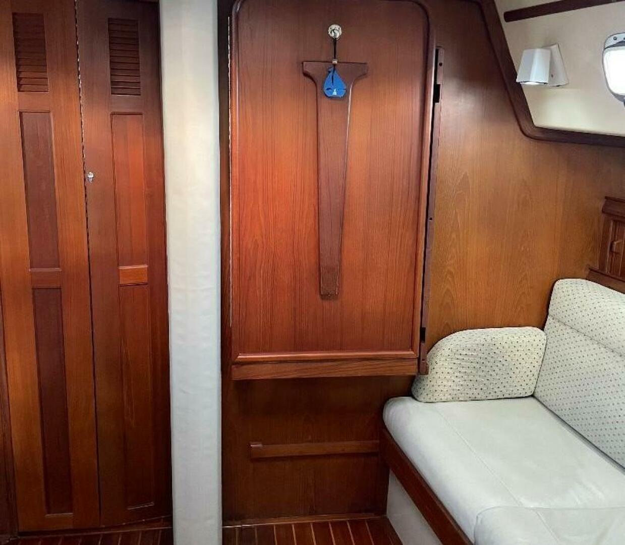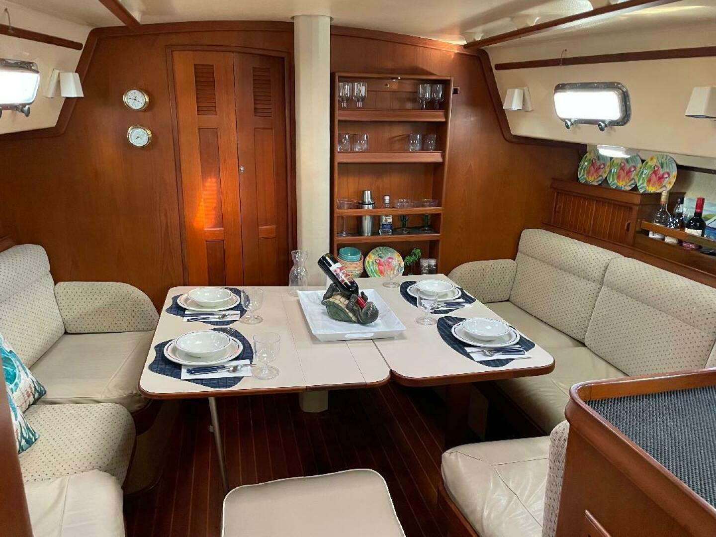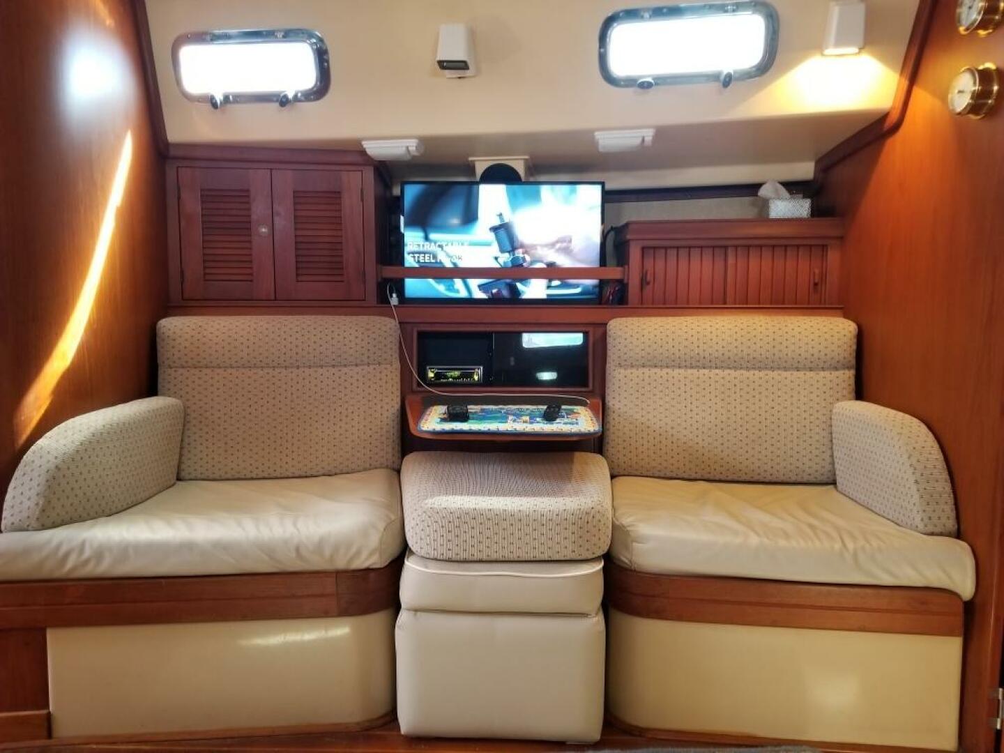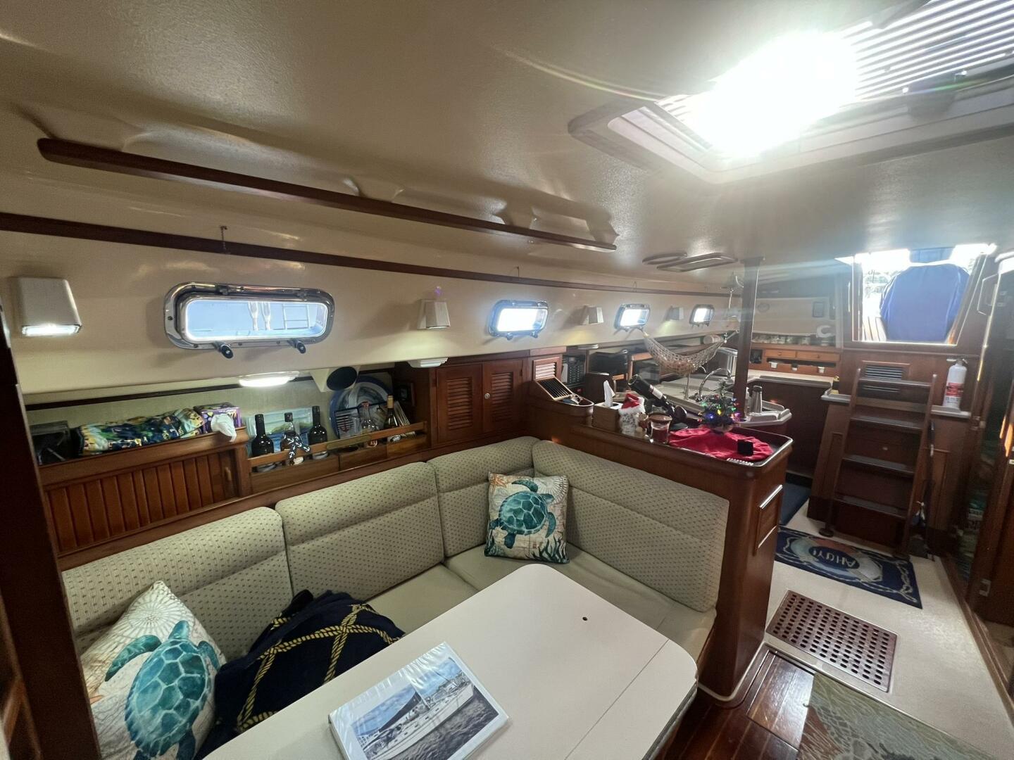For the interior, the layout is functional and traditional. There is teak joinery offering excellent fit and finish, a U-shaped galley and starboard side navigation station. The salon offers a fold-down dinette table and wraparound seating. Her two-stateroom, two-head layout is kept comfortable with two air conditioner units.