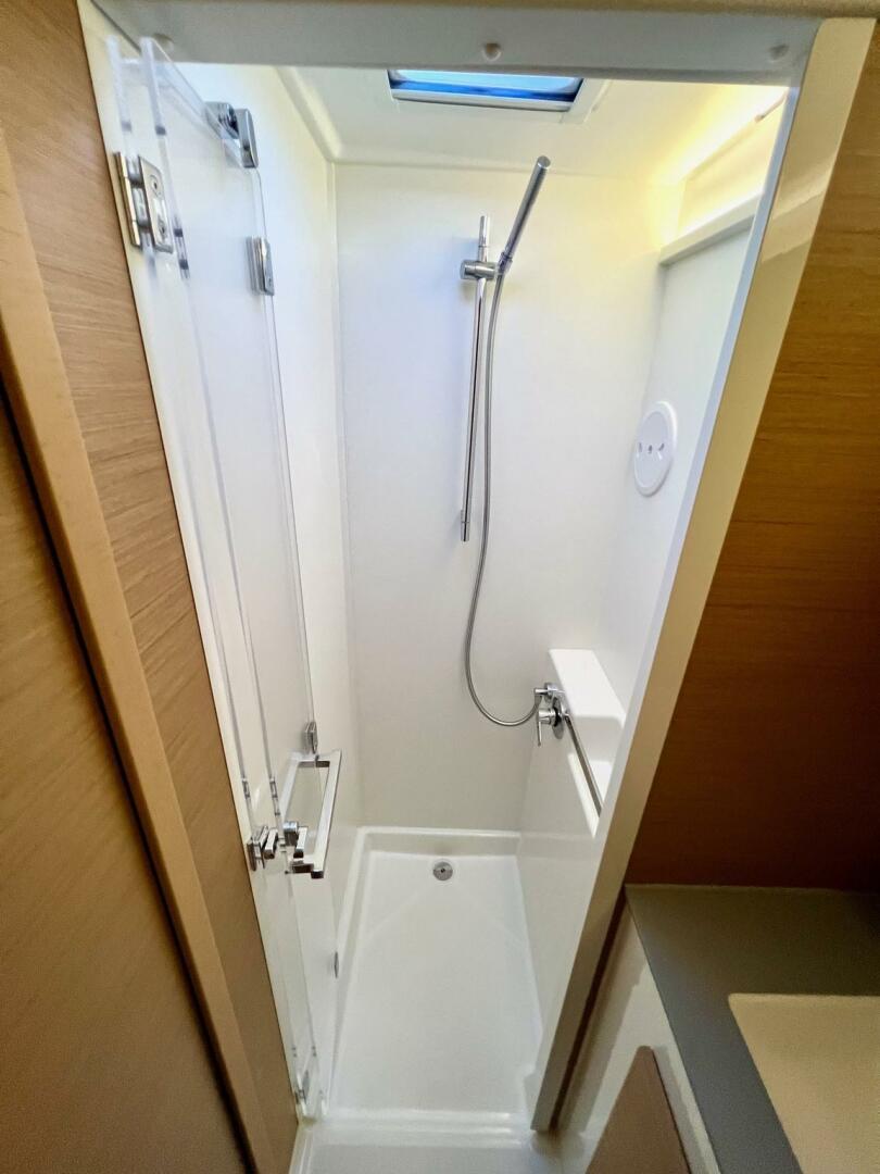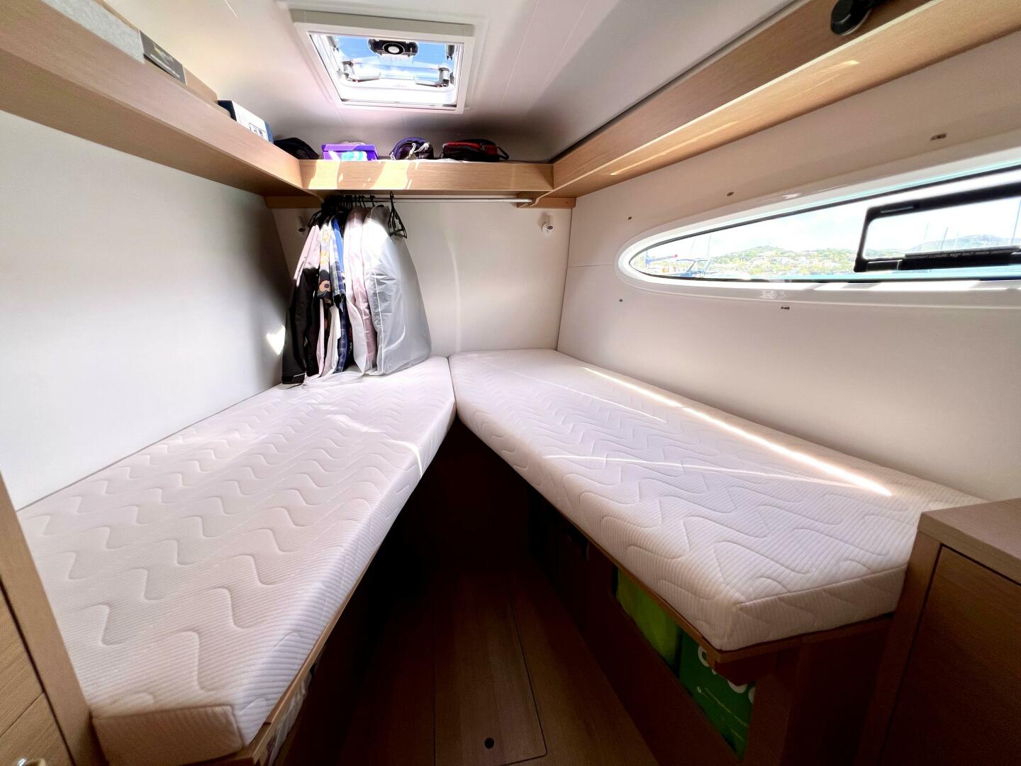 This Excess 14 is the top-of-class Owners Version, with a layout including the entire starboard hull dedicated entirely to the master’s cabin. This is a big improvement over common owners layouts in that, rather than dedicating massive space to a shower stall (a cheap way to use space is to leave it empty!), the forward cabin to starboard is designed as a spacious open-plan walk-in storage closet—convertible to a cabin with two single bunks, an invaluable upgrade for serious cruisers.