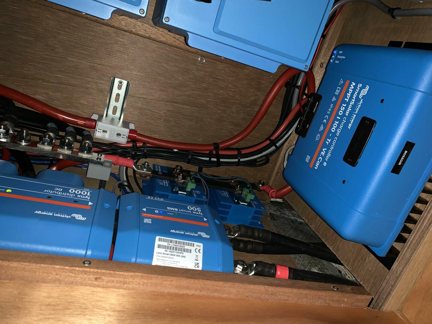The most significant work was the reinforcement of the forward hull sections below the waterline and the areas under the water tanks and mast base. To do this they removed and reinstalled parts of the bunks, floors, and sidewalls, leaving everything properly finished when complete. They also upgraded the steering (Dyneema cables and Jefa needle‑roller rudder bearings), modified the keel trailing edges to improve flow over the rudders, replaced and improved the bobstay and bowsprit in the area of the bow roller, installed new davits and a new bow roller, added extra forward cleats, upgraded mainsail reefing lines and deck organizers, and carried out an electrical throttle wiring harness recall. A carbon support beam was also fitted above the cockpit‑to‑saloon doors. While it was a bit inconvenient at the time, we were impressed with the thoroughness, and we feel it has helped maintain and even enhance the long‑term value of the boat.