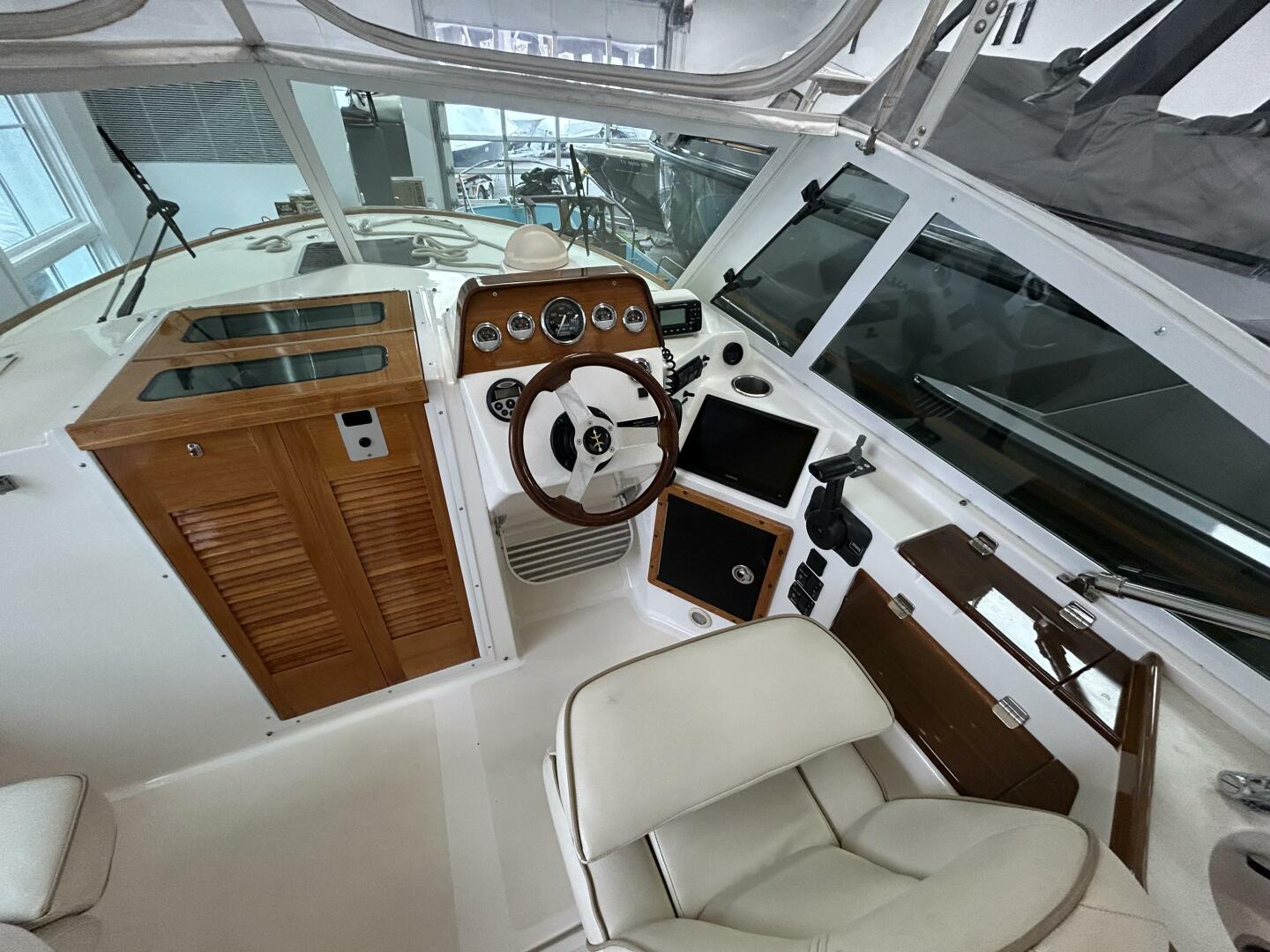 HELM - Fiberglass console with varnished teak trim & teak rim steering wheel