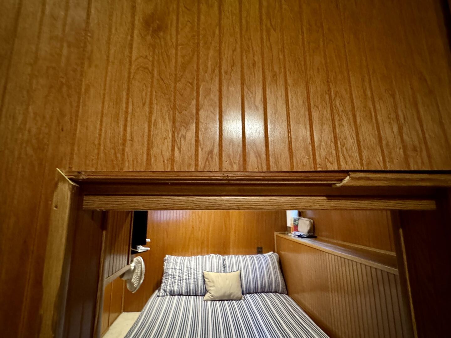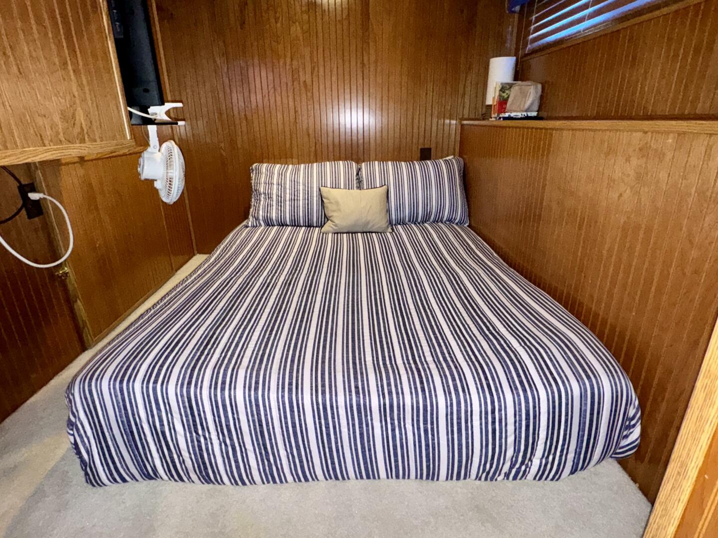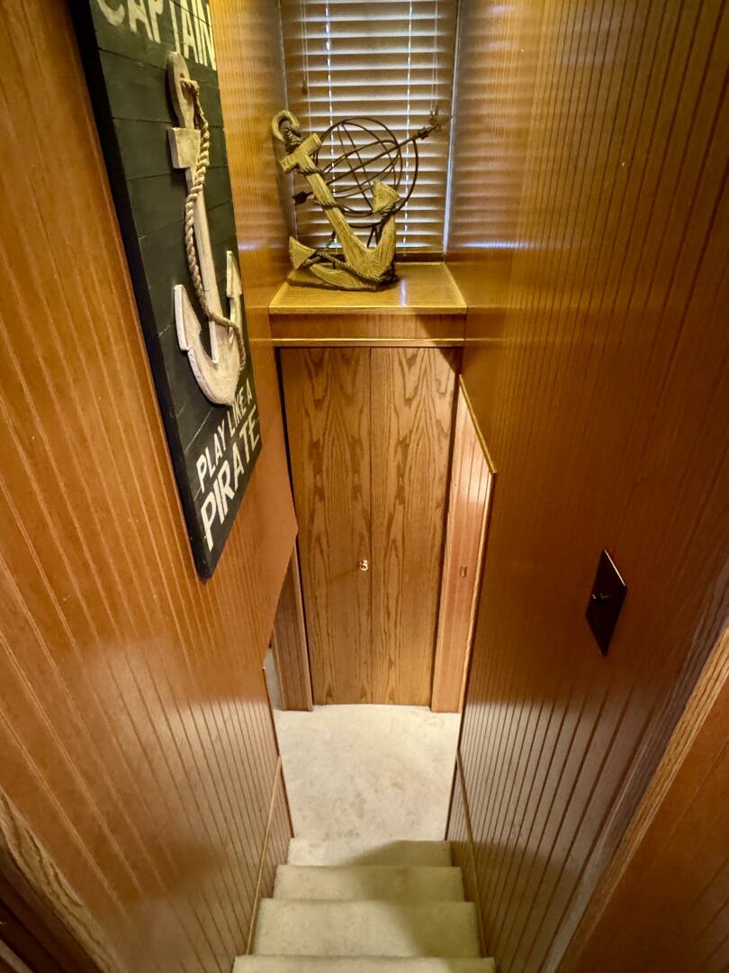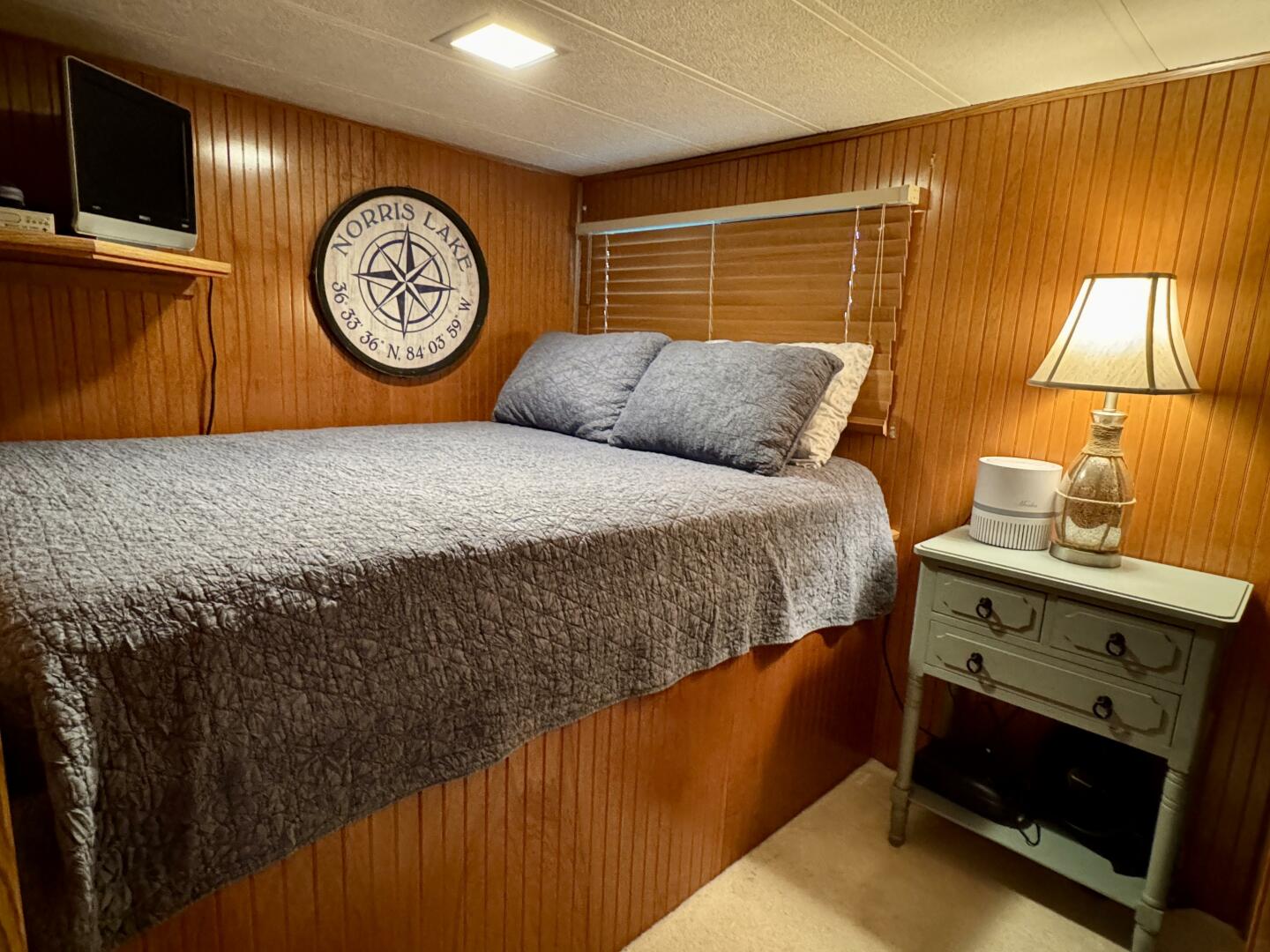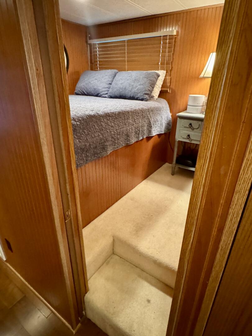 Back down the main level, moving aft and to starboard is the full bath with a marine head, walk in shower, vanity sink with integrated medicine cabinet. Returning to the hallway and moving aft, then to port you'll take a few steps down into a double cuddy, towards the bow you'll find another full size bed, small television with DVD player, and dresser drawers. To aft you can choose to enter the crawl-in cuddy with another full size bed and a 32'' amazon fire HDTV.