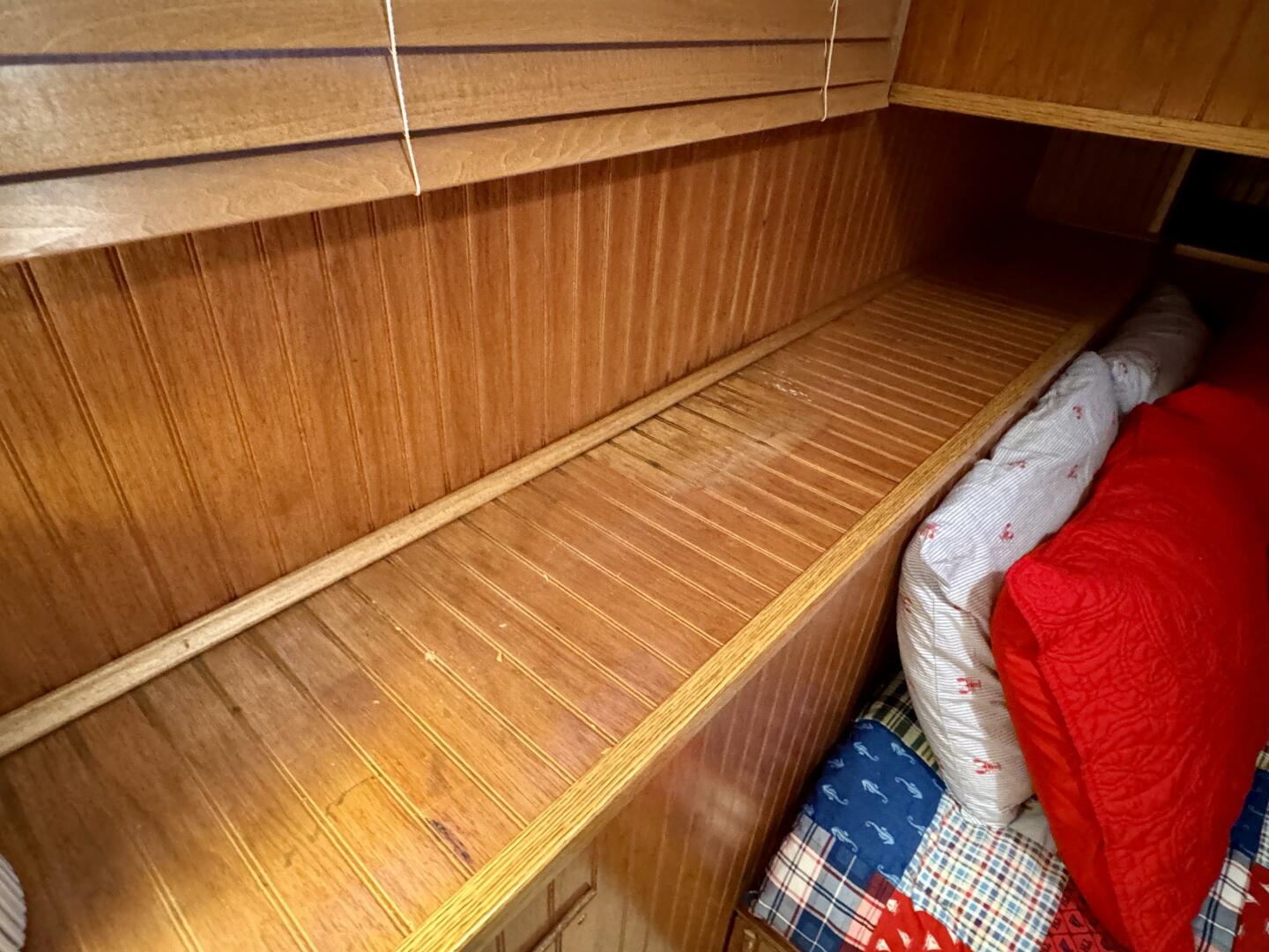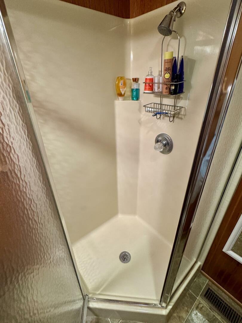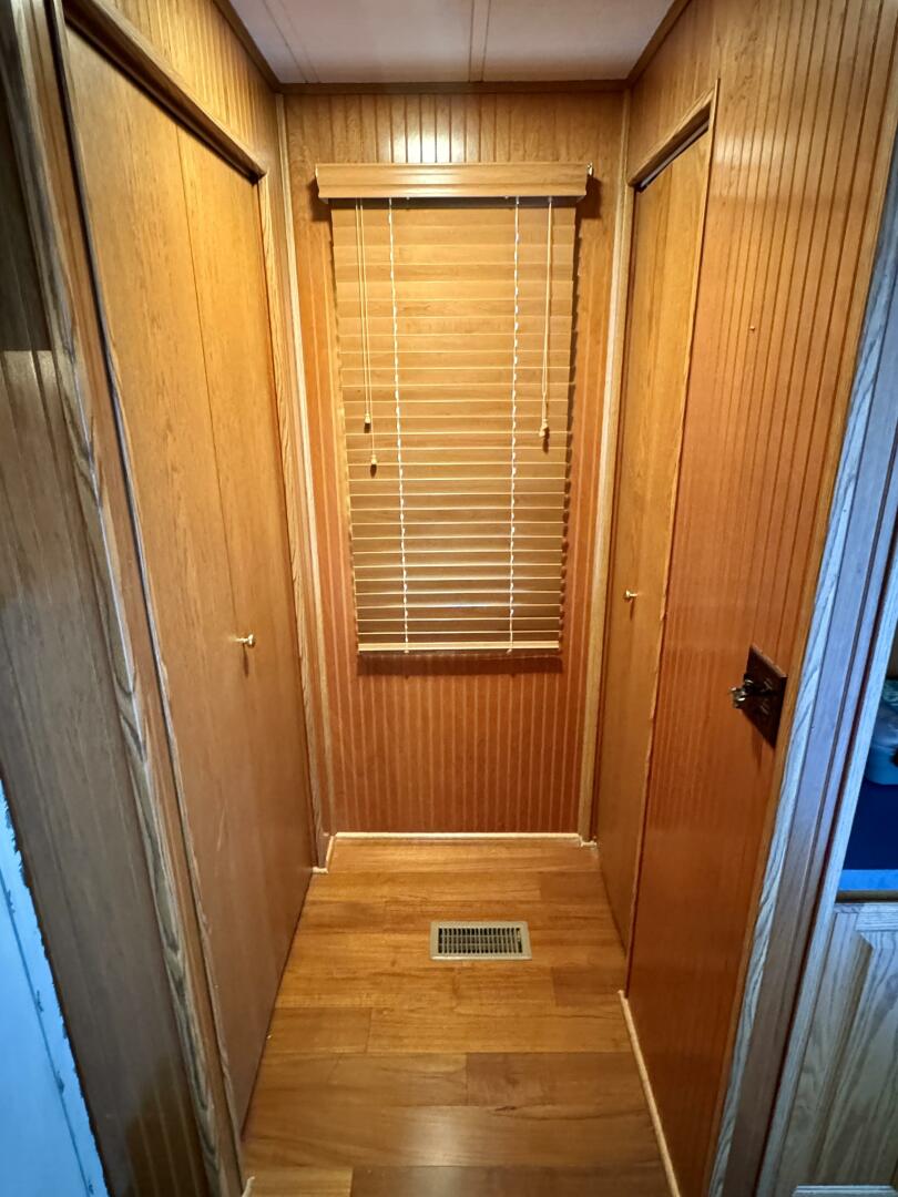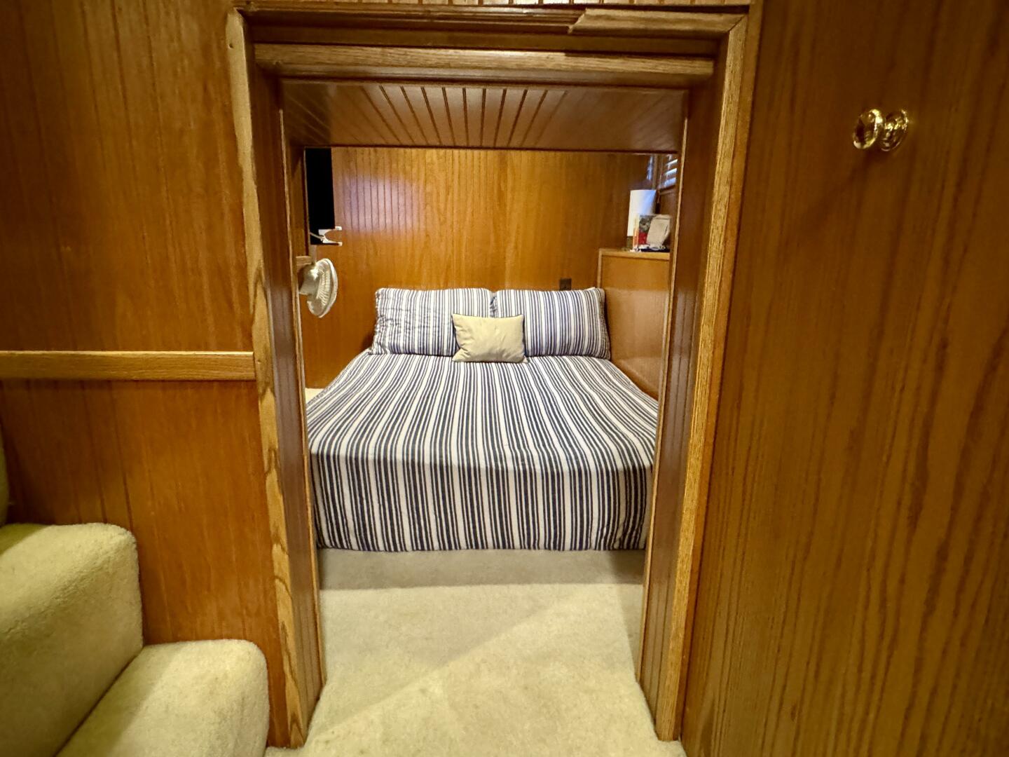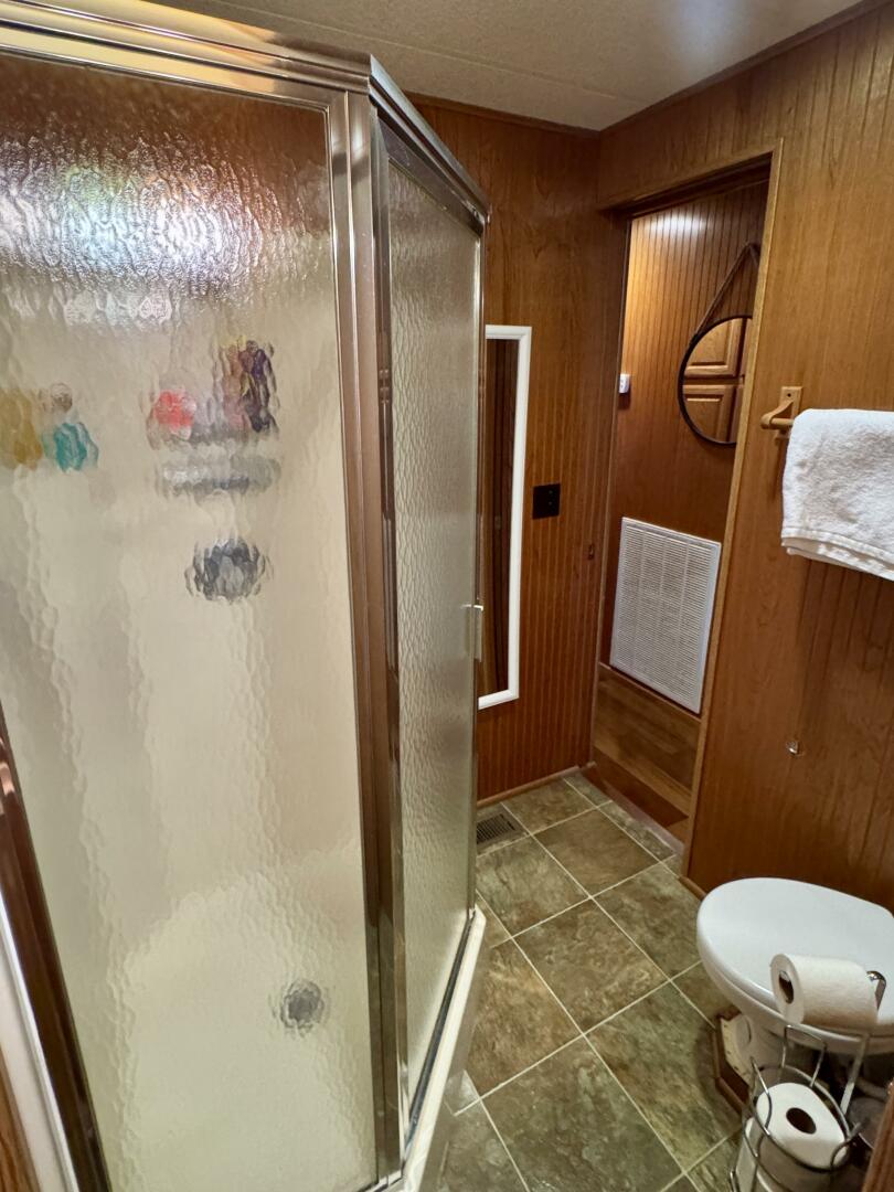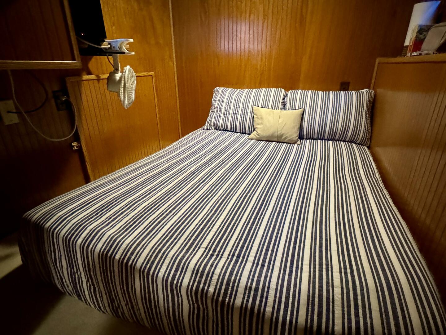 Back down the main level, moving aft and to starboard is the full bath with a marine head, walk in shower, vanity sink with integrated medicine cabinet. Returning to the hallway and moving aft, then to port you'll take a few steps down into a double cuddy, towards the bow you'll find another full size bed, small television with DVD player, and dresser drawers. To aft you can choose to enter the crawl-in cuddy with another full size bed and a 32'' amazon fire HDTV.