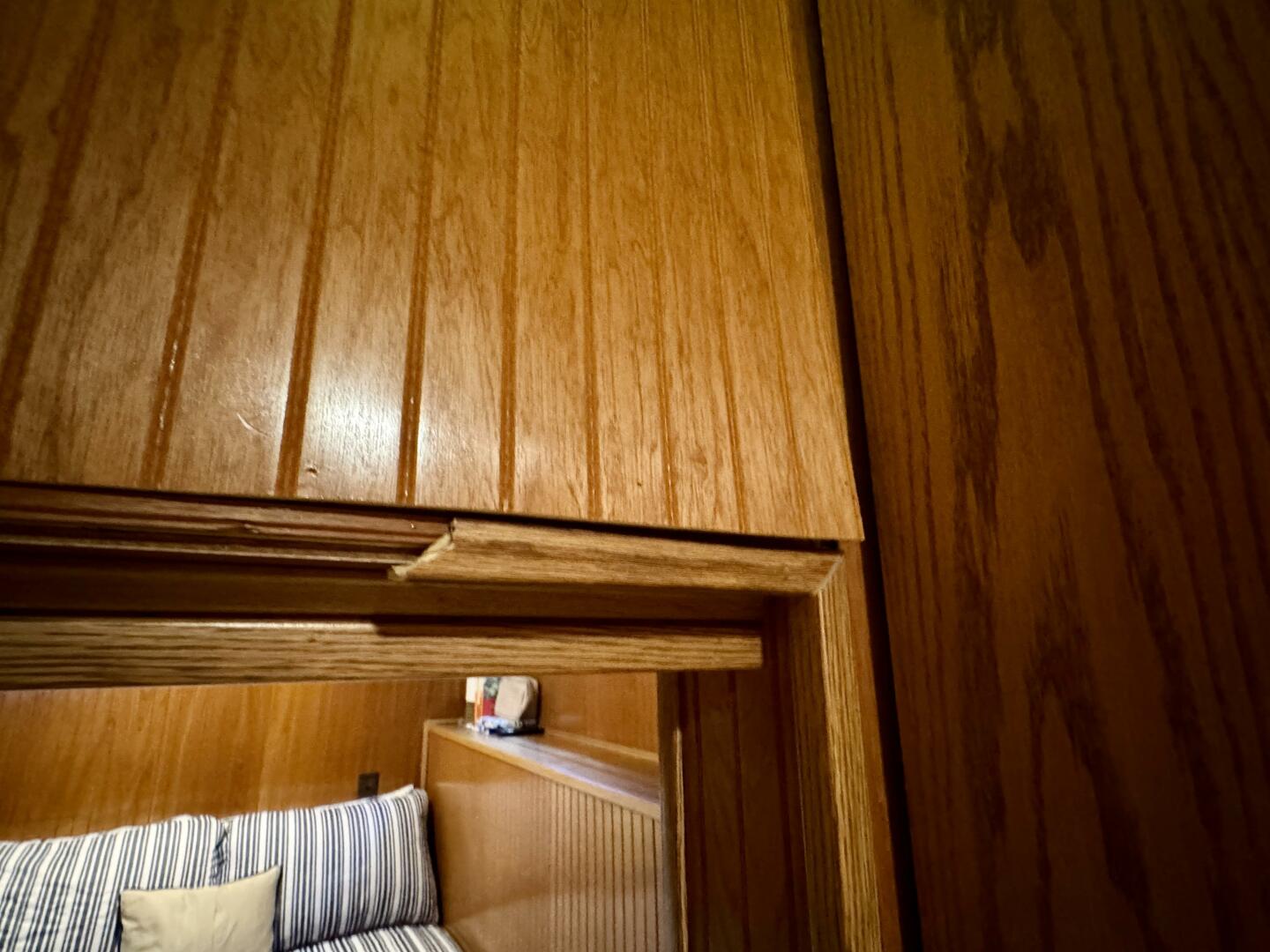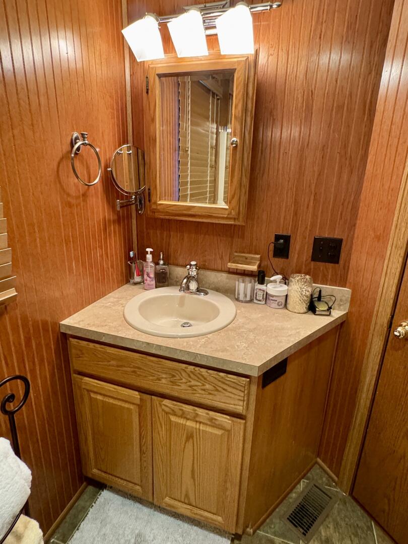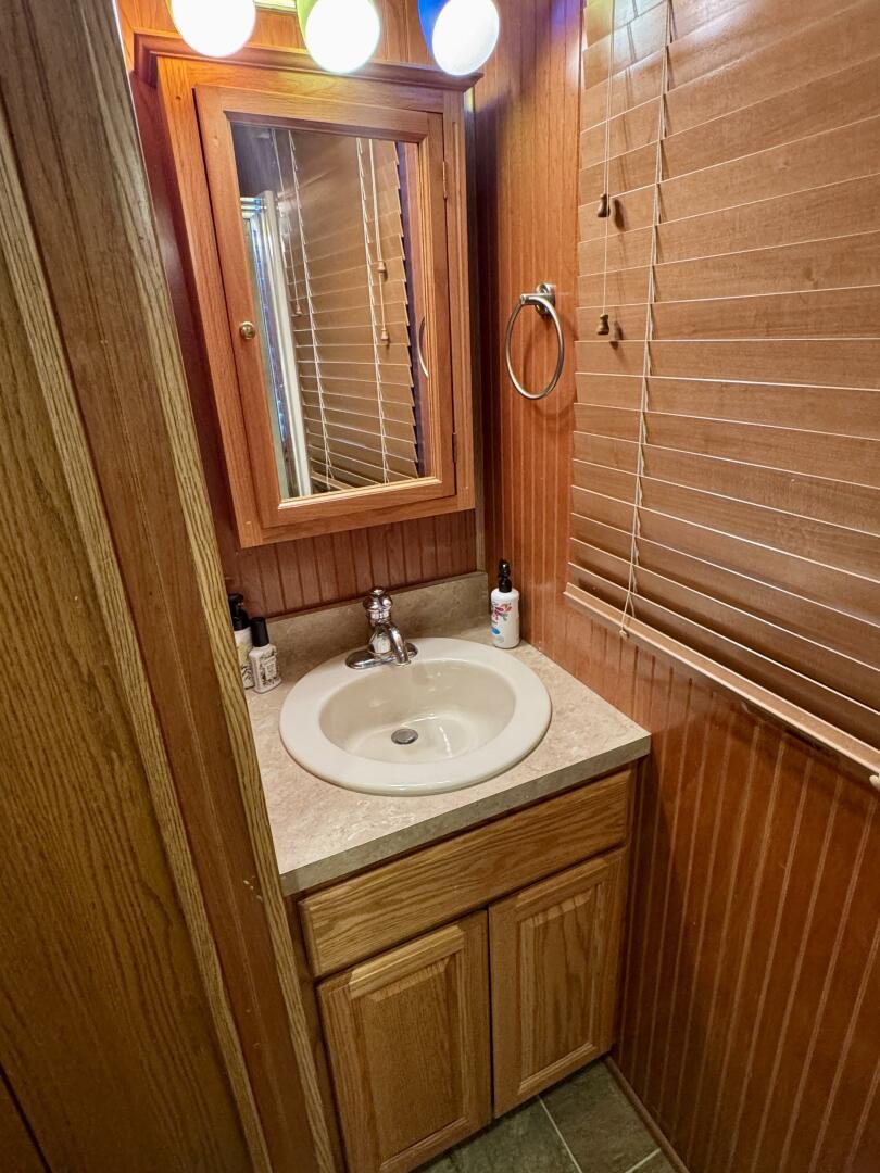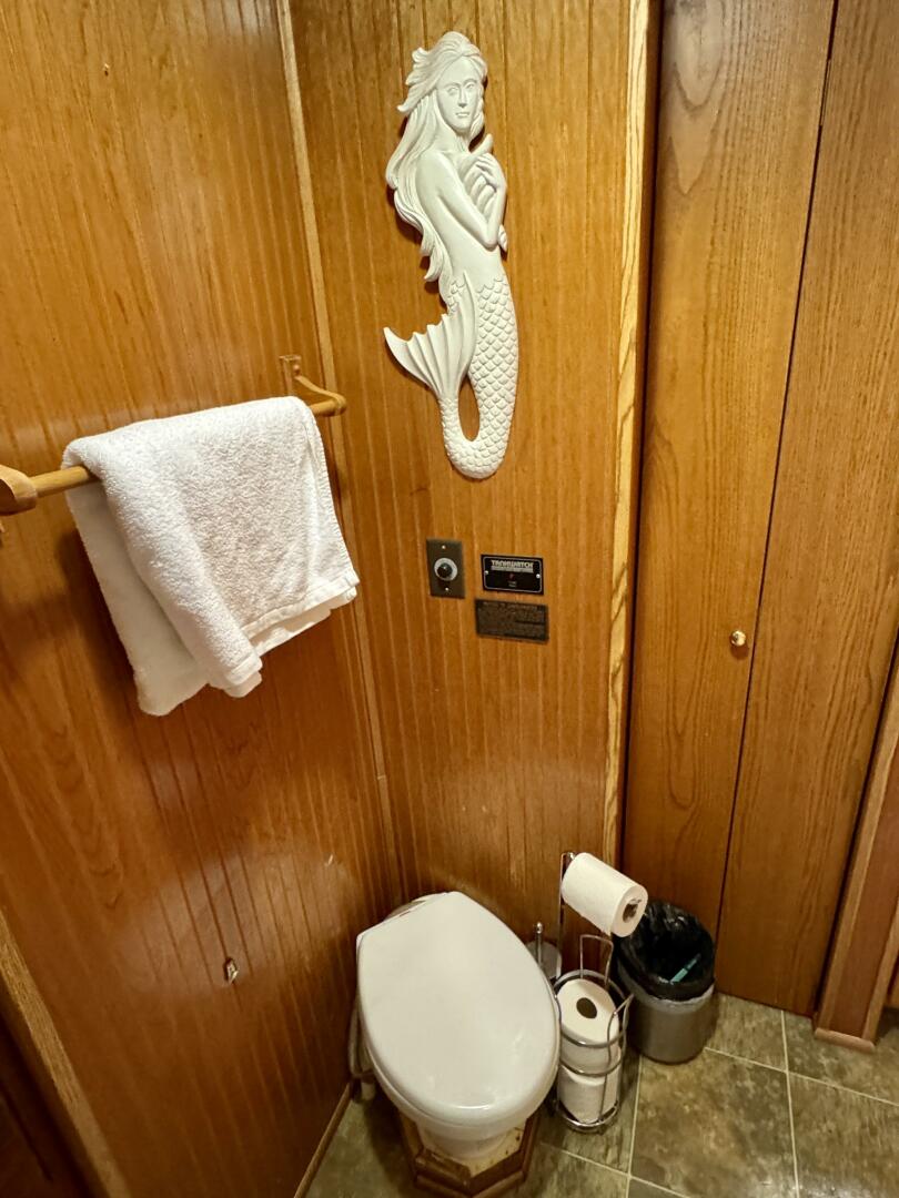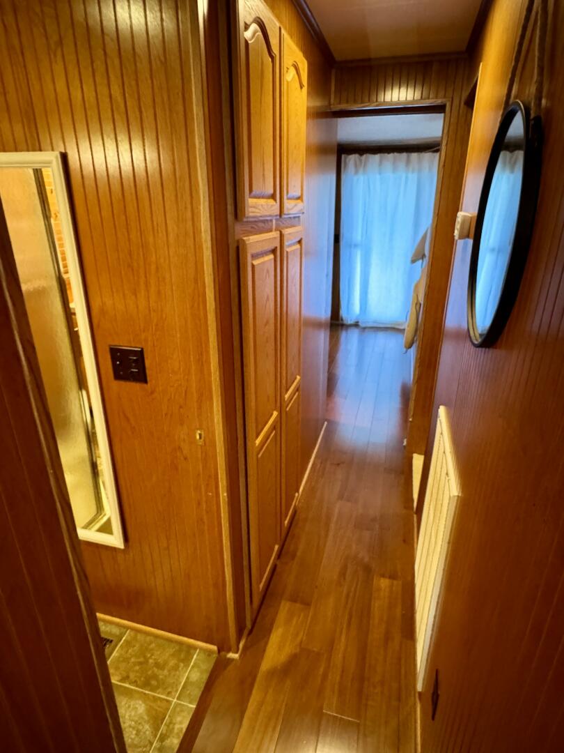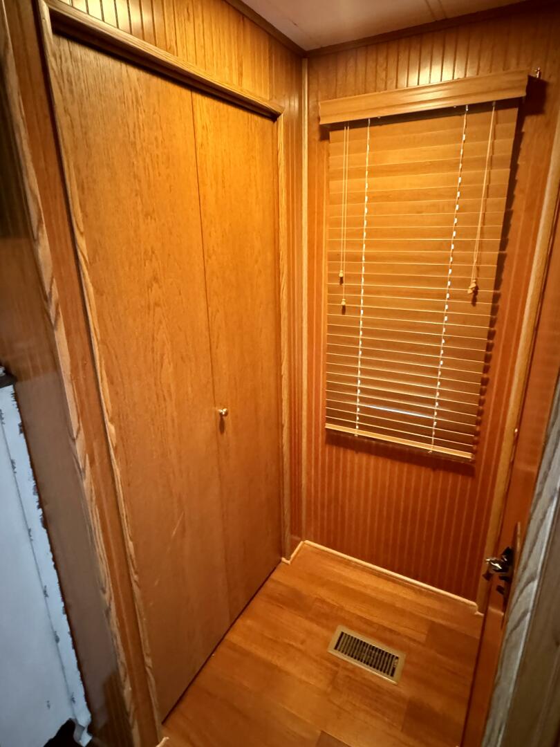 Back down the main level, moving aft and to starboard is the full bath with a marine head, walk in shower, vanity sink with integrated medicine cabinet. Returning to the hallway and moving aft, then to port you'll take a few steps down into a double cuddy, towards the bow you'll find another full size bed, small television with DVD player, and dresser drawers. To aft you can choose to enter the crawl-in cuddy with another full size bed and a 32'' amazon fire HDTV.