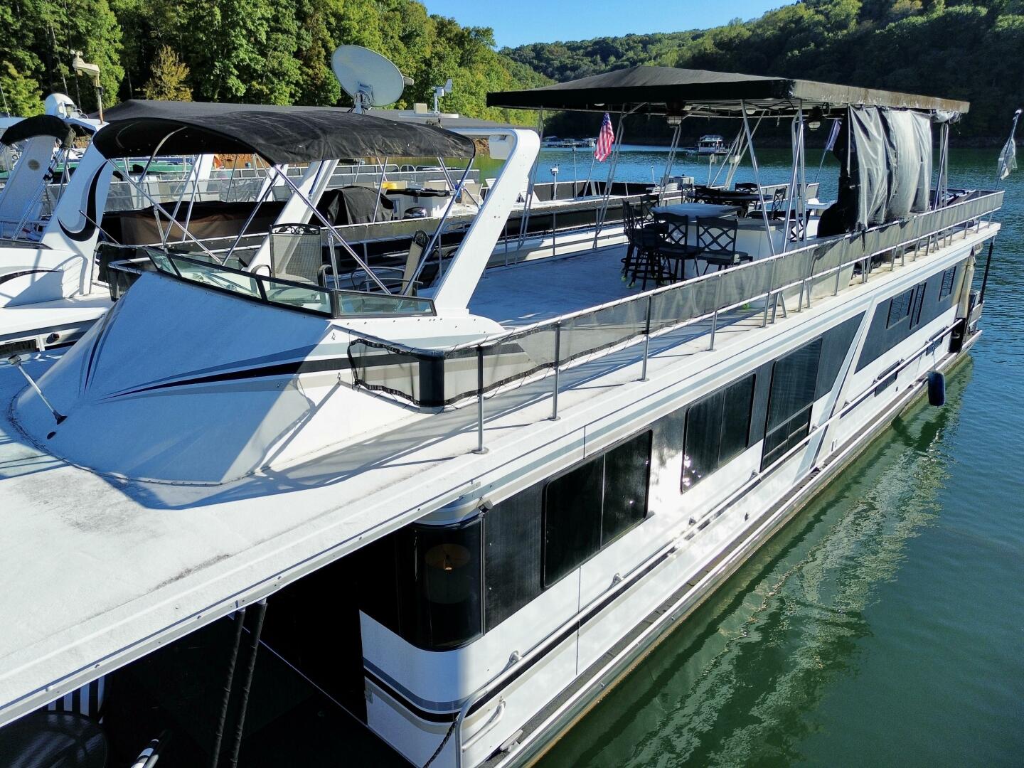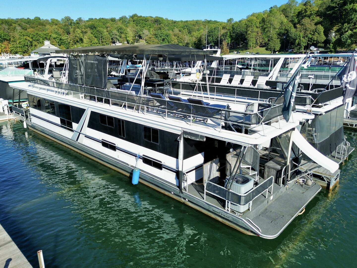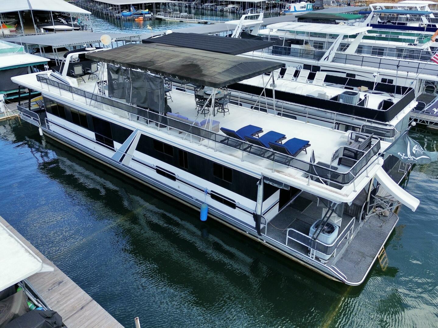 This 1996 Norris Yachts 16 x 74 Widebody - Aluminum Hull - Custom Built - Houseboat For Sale on Norris Lake Tennessee features 4 bedrooms/2 baths with central heat/air conditioning, wood floors, stainless appliances, a slide, party top, flybridge, a transferable slip on Norris Lake TN and much more!