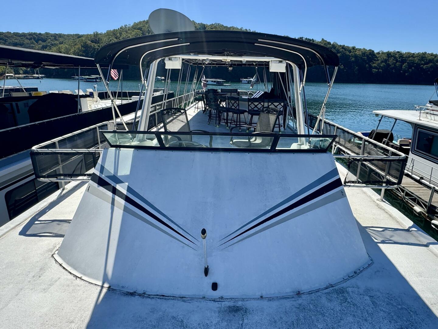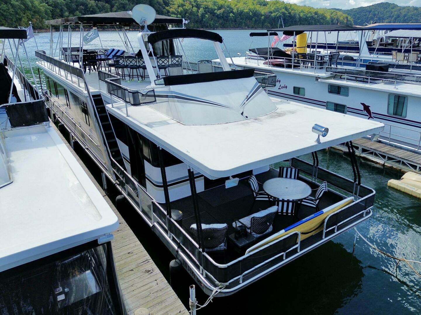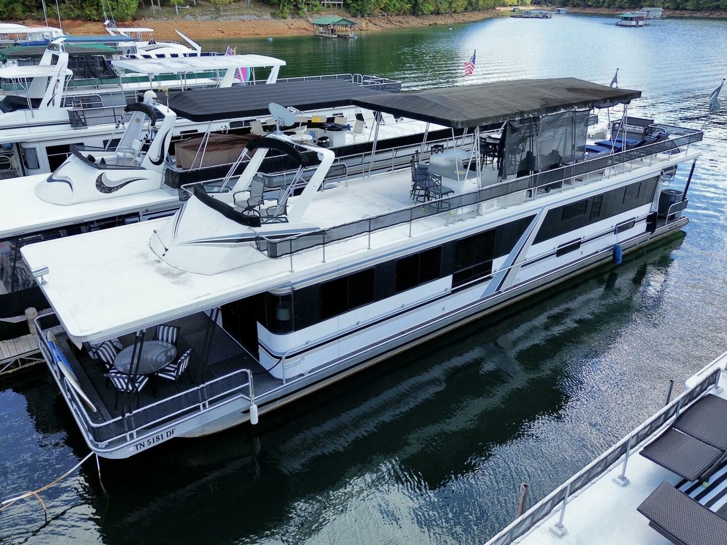 This 1996 Norris Yachts 16 x 74 Widebody - Aluminum Hull - Custom Built - Houseboat For Sale on Norris Lake Tennessee features 4 bedrooms/2 baths with central heat/air conditioning, wood floors, stainless appliances, a slide, party top, flybridge, a transferable slip on Norris Lake TN and much more!