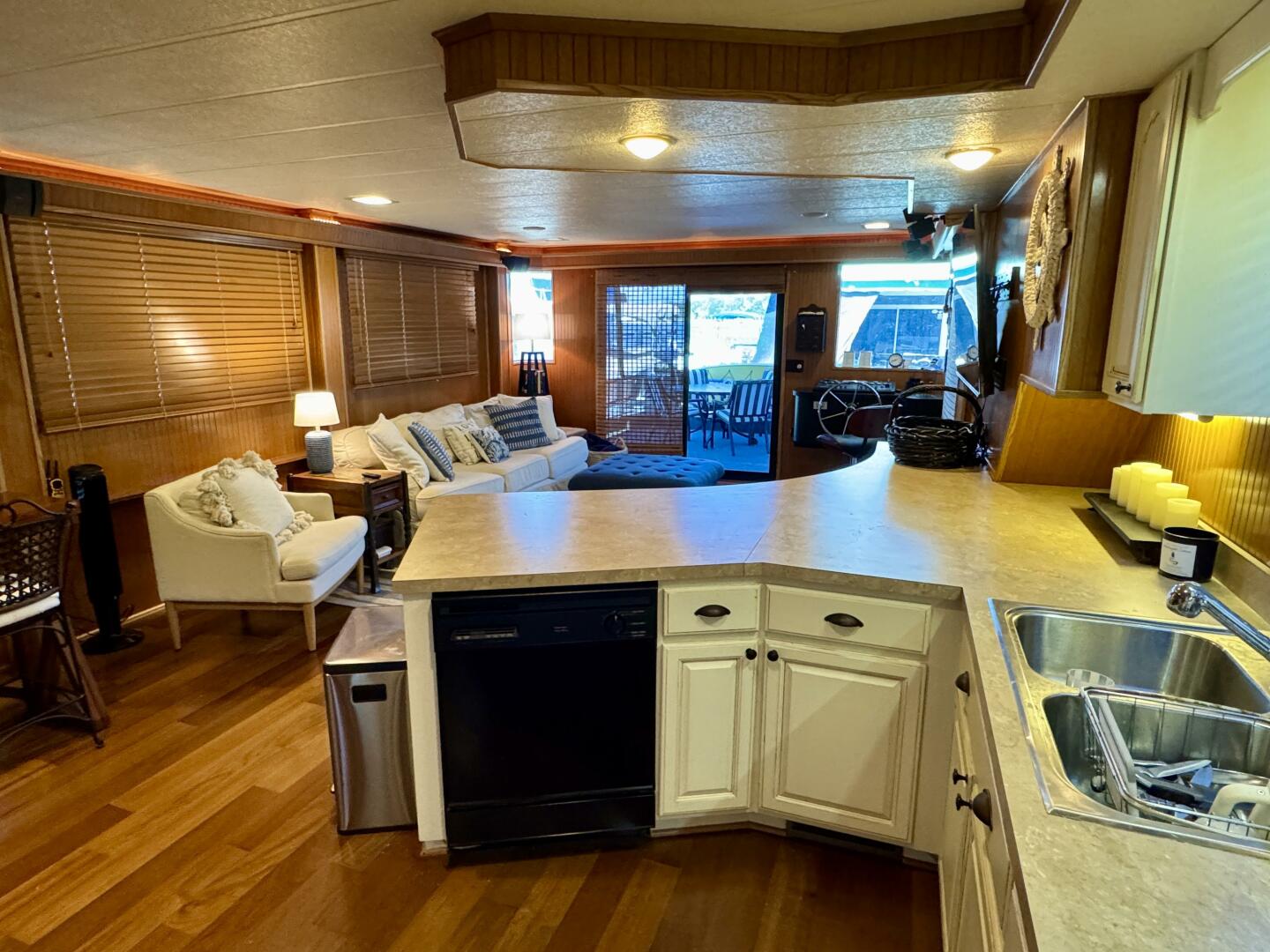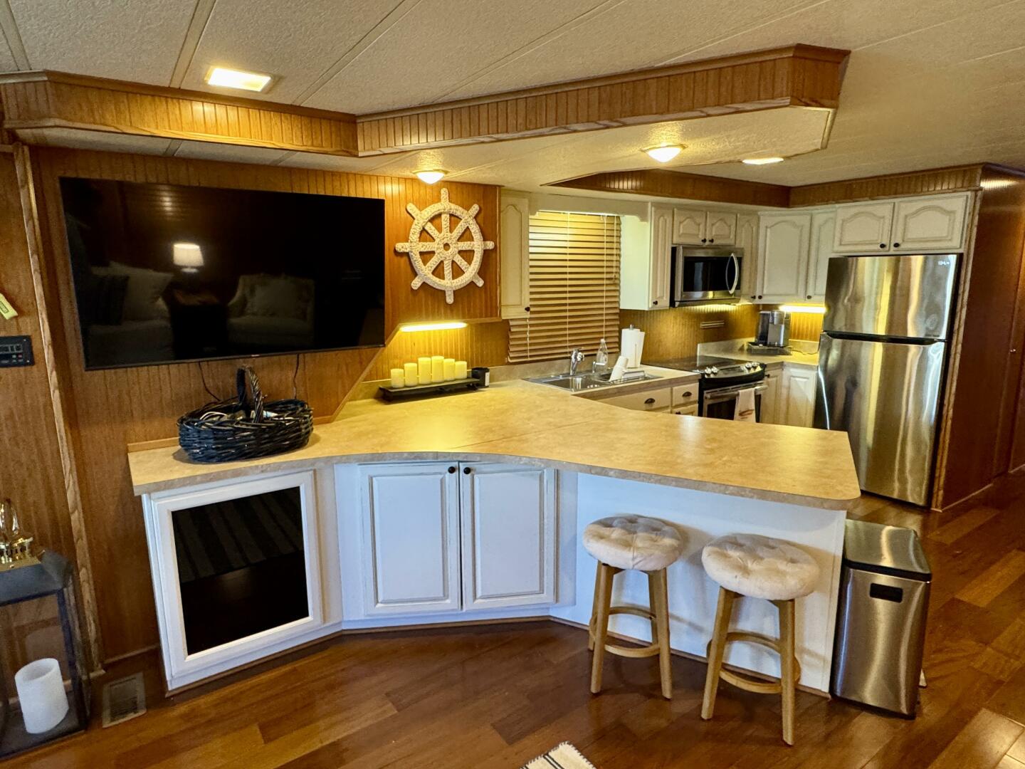 Back at the helm and turning to port you'll find a sofa, chair, and oversized ottoman which faces a 55'' roku HDTV with Bose surround sound, a DVD player, and A/V receiver. Moving aft, an integrated bar/countertop provides extra counter space when you've got a full house and to port is an expandable bar height table with storage cabinets and a convection toaster oven. To starboard is the full galley with an under counter dishwasher, double stainless sink, stainless OTR microwave, stainless 5-burner smooth top oven/range, and stainless refrigerator/freezer with integrated ice maker, plus a Keurig is tucked away near the fridge.