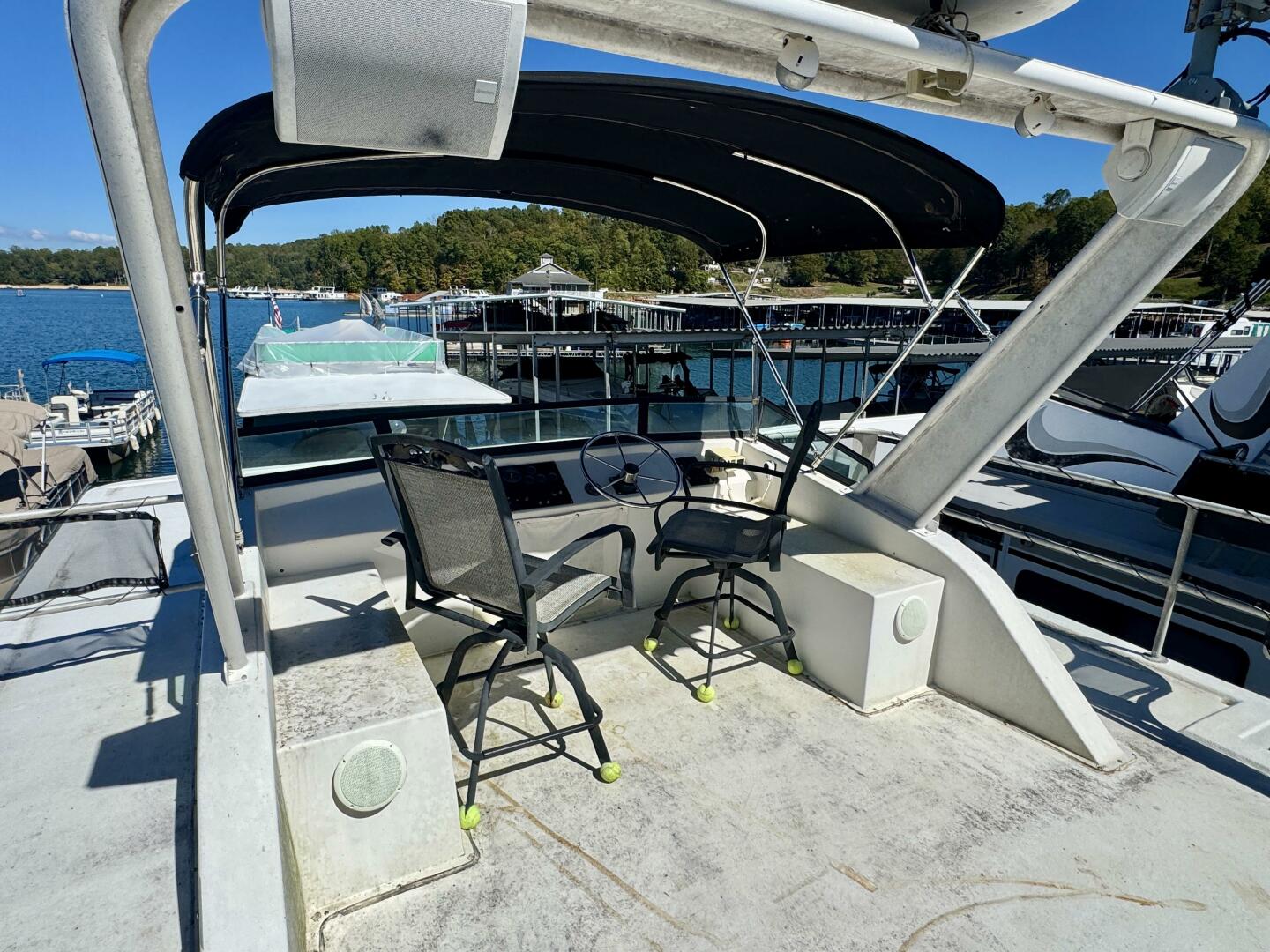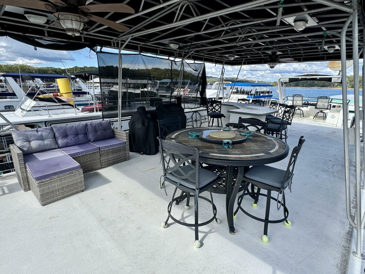 Moving farther aft you'll step down onto an integrated swim platform with swim boarding ladder which will come in hand after you've taken the plunge down the water slide from upstairs. A spiral staircase leads you up to the upper level where you'll find an open sun-bathing area with a couple of lounge chairs. A 26' canvas party top has been raised to allow extra headroom and is equipped with lighting and two ceiling fans and provides cover for a bar height patio table/chairs, a patio sofa, and a roof bar that houses a fridge. Moving towards the bow you'll find the second helm equipped with full engine controls and instrumentation, a second *rudder angle indicator gauge (*also incorrectly referred to as an engine synchronizer gauge in the spoken audio), a VHF radio, stereo remote, and bimini top overhead.