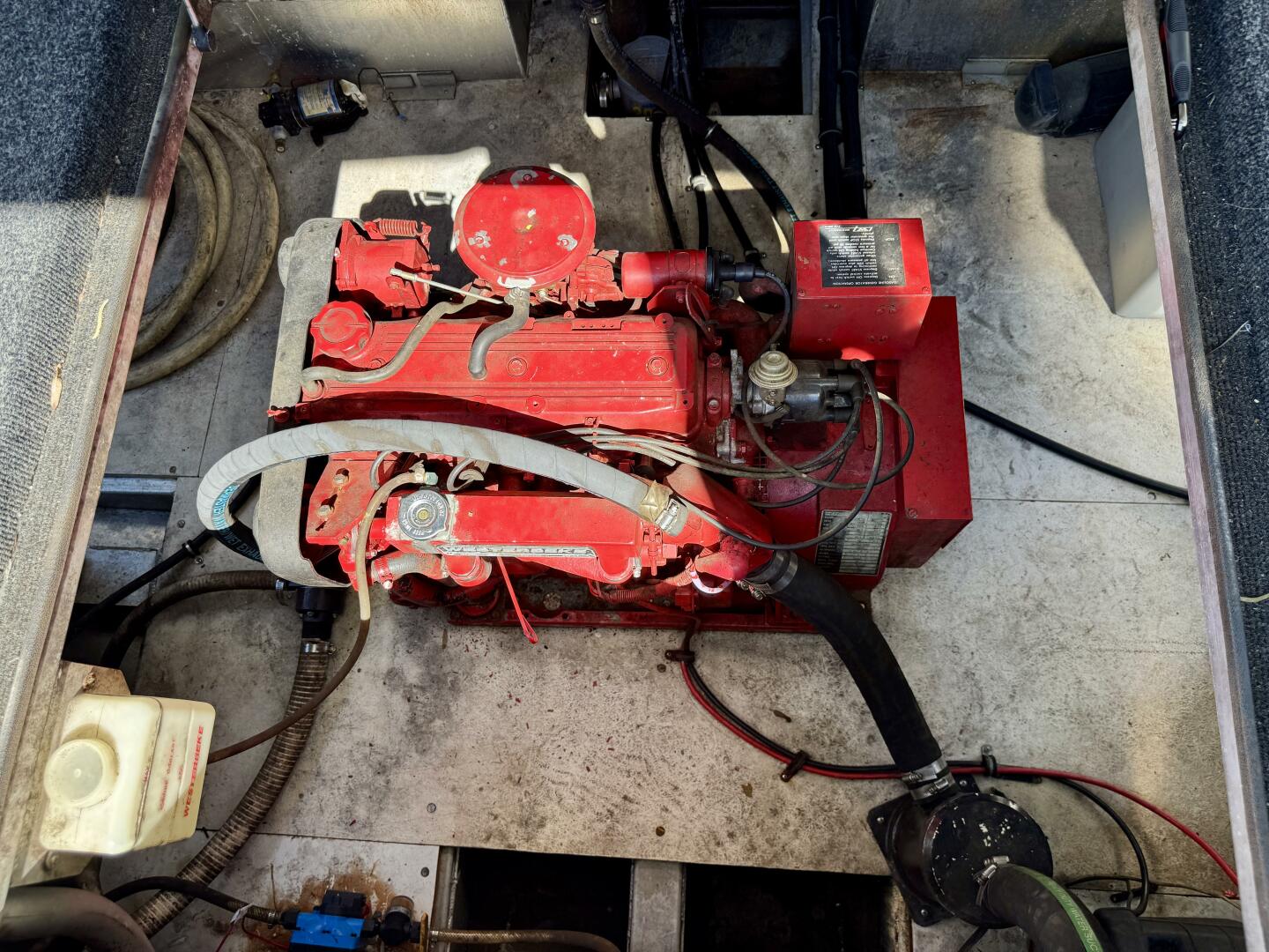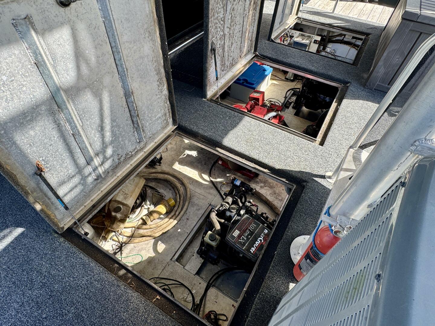 You can exit out the aft sliding door from the master stateroom to the rear deck where you'll find 3 hatches for both engines and the generator. The engine room is also equipped with a halon fire suppression system, two onboard battery chargers (one for the house batteries, the other for the generator and engine starting batteries), two aluminum full tanks, and the necessary equipment - bilge pump, blower, etc.
