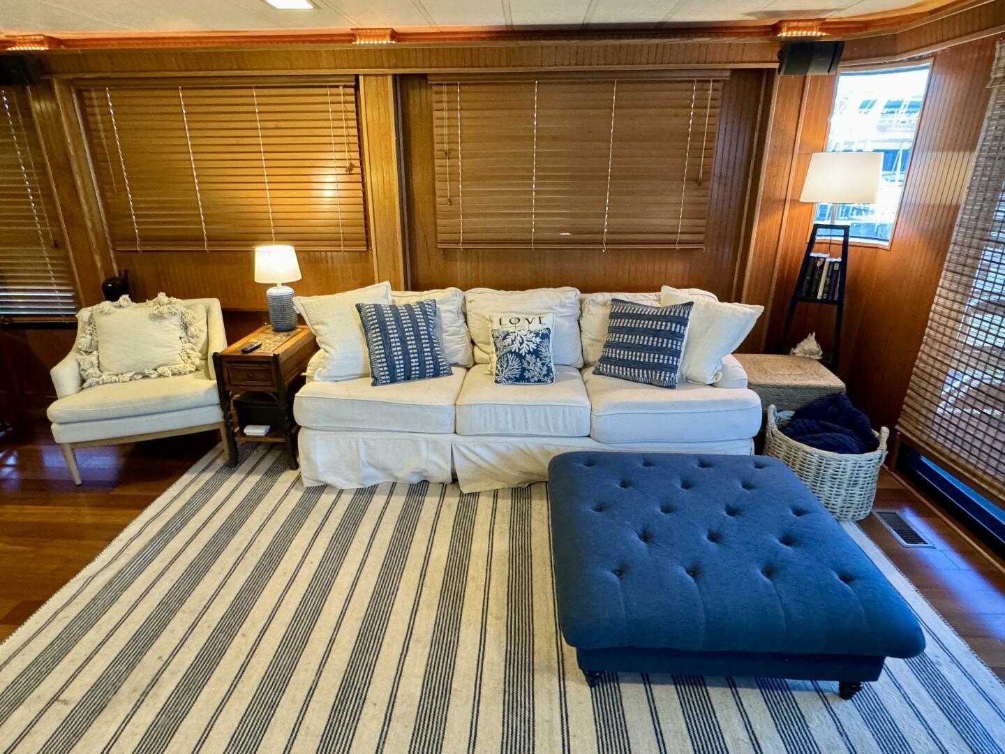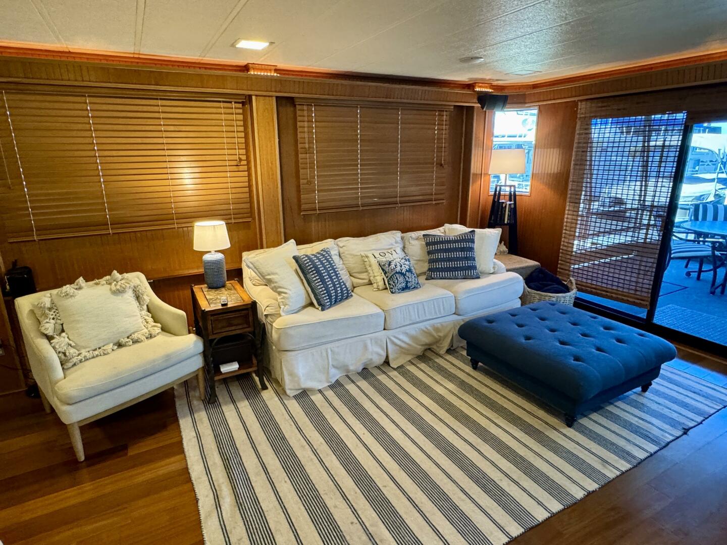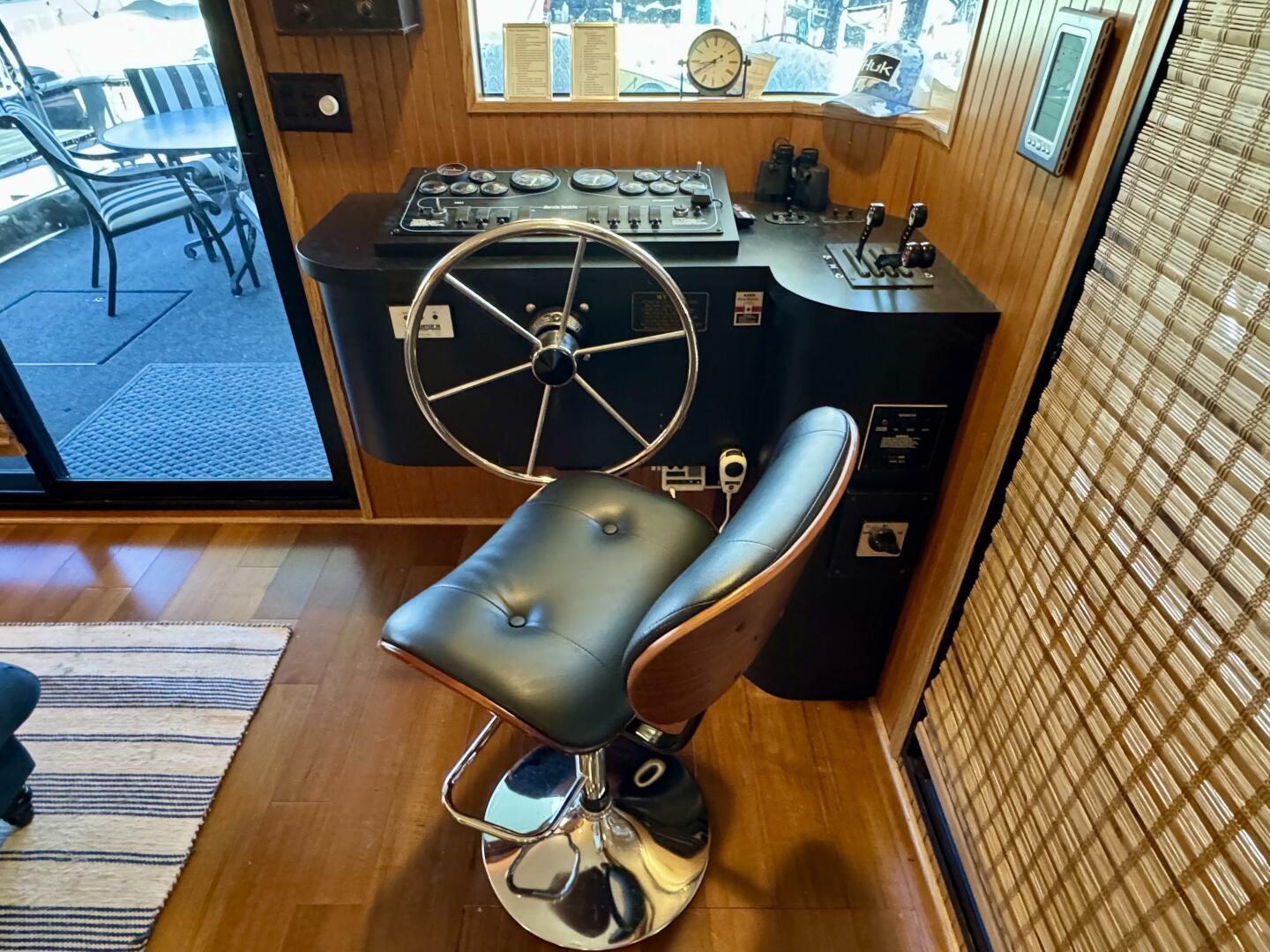 Stepping aboard at the bow under a covered patio with ceiling fan overhead and patio table and chairs, storage is underfoot and houses inverter batteries and a partial front canvas issinglass enclosure. Entering the cabin through the sliding door, the lower helm station is to starboard and is equipped with full engine instrumentation for both engines, remote start for the generator, stereo with zoned audio throughout, depth finder, spotlight controls, a VHF radio, and a *rudder angle indicator gauge (*which was incorrectly referred to as an engine RPM synchronizer gauge in the video) & more. Underfoot you'll find a hatch that gains access to the hull space below the cabin floor - abundant storage is available here as well as access to your plumbing, an aluminum fresh water tank, central heat/air duct work, electrical, the interior air handler, an inverter, bilge pump, and more storage space.
