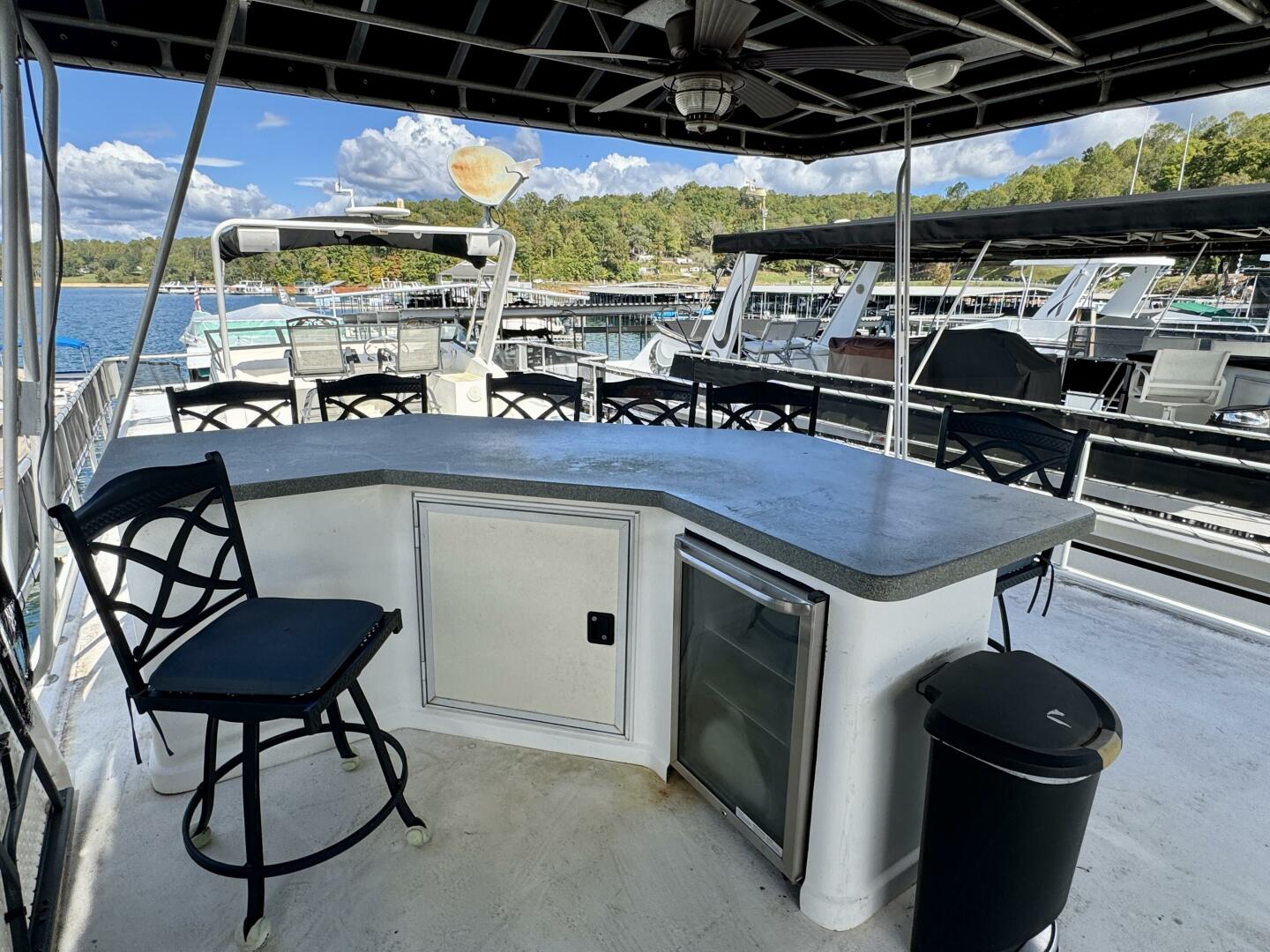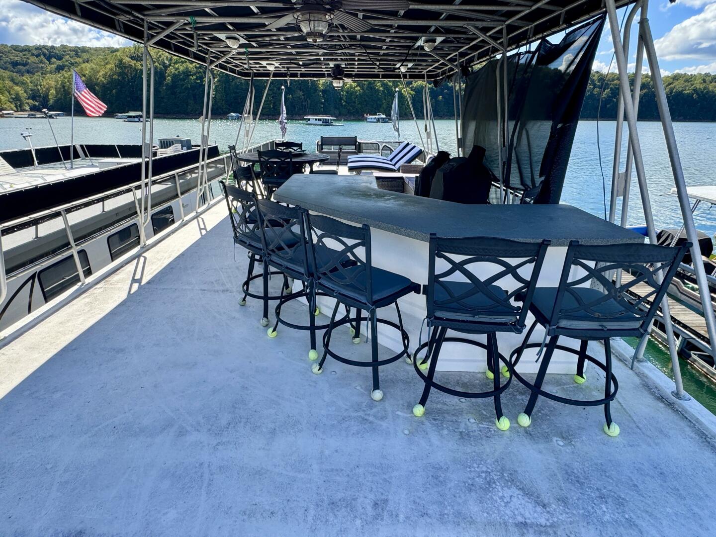Dual Helm Flybridge w/Bimini Top, Roof Bar w/Frigidaire Fridge, Lounge Chairs, Patio Furniture, Bar Table/Chairs,