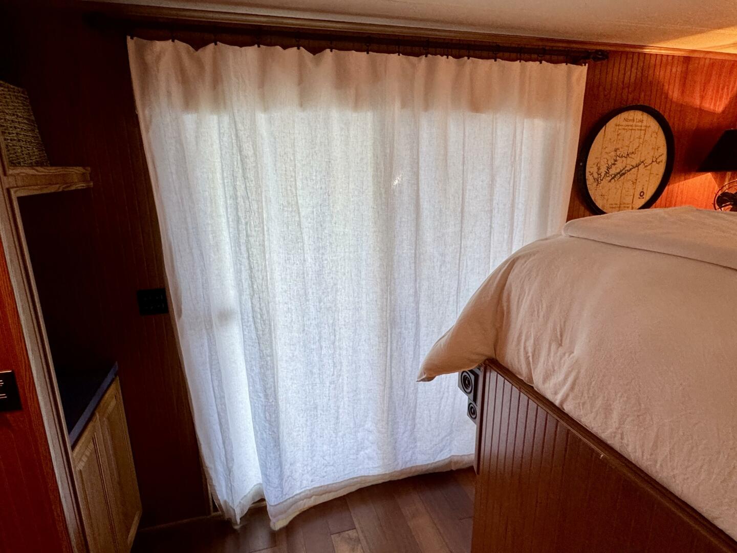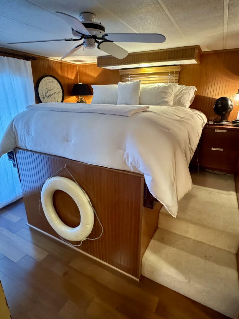 Returning to the main level and venturing farther aft you'll enter the full beam master stateroom with elevated king size bed (to allow for headroom in the cuddy below) with steps going up to each side of the bed, each side with floating nightstands and a ceiling fan overhead. Cedar lined hanging closets are to the starboard side and aft of the on-suite master bathroom which is equipped with a marine head, a shower/tub, and a vanity sink with integrated medicine cabinet.