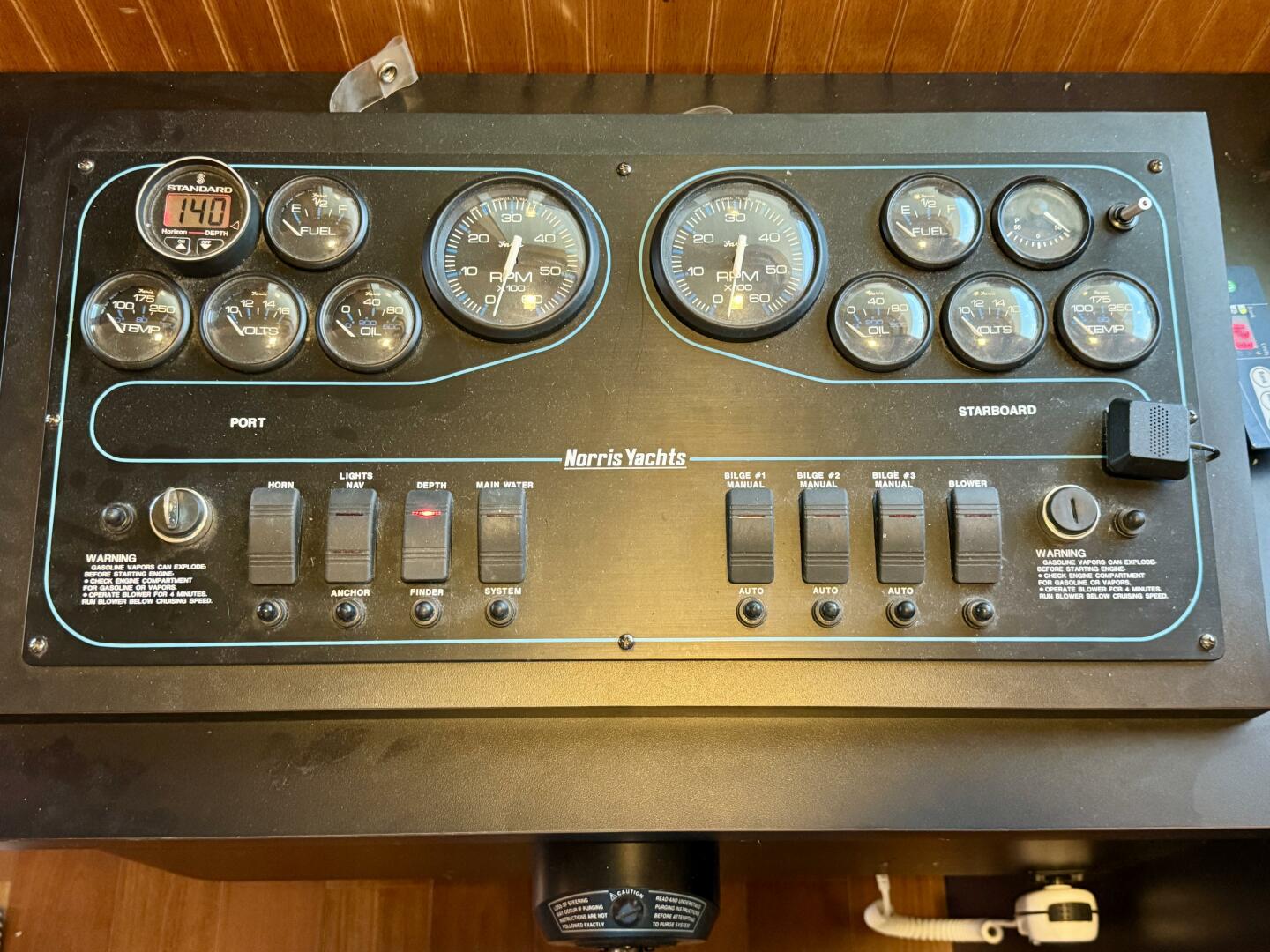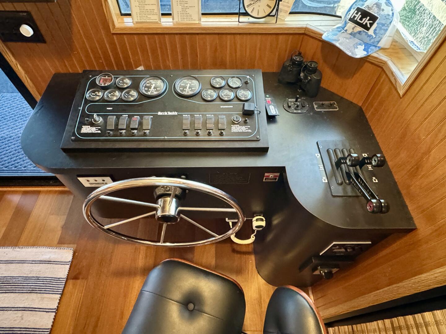 Upper/Lower Helms: VHF Radio, Rudder Angle Indicator, Port & Starboard: Fuel, Engine Temp., Battery Volts,