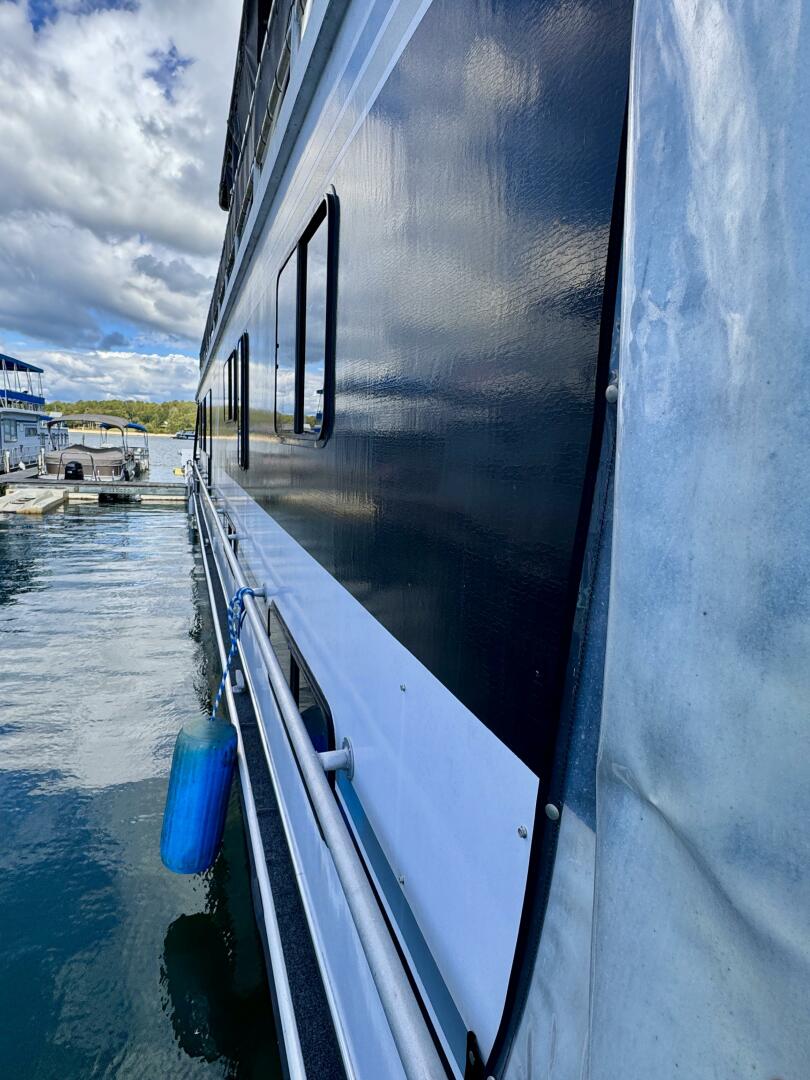 This 1996 Norris Yachts 16 x 74 Widebody - Aluminum Hull - Custom Built - Houseboat For Sale on Norris Lake Tennessee is equipped with twin 3.0L Mercruiser 4-cylinder inboard/outboard engines with Alpha One outdrives and a 12.5 KW Westerbeke generator. This 4 bedroom/2 bath houseboat features a king size master stateroom with on-suite full bath and 3 full size guest staterooms, central heat/air conditioning, wood floors, stainless appliances, a water slide, 26' canvas party top with upgraded headroom, a roof bar with integrated fridge, dual helm flybridge with bimini top, a transferable slip on Norris Lake Tennessee and much more!