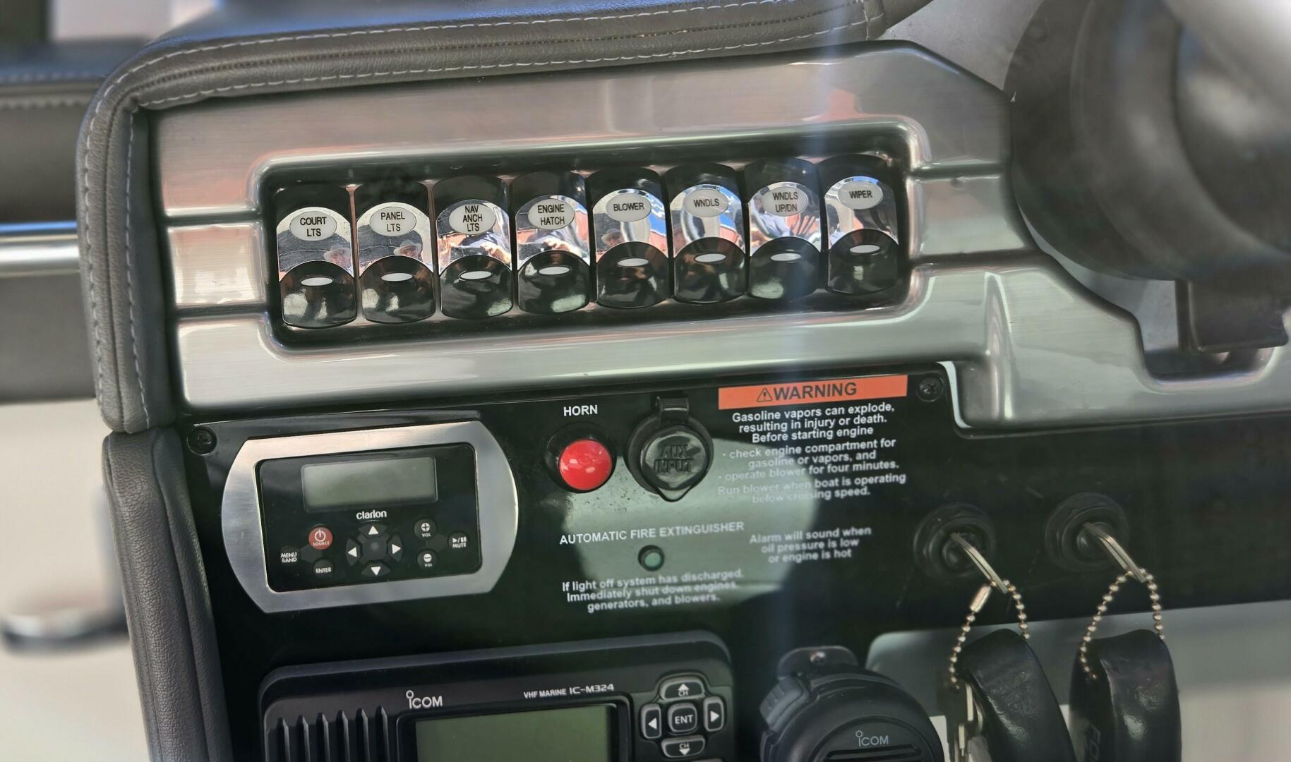 • Clarion® waterproof transom-mounted stereo control & two 61/2? speakers w/polished stainless grilles