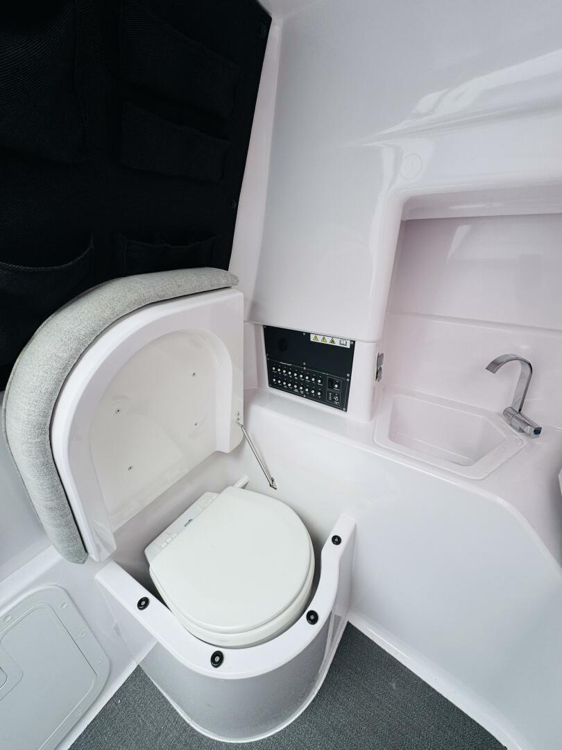 • As you descend into the cabin, a private head is located to port, along with a settee featuring a molded sink