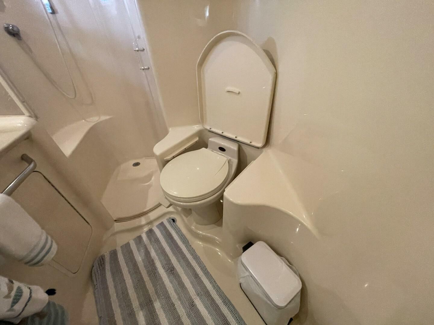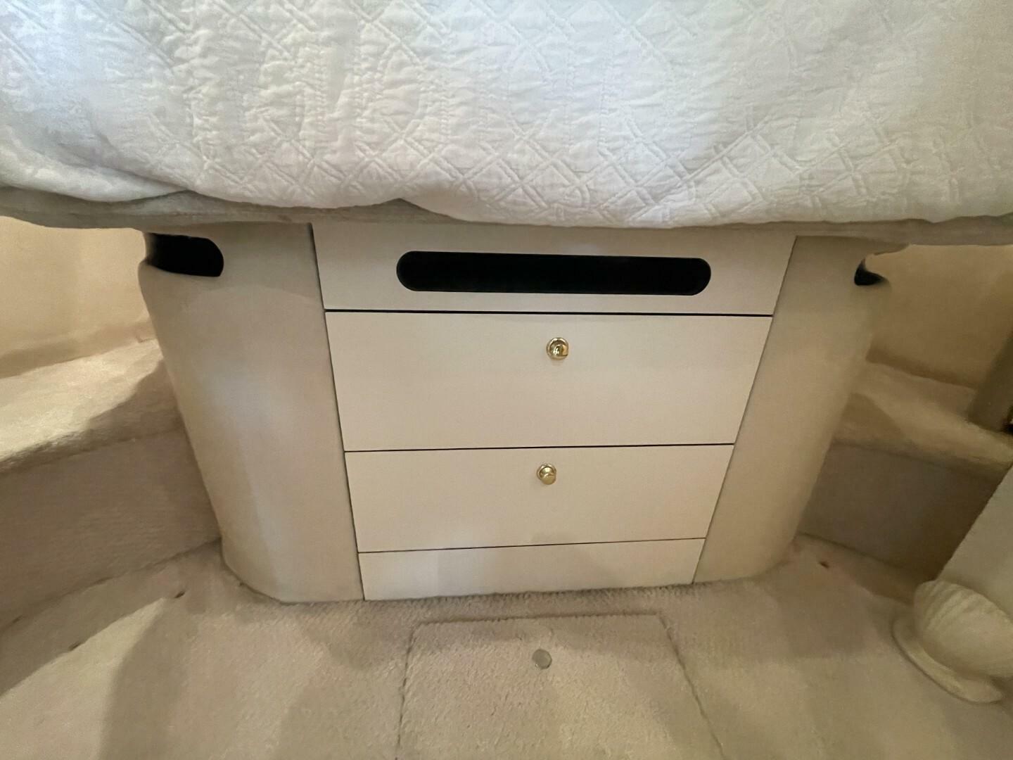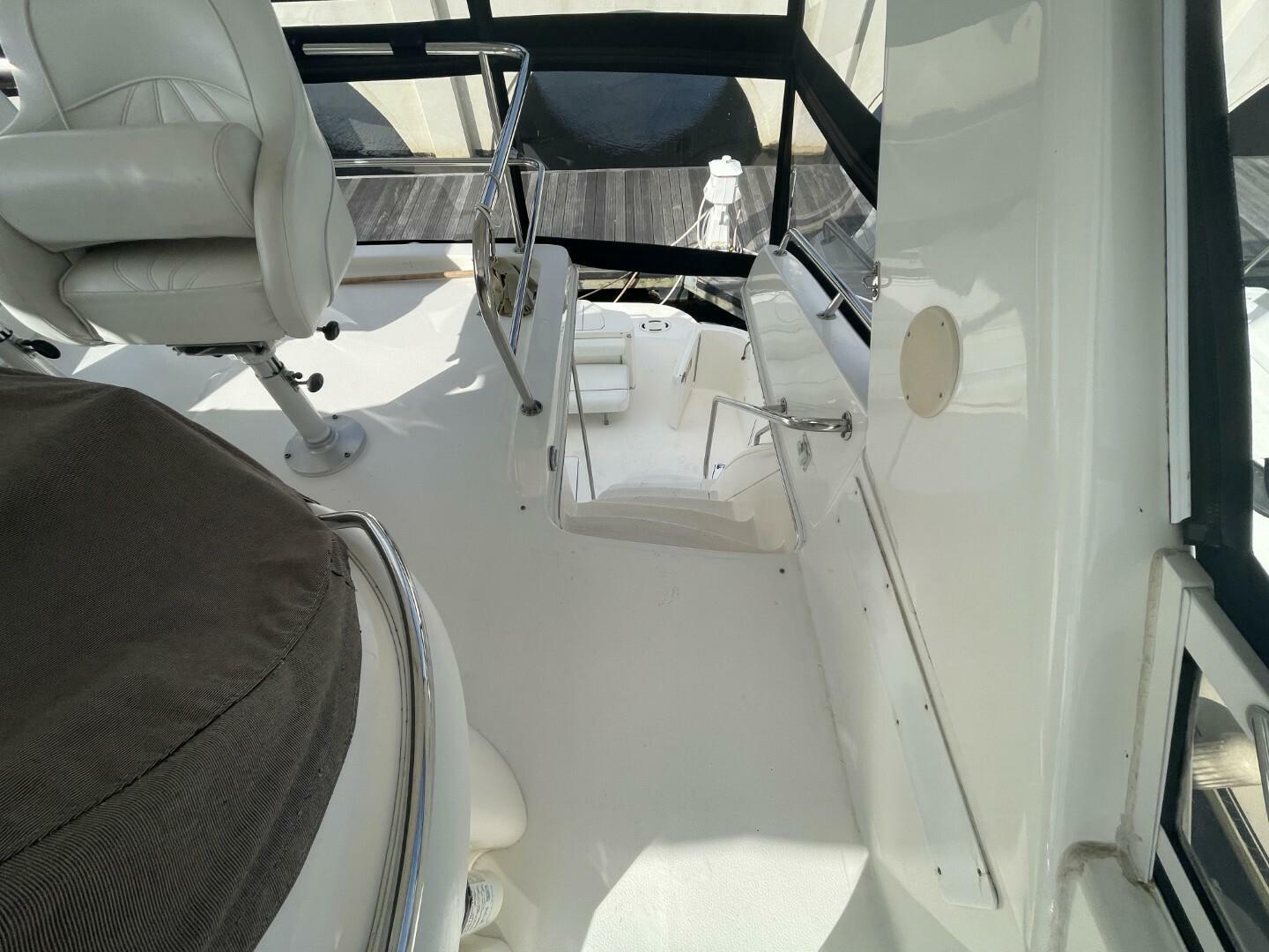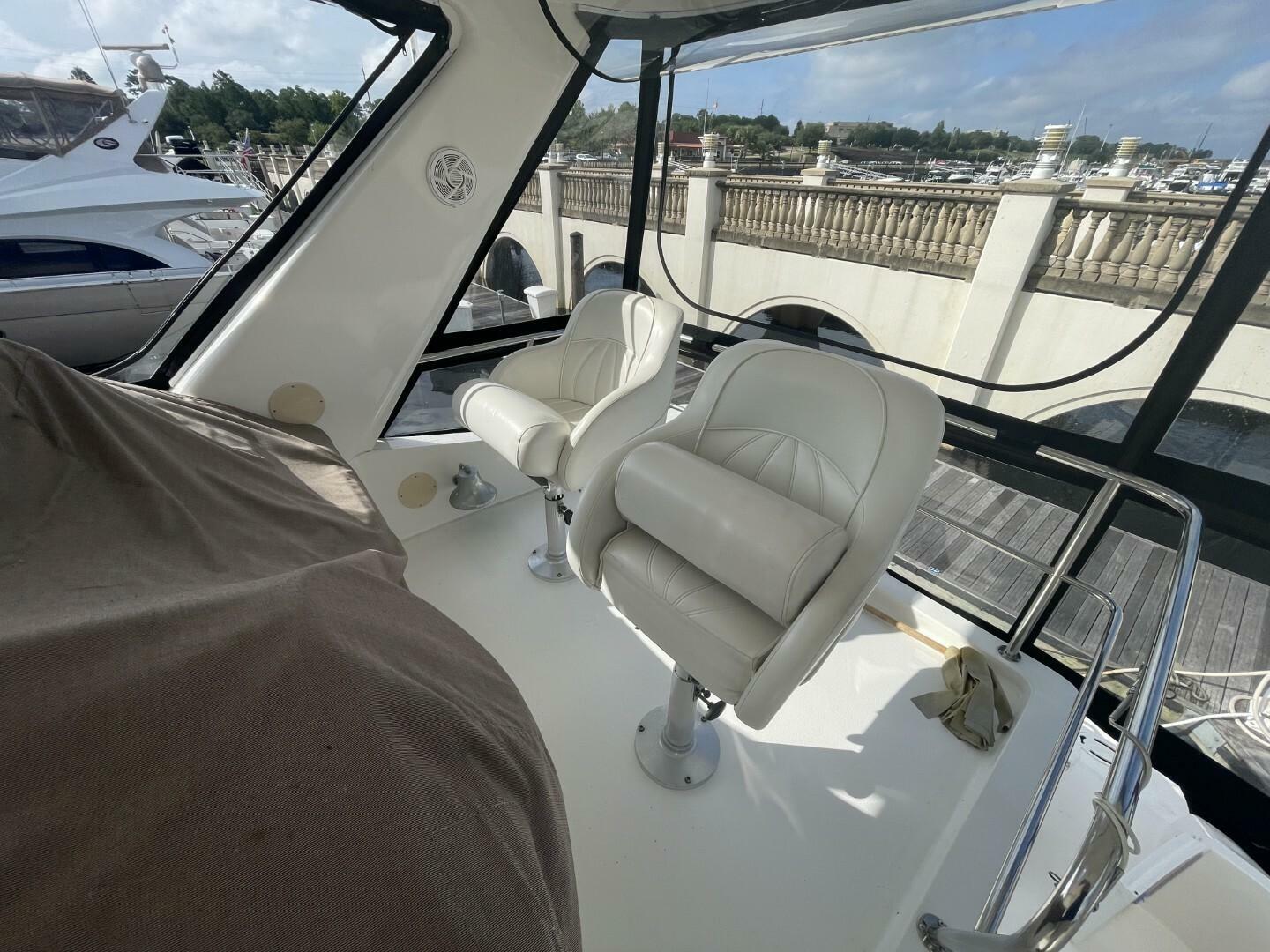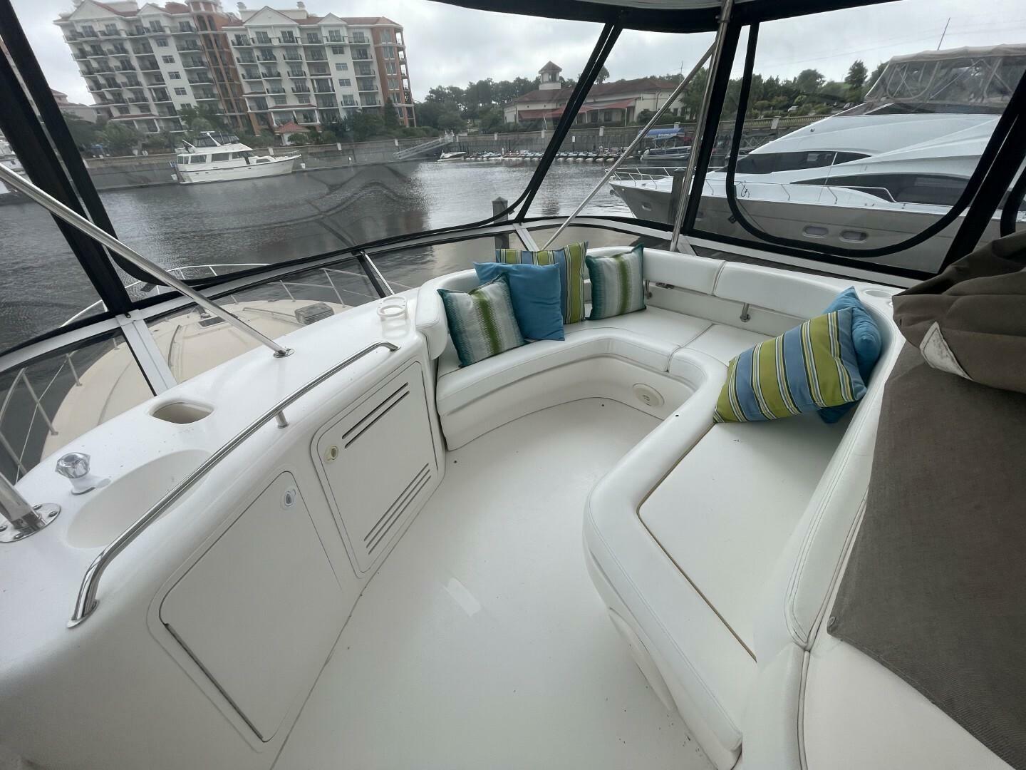 Starting as you board her from the large Swim Platform, you enter her cockpit which has been enclosed to make a great outdoor sitting area. She has a large storage hatch in the transom along with a bench seat. Her engine access is through a large hatch in the cockpit sole. Her cockpit, stairway to the bridge and bridge deck is on the port side. The stairway to the bridge is wide and easy to navigate. Her bridge is large and has her helm station with two swivel seats, a wet bar and l-shaped lounge forward, all kept comfortable by the reverse cycle heat and air. From the cockpit you enter her cabin via a sliding glass door and the first area is the salon, dinette and galley area. She has a settee along the port side that is electronically converted into a berth with the dinette forward. Her starboard side has an occasional chair and entertainment center, a country kitchen bar and galley forward. You move down the companionway steps and her guest cabin is to starboard and features an upper and lower berth that converts to a settee and is home to her washer/dryer. Her VIP Stateroom is to port and features a queen berth and entrance to the Guest Head (it also has an entrance from the companionway). All the way forward is her Master Stateroom which has an Island Queen Berth, Storage and entrance to the Master Head which is very impressive.