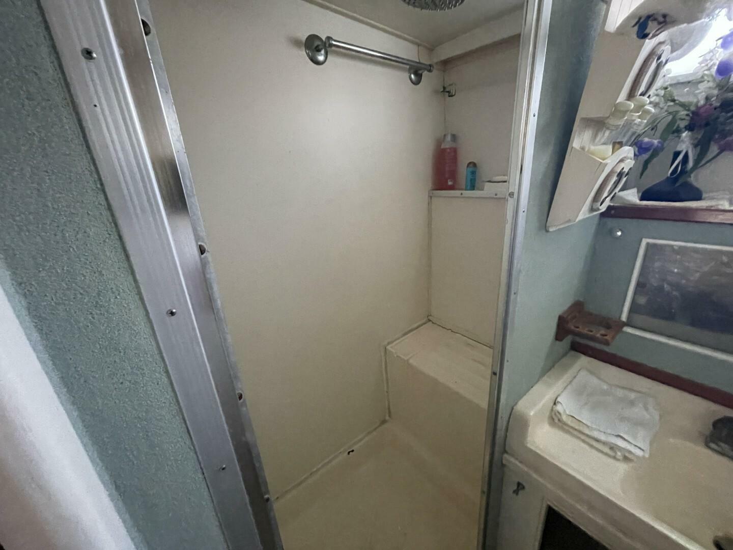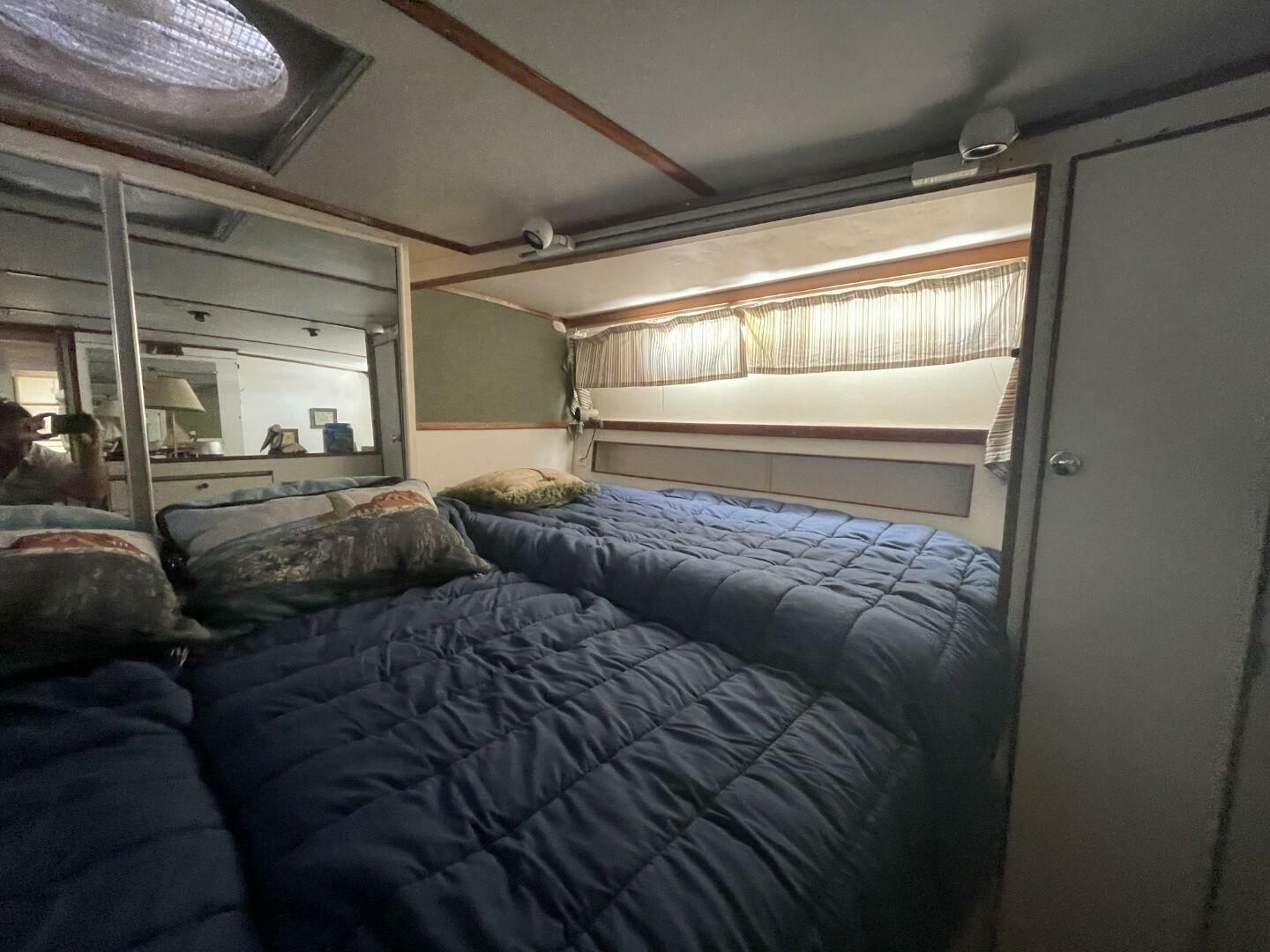 Starting forward is the head/shower. Moving back is the V-berth with two single berths. Stepping up is the galley port side and the salon on the same level. Stepping down is the head and stall shower starboard and single berth port. The master stateroom has a berth port and starboard with a large closet in the middle. Up to the large aft deck with plenty of room. Kenwood Stereo system; Sharp Television; Panasonic DVD/VHS