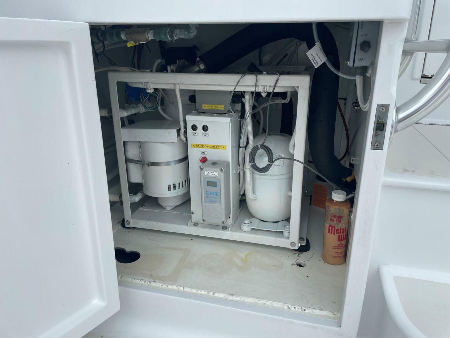 The U-shaped galley is forward on starboard side and features a large sink, electric stove, microwave, two Subzero refrigerator units under peninsula countertop, and an abundance of drawer and cabinet storage. The cabinets and drawers are white Formica with beautiful satin-finished teak trim. Galley sole is cherrywood with black accent grooves.
