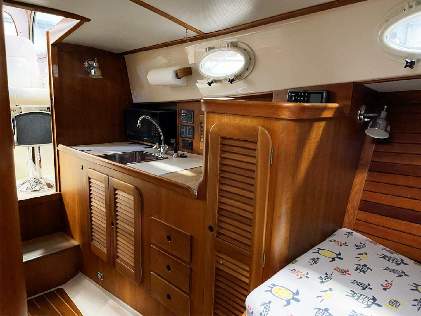 The wet bar at the aft end of the pilothouse includes molded sink with foldaway faucet and hot and cold pressure water, insulated and self-draining ice box, storage drawer to port, and locker to starboard. The sink and cooler have varnished teak covers. The engine box/wet bar and seat is hinged on the aft end and has an electric lift for easy access to the engine.