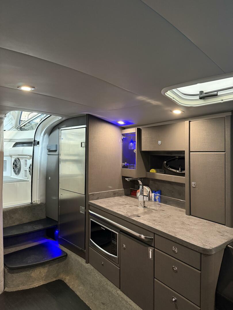 - Full Galley: Includes a Corian countertop, stainless steel sink, microwave, two-burner electric stove, and a refrigerator/freezer.
