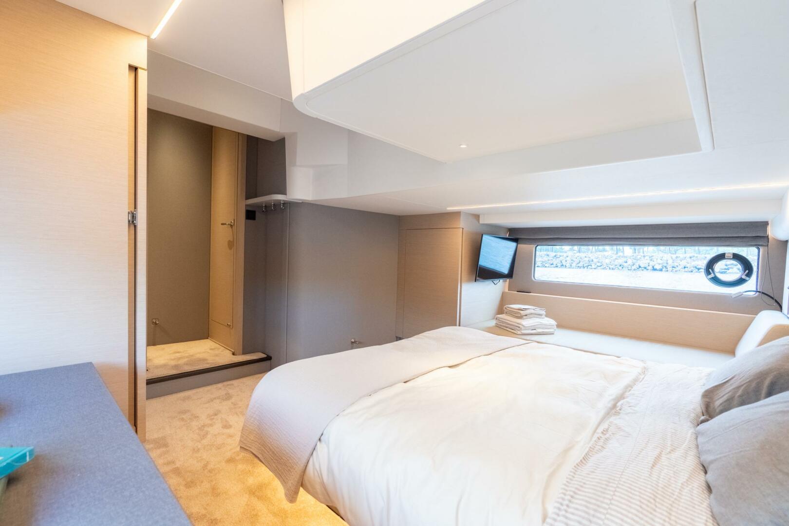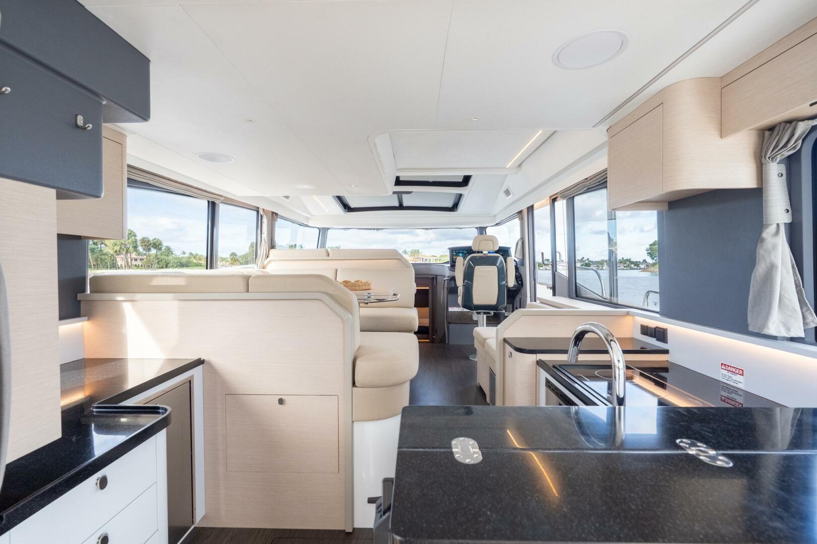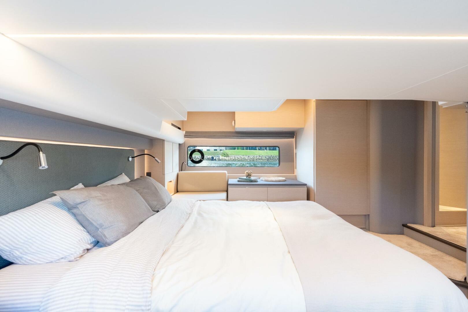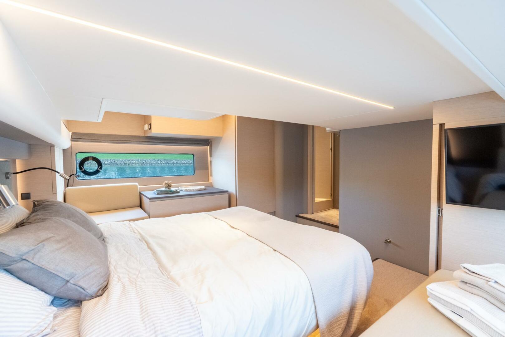 The interior is bright, modern, and meticulously finished, offering generous accommodations for extended cruising. Large panoramic windows flood the salon with natural light, while the open galley and dining area create a seamless social space. Multiple staterooms provide private, comfortable accommodations for owners and guests, making the 495 Fly equally suited for weekends aboard or longer coastal adventures.