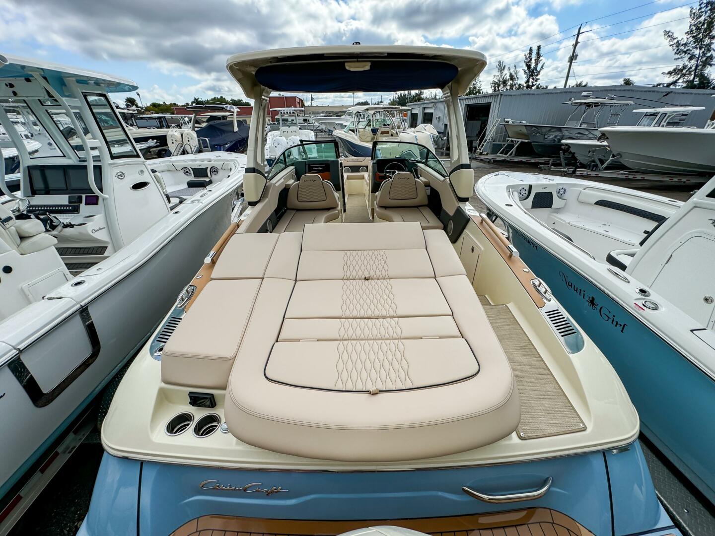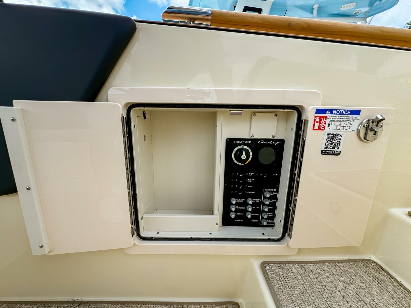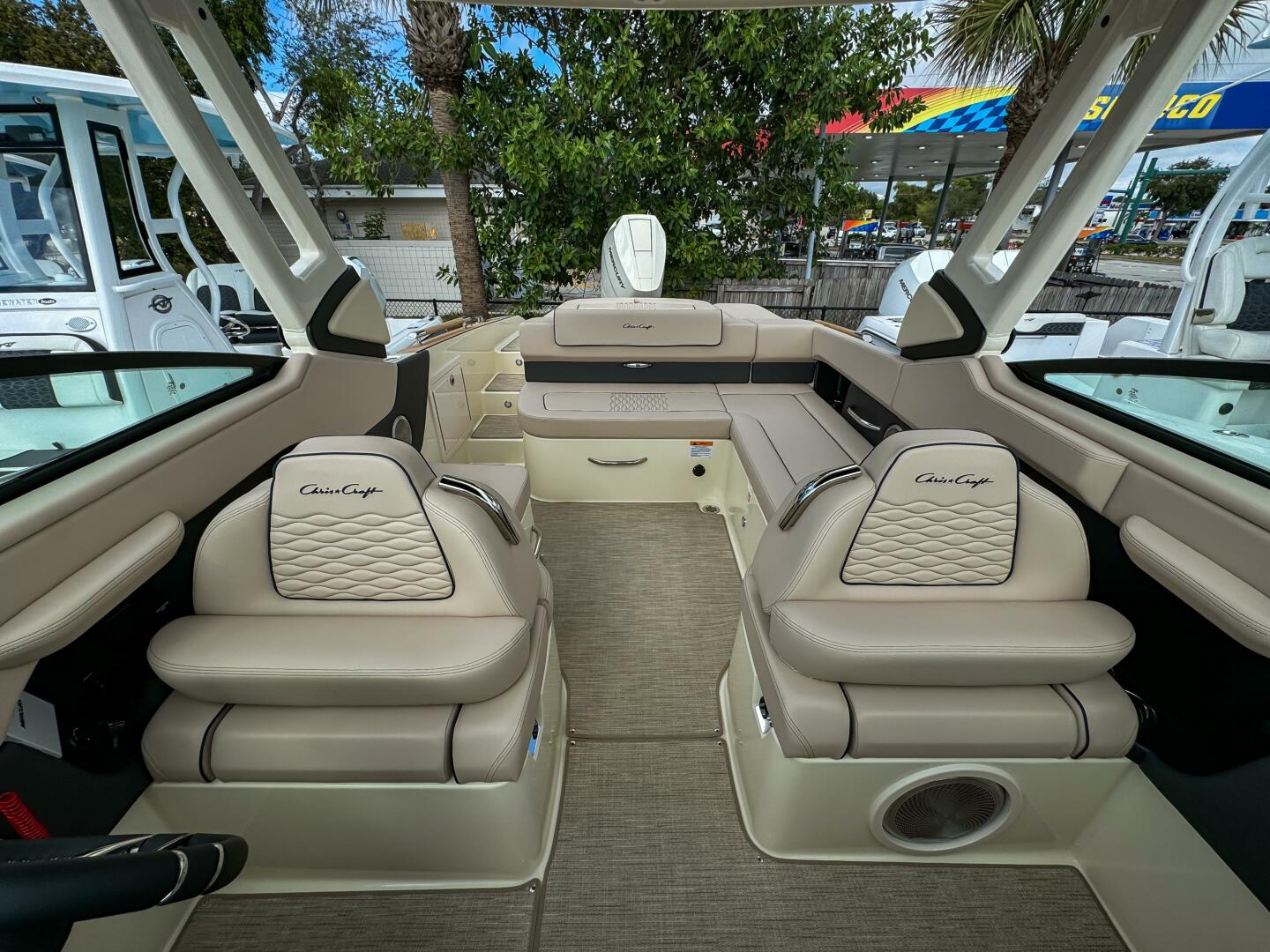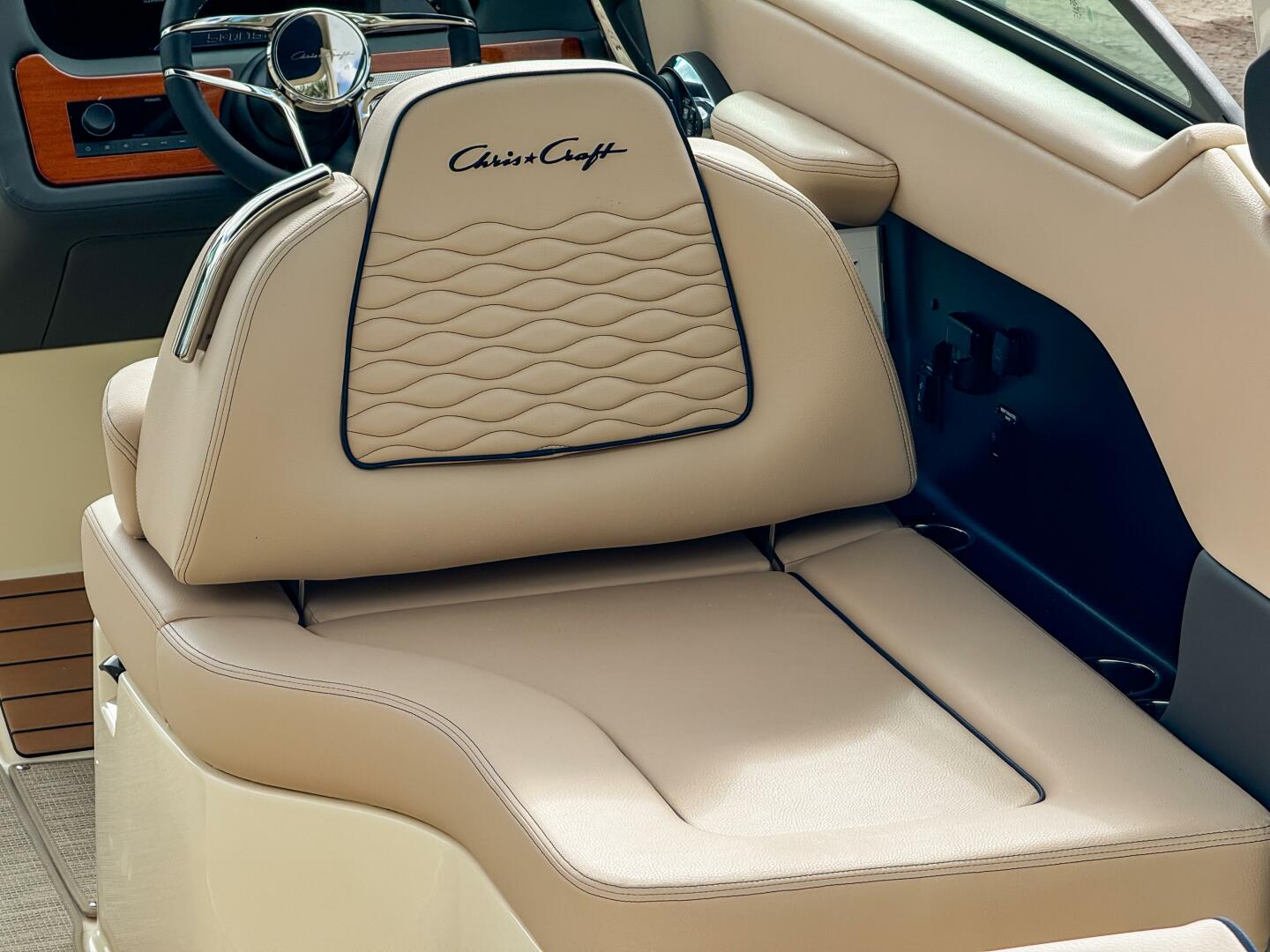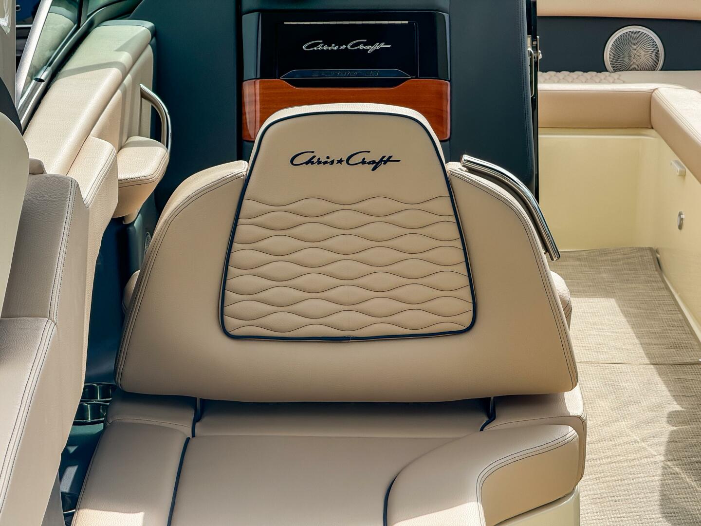 At the helm, dual Garmin 943 displays with Chris-Craft interface and C-Zone digital switching provide intuitive command of all onboard systems. Comfort is elevated with woven seagrass flooring, bow filler cushion, and a fully enclosed Tecma head with dockside pump-out.