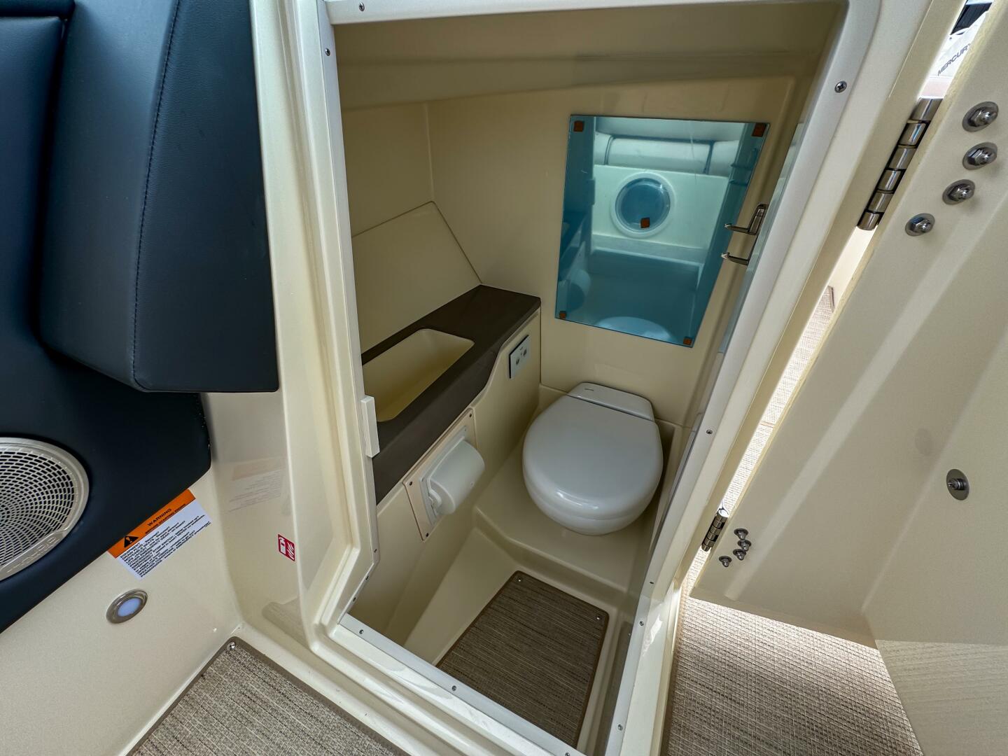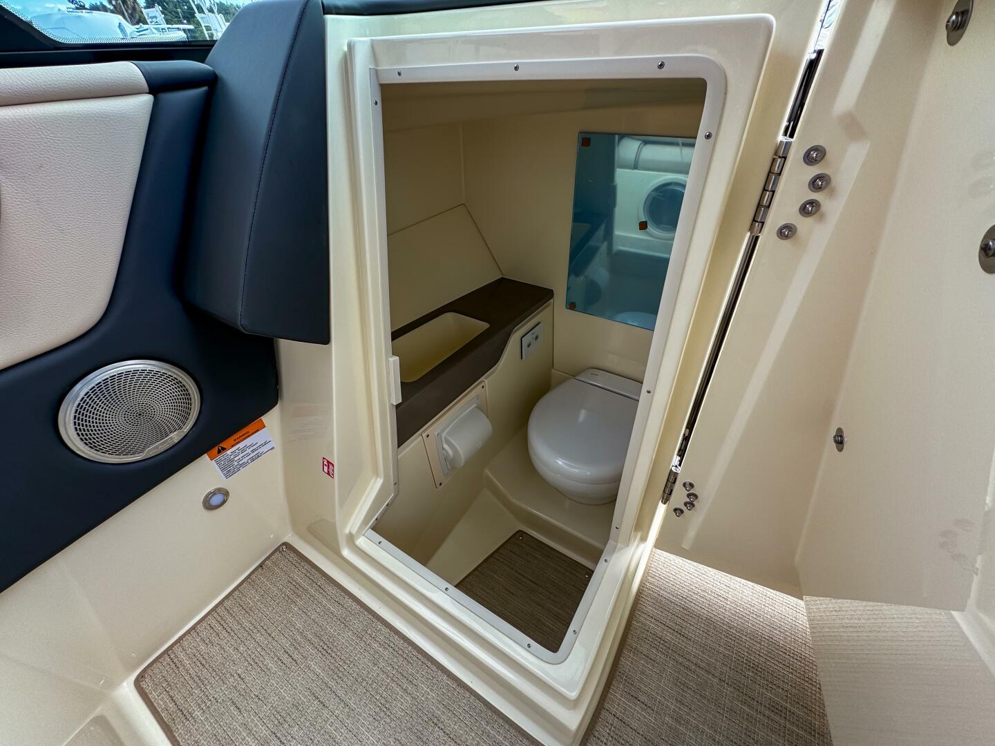 Entertainment is handled by a premium audio system featuring upgraded speakers, stainless grills, aft cockpit speakers, a 10” subwoofer, amplifier, and transom remote.