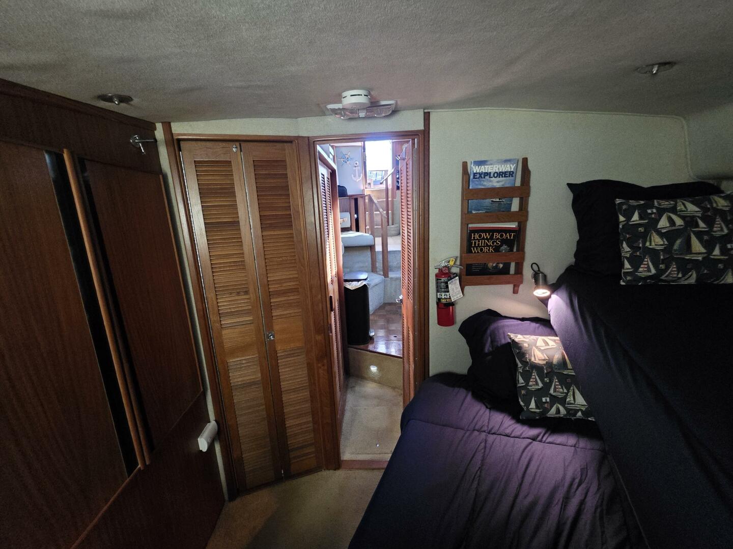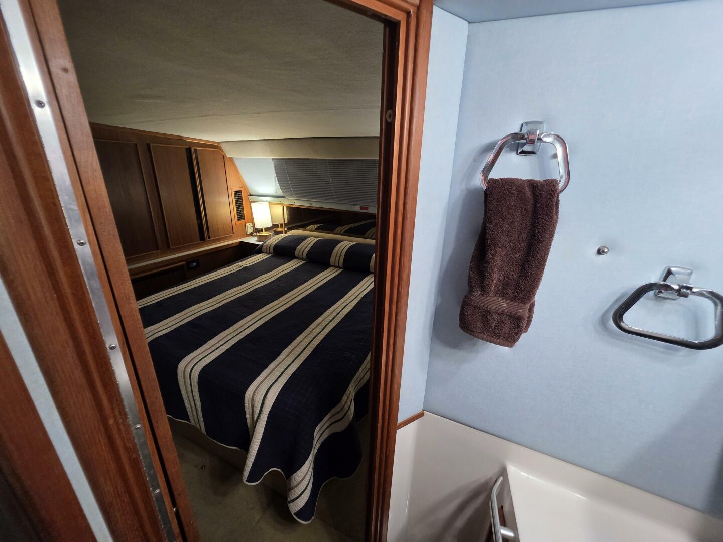 - Master Stateroom (Aft): 74" of head room. Features a walk-around queen bed, a vanity area, and an en-suite head with a private stall shower.