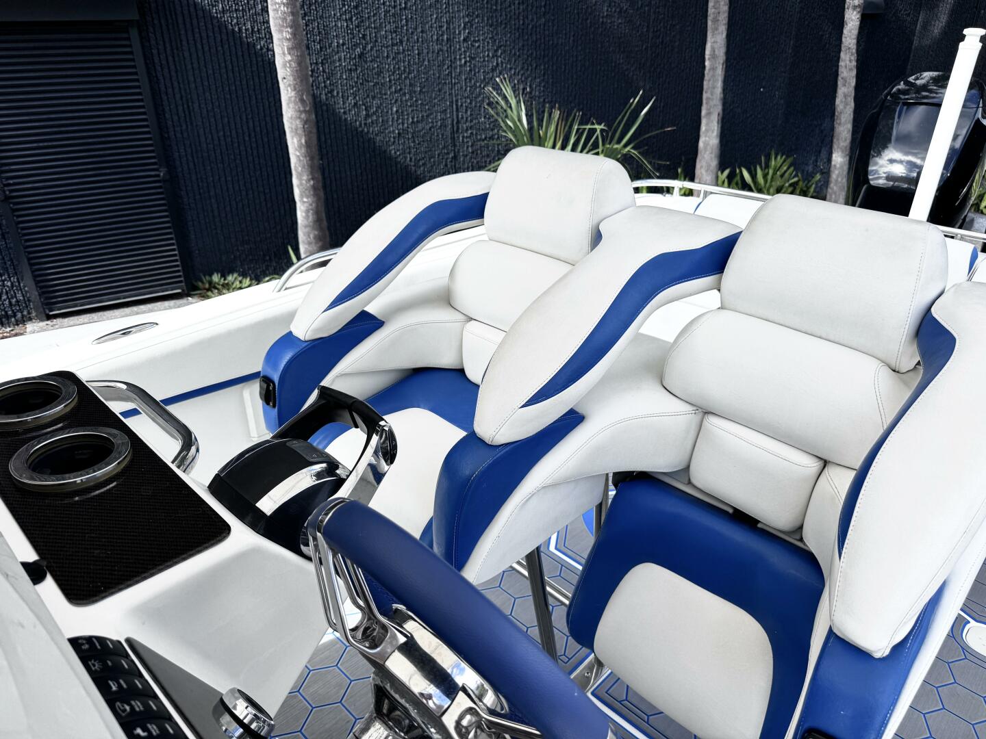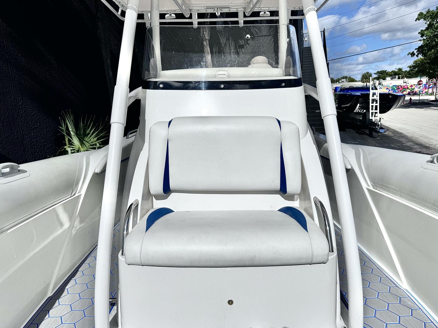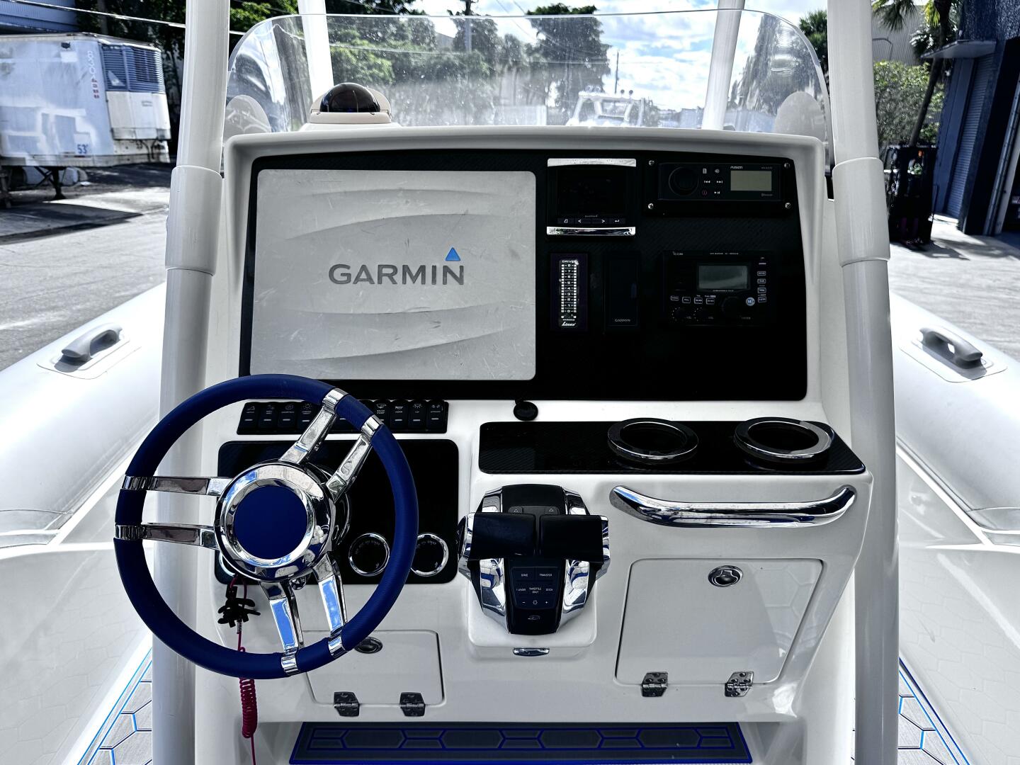Equipped with a 15" Garmin display 8215, fusion head unit, underwater lights, 4” Mercury vessel view, Icom m504 VHF radio, and livorsi drive indicator.