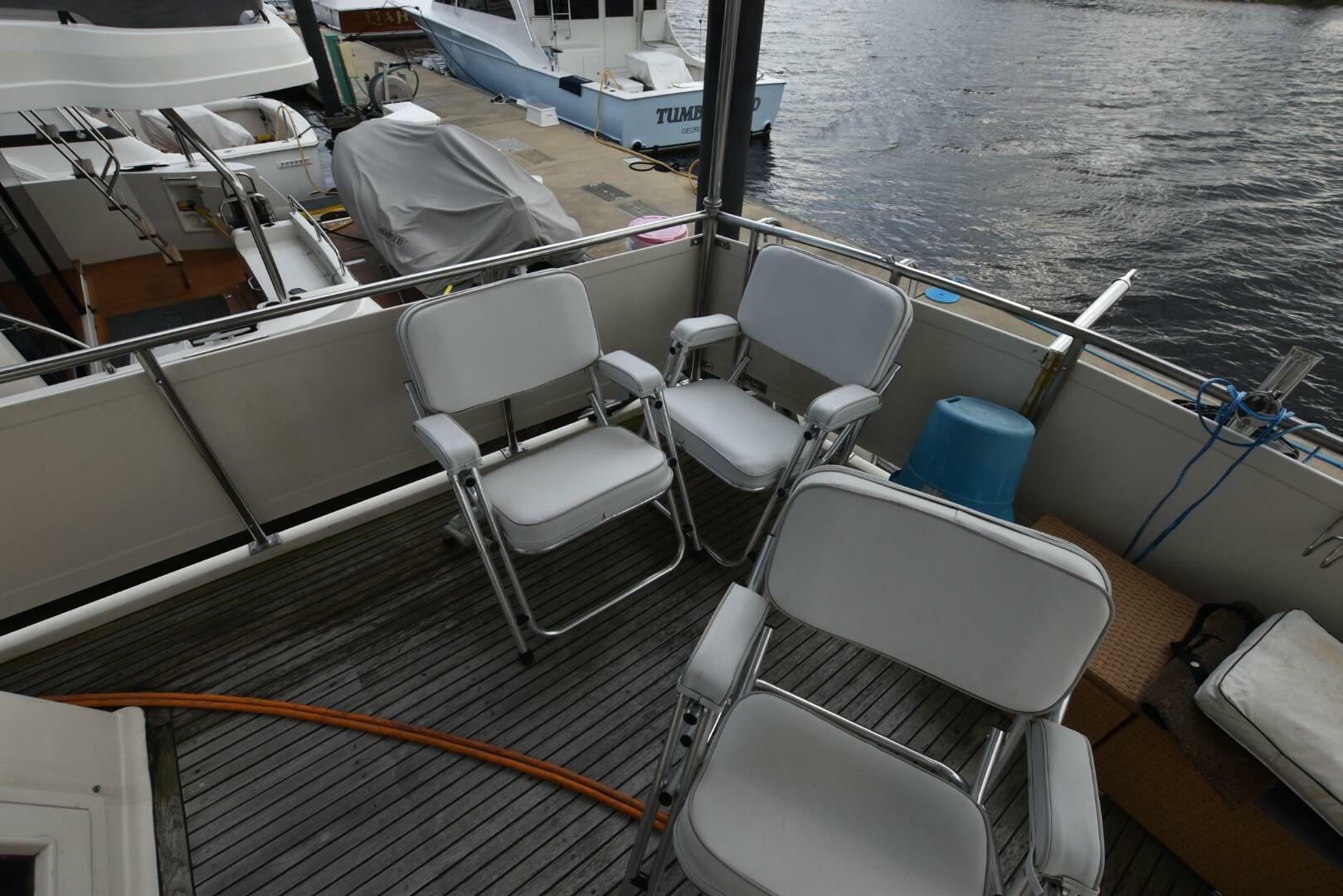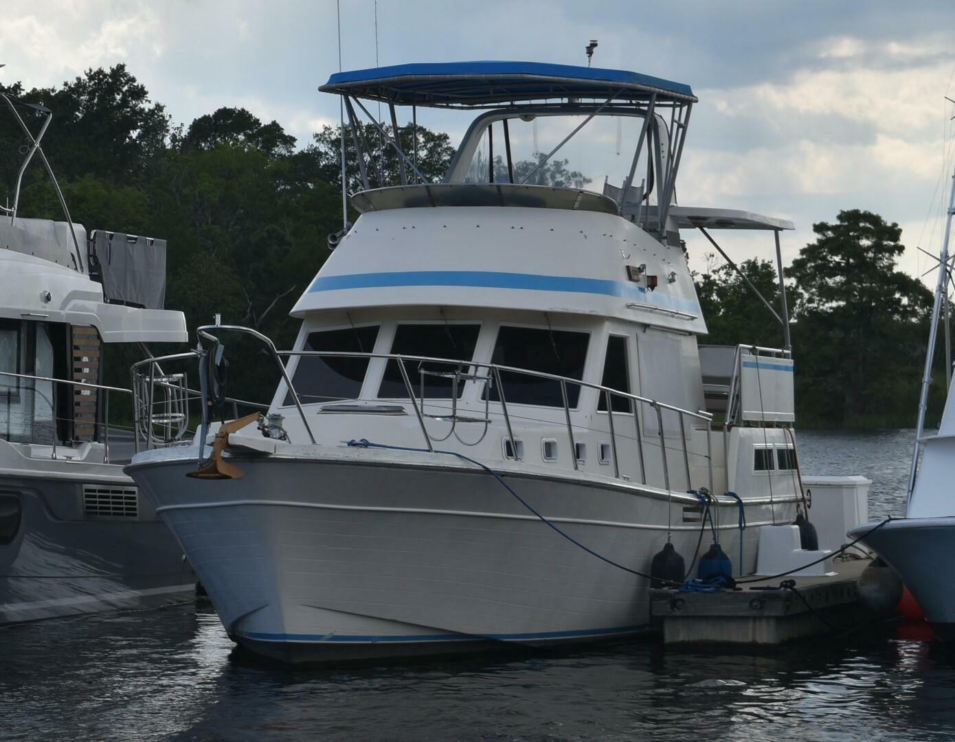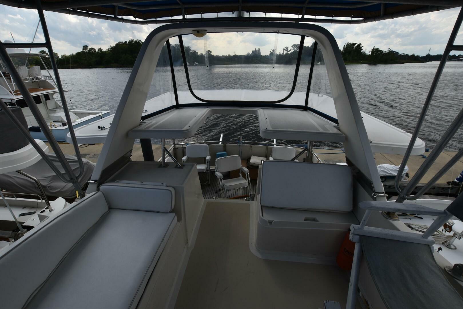As you enter from the dock, there is a side entrance to her cabin on starboard. You can go forward around her deck. Once you get to her aft area you must go up three steps to the aft deck and then up two to the flybridge. You can enter her cabin from either the starboard door or from the aft deck. She has a nice salon with helm forward on starboard and settee on port. Her galley is forward and down. The galley has nice room and been updated with tile back splash and new appliances. On starboard her dinette has been removed and a full sized refrigerator installed. Forward of the galley is her guest stateroom which has a v-berth with filler, locker and head. Aft of the salon she has her master stateroom. It has a full Island Berth with loads of storage on starboard, what seems like a walk-in closet and head on port.
